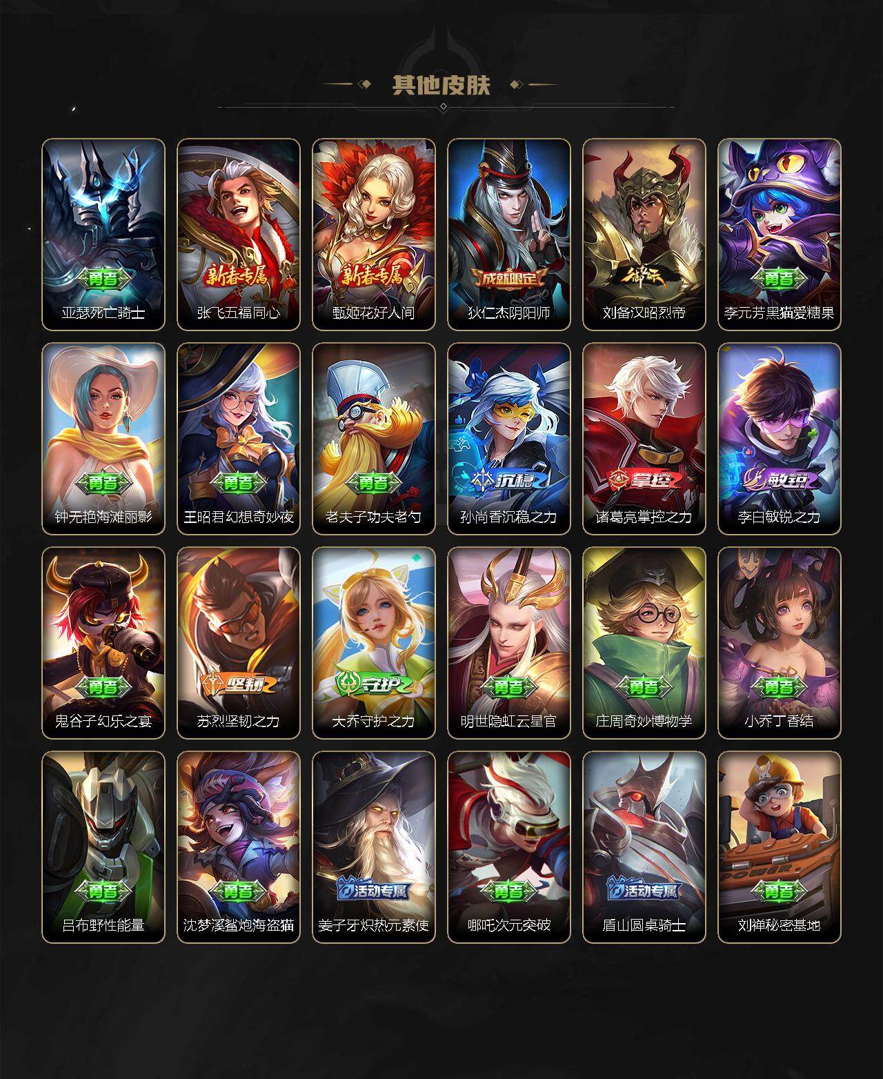 娜可露露晚萤,伽罗箭羽风息,李元芳逐浪之夏,大乔猫狗日记,孙策猫狗日记,阿轲节奏热浪,露娜紫霞仙子,诸葛亮黄金分割率,孙尚香时之恋人,吕布末日机甲,鲁班七号电玩小子,橘右京修罗,嬴政摇滚巨星,刘禅天才门将,安琪拉心灵骇客,程咬金功夫厨神,刘邦德古拉伯爵,兰陵王暗隐猎兽者,曹操幽灵船长,宫本武藏鬼剑武藏,小乔缤纷独角兽,夏侯惇乘风破浪,花木兰水晶猎龙者,墨子金属风暴,貂蝉圣诞恋歌,刘禅电玩·爆裂旋风,赵怀真鹤归松栖,蒙犽百解令,赵怀真器灵·浮梦炉