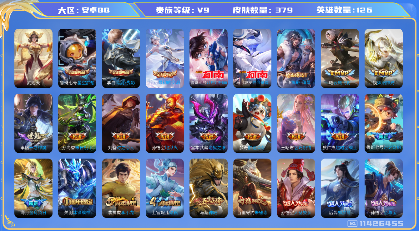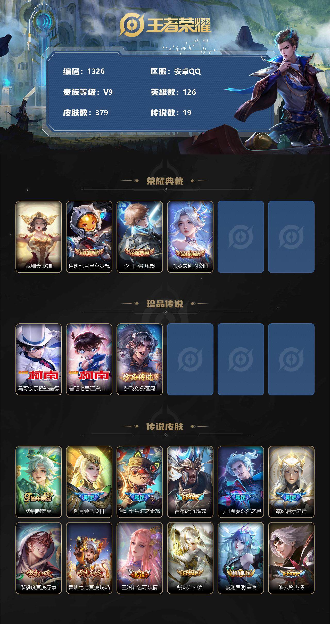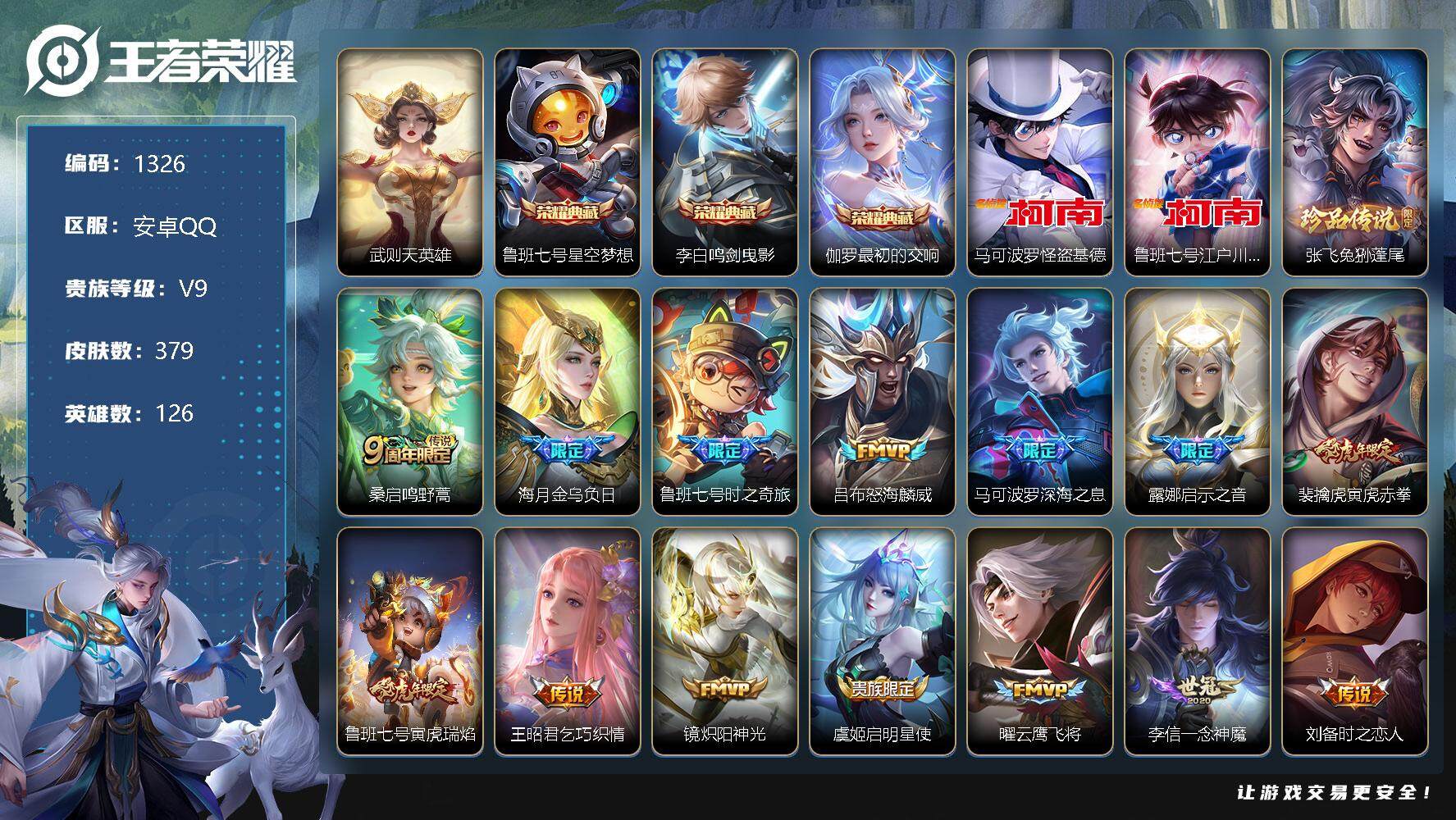 [11426455]【商品标题】:安卓Q-V9-最强王者段位-126英雄-379皮肤-3典藏-0珍品无双-0无双-3珍品传说-19传说-123史诗