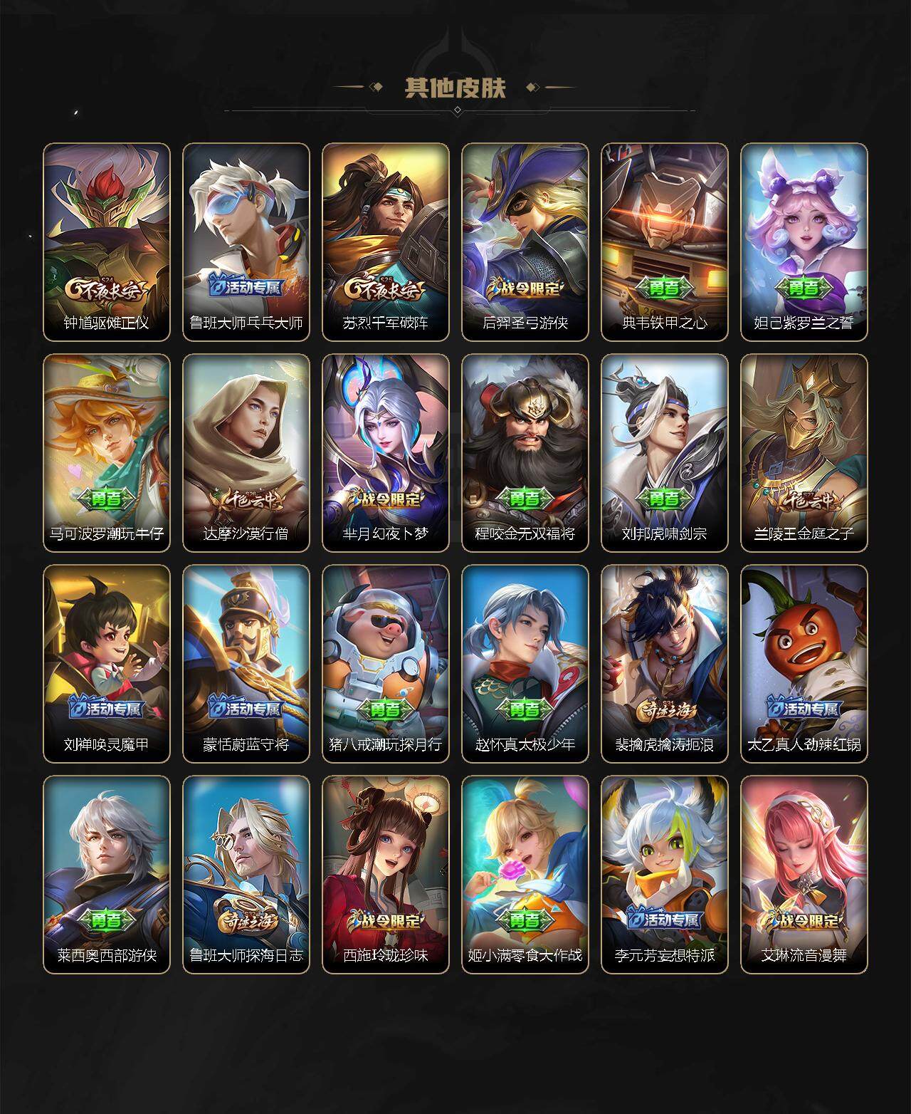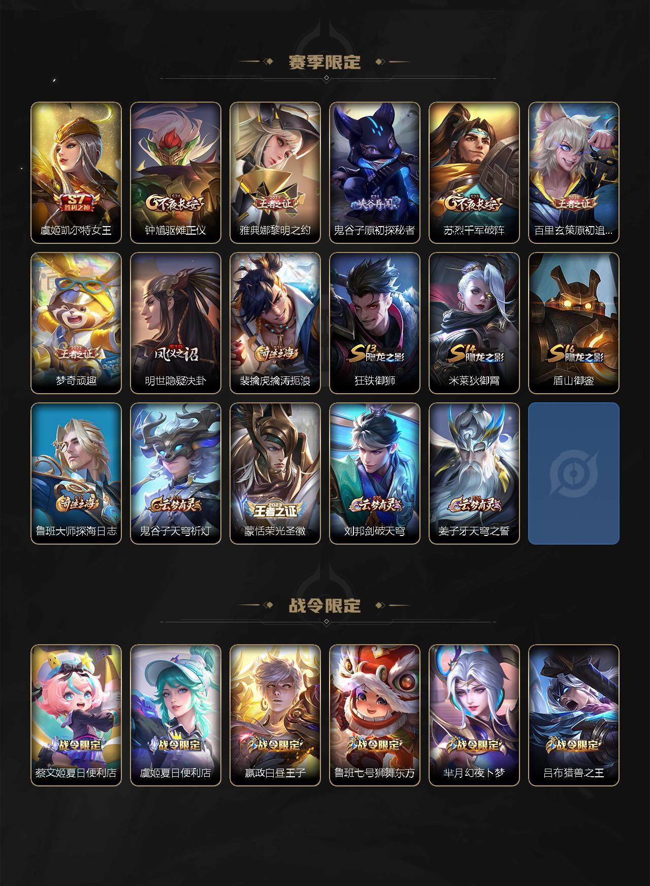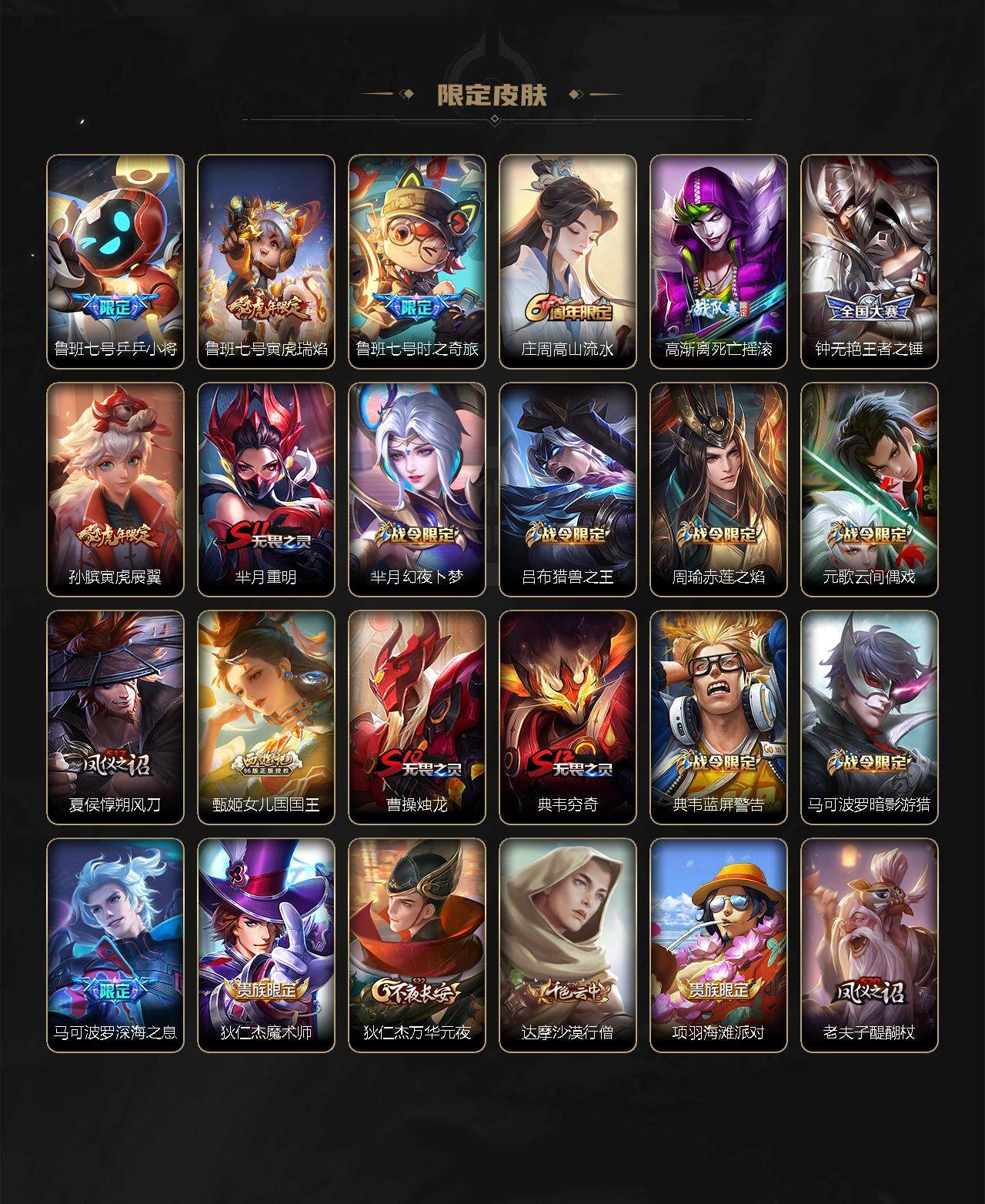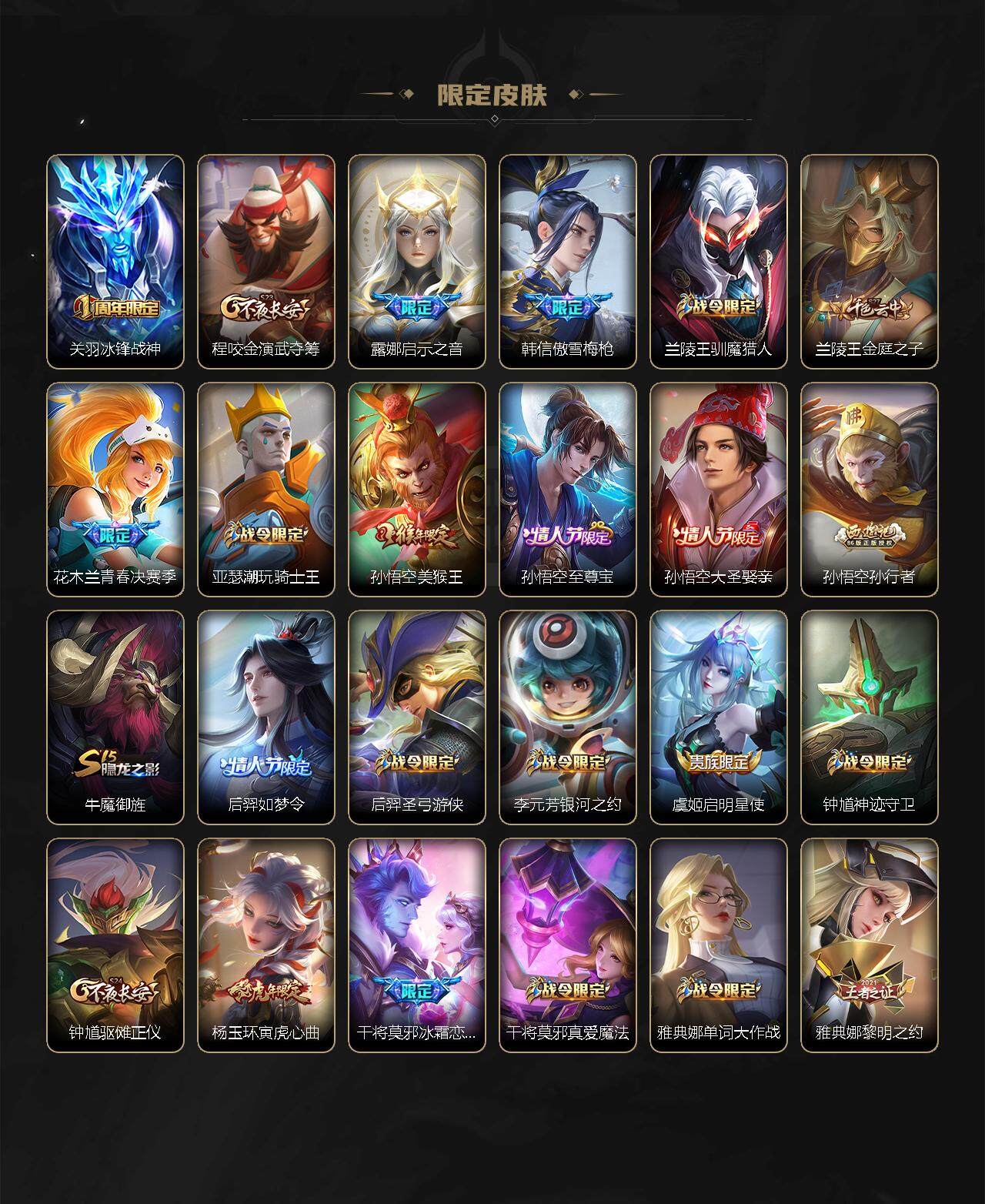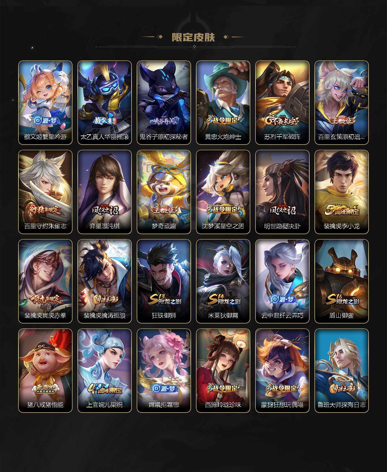【限定皮肤】:白起狰,蒙犽顽岩魄,蔡文姬夏日便利店,虞姬夏日便利店,姜子牙天穹之誓,狄仁杰阴阳师,虞姬凯尔特女王,廉颇寅虎御盾,赵云皇家上将,赵云引擎之心,嬴政白昼王子,鲁班七号狮舞东方,鲁班七号乒乒小将,鲁班七号寅虎瑞焰,鲁班七号时之奇旅,庄周高山流水,高渐离死亡摇滚,钟无艳王者之锤,孙膑寅虎展翼,芈月重明,芈月幻夜卜梦,吕布猎兽之王,周瑜赤莲之焰,元歌云间偶戏,夏侯惇朔风刀,甄姬女儿国国王,曹操烛龙,典韦穷奇,典韦蓝屏警告,马可波罗暗影游猎,马可波罗深海之息,狄仁杰魔术师,狄仁杰万华元夜,达摩沙漠行僧,项羽海滩派对,老夫子醍醐杖,关羽冰锋战神,程咬金演武夺筹,露娜启示之音,韩信傲雪梅枪,兰陵王驯魔猎人,兰陵王金庭之子,花木兰青春决赛季,亚瑟潮玩骑士王,孙悟空美猴王,孙悟空至尊宝,孙悟空大圣娶亲,孙悟空孙行者,牛魔御旌,后羿如梦令,后羿圣弓游侠,李元芳银河之约,虞姬启明星使,钟馗神迹守卫,钟馗驱傩正仪,杨玉环寅虎心曲,干将莫邪冰霜恋舞曲,干将莫邪真爱魔法,雅典娜单词大作战,雅典娜黎明之约,蔡文姬繁星吟游,太乙真人华丽摇滚,鬼谷子原初探秘者,黄忠火炮绅士,苏烈千军破阵,百里玄策原初追逐者,百里守约朱雀志,弈星混沌棋,梦奇顽趣,沈梦溪星空之诺,明世隐疑决卦,裴擒虎李小龙,裴擒虎寅虎赤拳,裴擒虎擒涛扼浪,狂铁御狮,米莱狄御霄,云中君纤云弄巧,盾山御銮,猪八戒猪悟能,上官婉儿梁祝,嫦娥拒霜思,西施玲珑珍味,蒙犽狂想玩偶喵,鲁班大师探海日志,镜匿光追影者,戈娅驭风魔法,艾琳女武神,艾琳流音漫舞,司空震地狱燃心,张良古海寻踪,蒙犽百解令,蒙恬荣光圣徽,高渐离燃音魔法,妲己灵卜魔法,鬼谷子天穹祈灯,姬小满妄想食味,沈梦