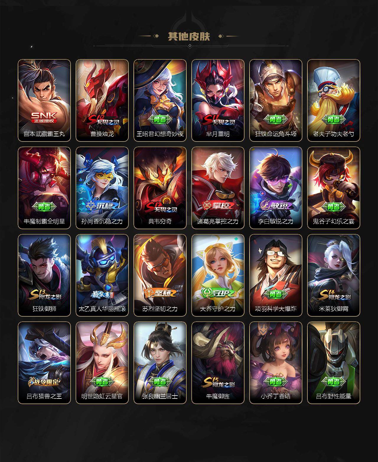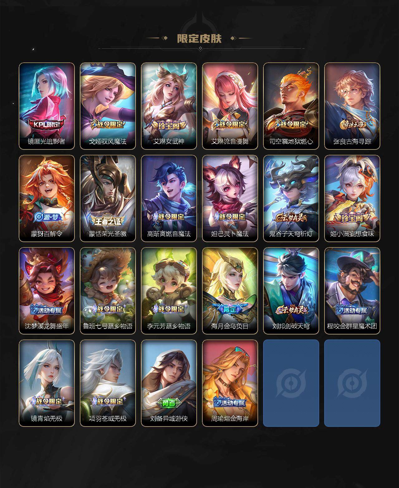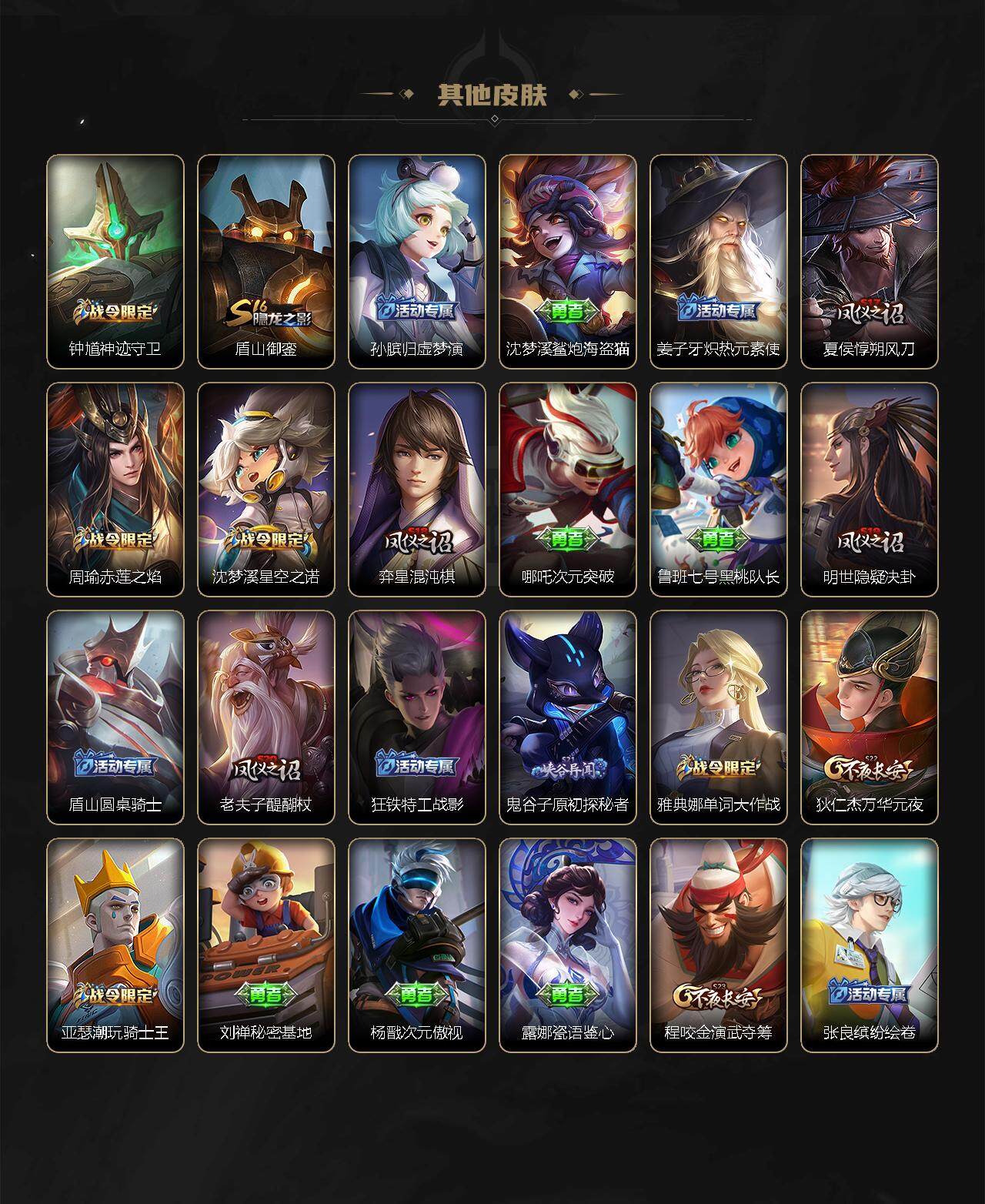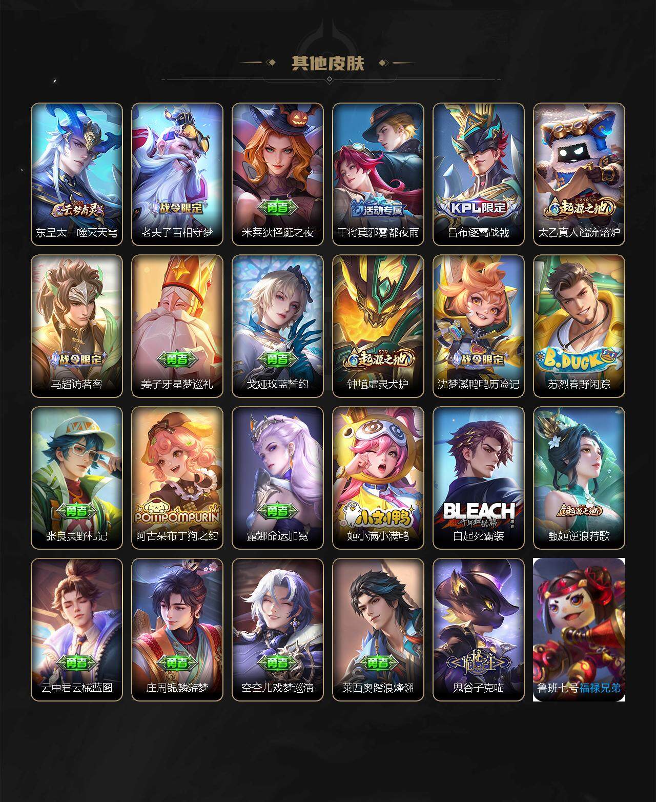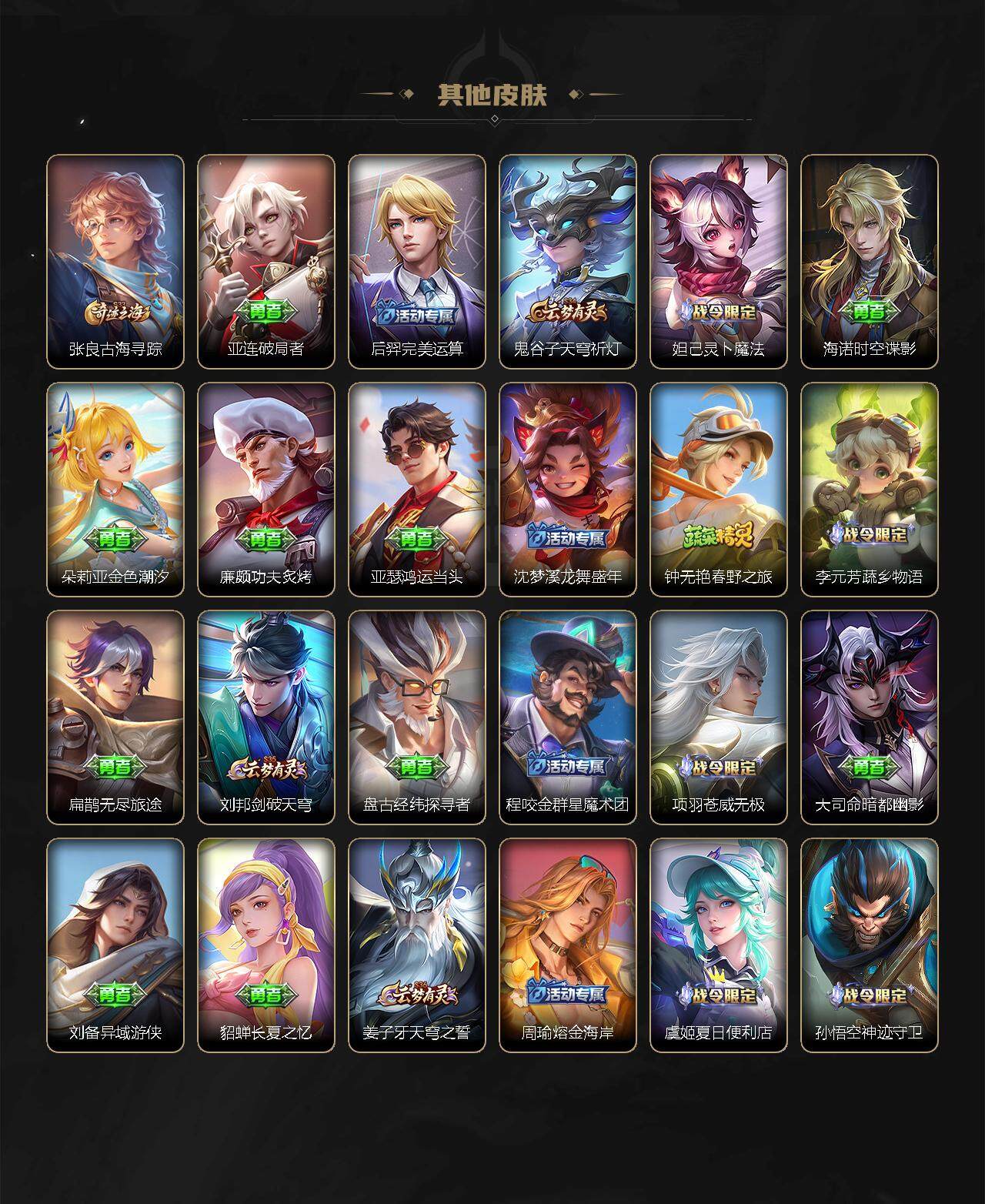 【限定皮肤】:白起狰,蒙犽顽岩魄,蔡文姬夏日便利店,虞姬夏日便利店,姜子牙天穹之誓,狄仁杰阴阳师,虞姬凯尔特女王,廉颇寅虎御盾,赵云皇家上将,赵云引擎之心,嬴政白昼王子,鲁班七号狮舞东方,鲁班七号乒乒小将,鲁班七号寅虎瑞焰,鲁班七号时之奇旅,庄周高山流水,高渐离死亡摇滚,钟无艳王者之锤,孙膑寅虎展翼,芈月重明,芈月幻夜卜梦,吕布猎兽之王,周瑜赤莲之焰,元歌云间偶戏,夏侯惇朔风刀,甄姬女儿国国王,曹操烛龙,典韦穷奇,典韦蓝屏警告,马可波罗暗影游猎,马可波罗深海之息,狄仁杰魔术师,狄仁杰万华元夜,达摩沙漠行僧,项羽海滩派对,老夫子醍醐杖,关羽冰锋战神,程咬金演武夺筹,露娜启示之音,韩信傲雪梅枪,兰陵王驯魔猎人,兰陵王金庭之子,花木兰青春决赛季,亚瑟潮玩骑士王,孙悟空美猴王,孙悟空至尊宝,孙悟空大圣娶亲,孙悟空孙行者,牛魔御旌,后羿如梦令,后羿圣弓游侠,李元芳银河之约,虞姬启明星使,钟馗神迹守卫,钟馗驱傩正仪,杨玉环寅虎心曲,干将莫邪冰霜恋舞曲,干将莫邪真爱魔法,雅典娜单词大作战,雅典娜黎明之约,蔡文姬繁星吟游,太乙真人华丽摇滚,鬼谷子原初探秘者,黄忠火炮绅士,苏烈千军破阵,百里玄策原初追逐者,百里守约朱雀志,弈星混沌棋,梦奇顽趣,沈梦溪星空之诺,明世隐疑决卦,裴擒虎李小龙,裴擒虎寅虎赤拳,裴擒虎擒涛扼浪,狂铁御狮,米莱狄御霄,云中君纤云弄巧,盾山御銮,猪八戒猪悟能,上官婉儿梁祝,嫦娥拒霜思,西施玲珑珍味,蒙犽狂想玩偶喵,鲁班大师探海日志,镜匿光追影者,戈娅驭风魔法,艾琳女武神,艾琳流音漫舞,司空震地狱燃心,张良古海寻踪,蒙犽百解令,蒙恬荣光圣徽,高渐离燃音魔法,妲己灵卜魔法,鬼谷子天穹祈灯,姬小满妄想食味,沈梦
