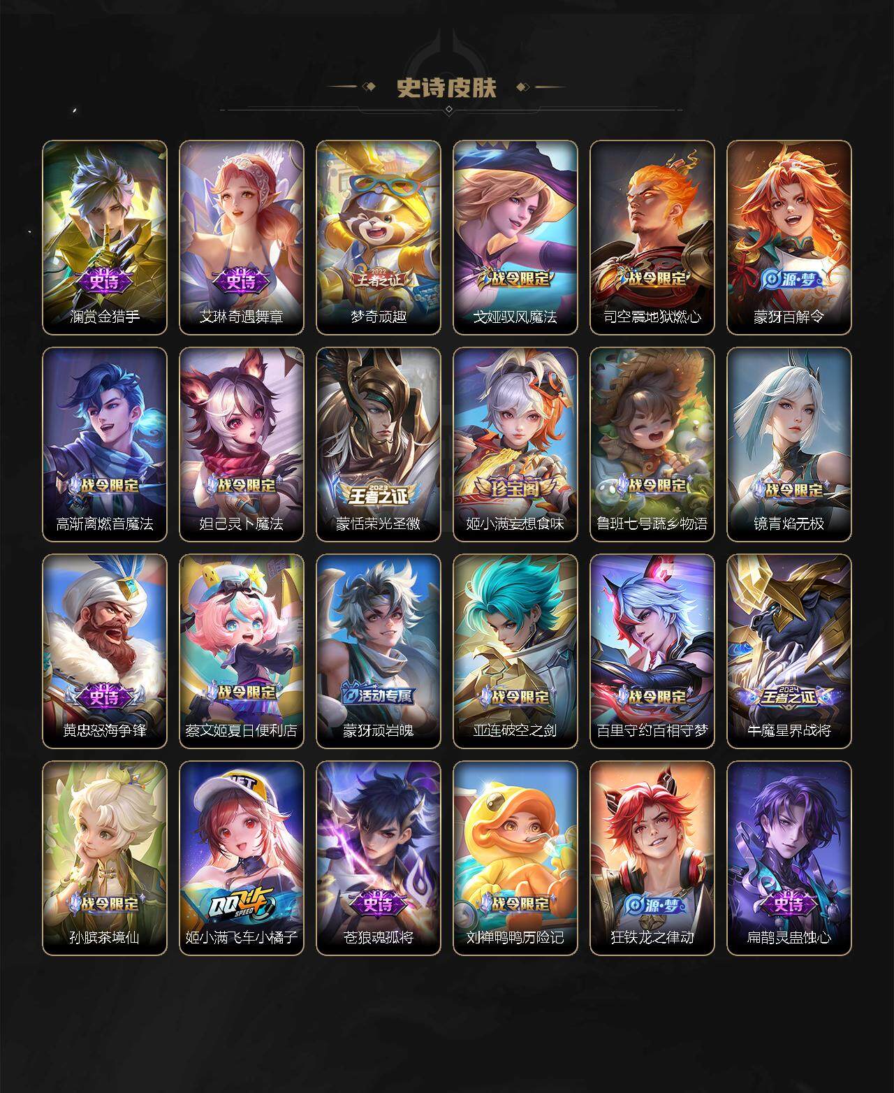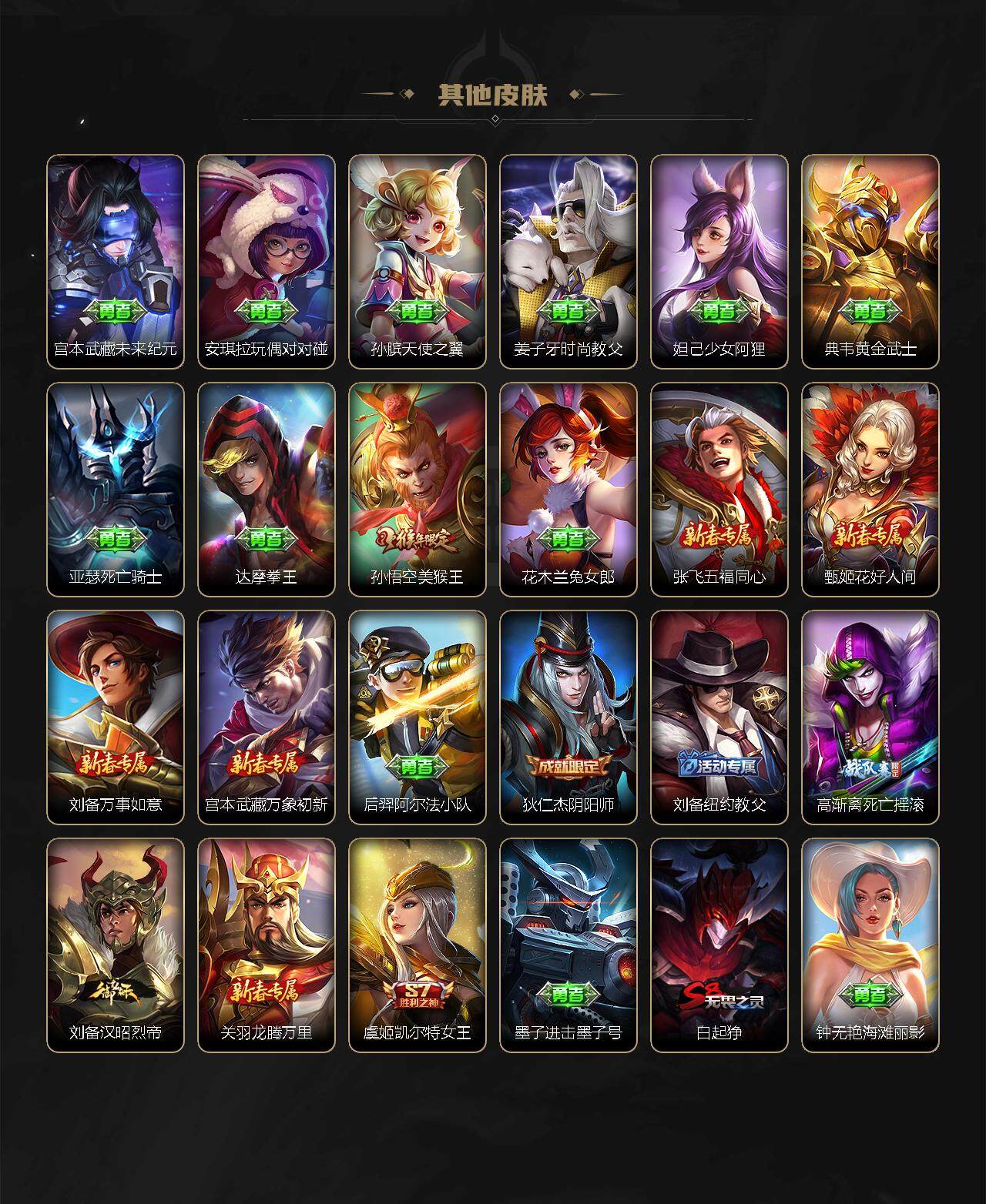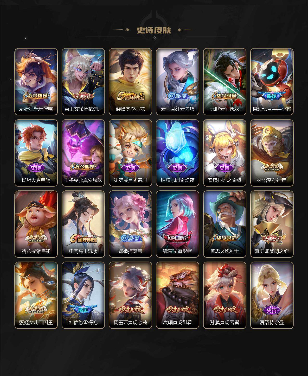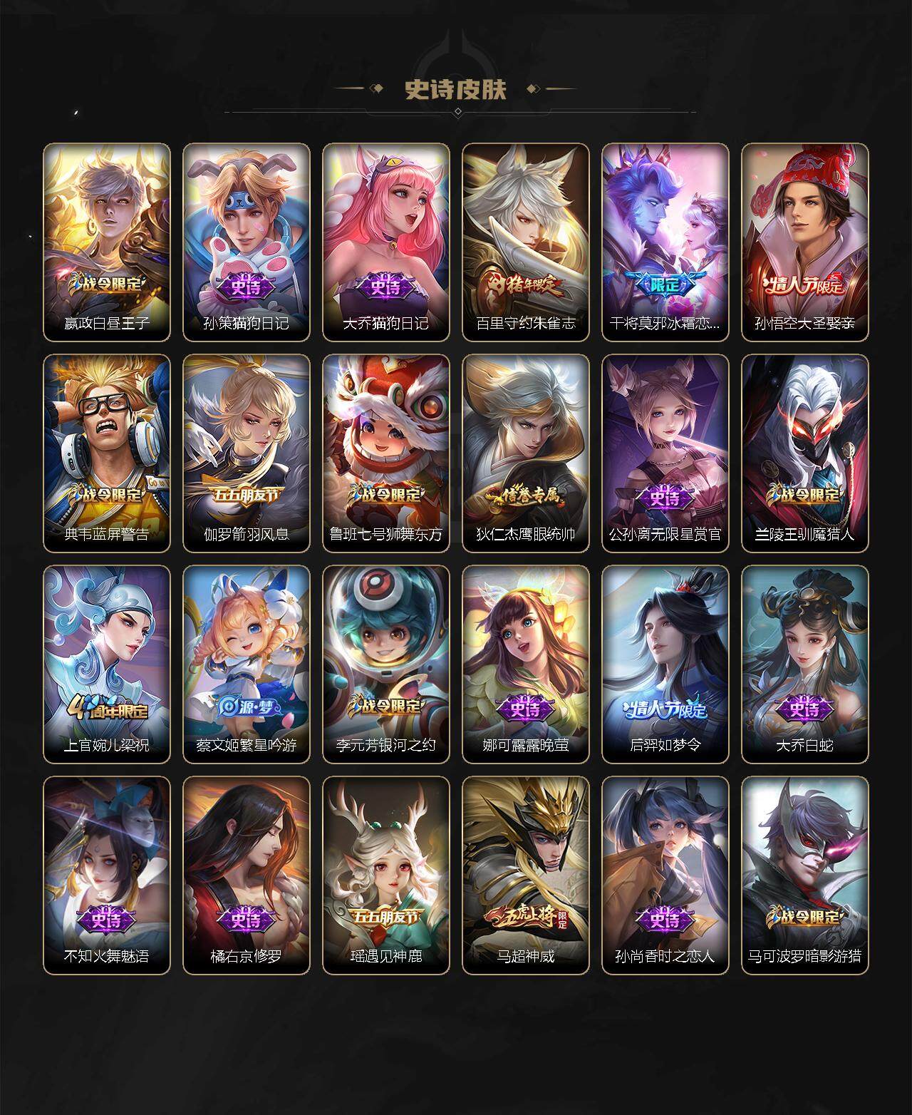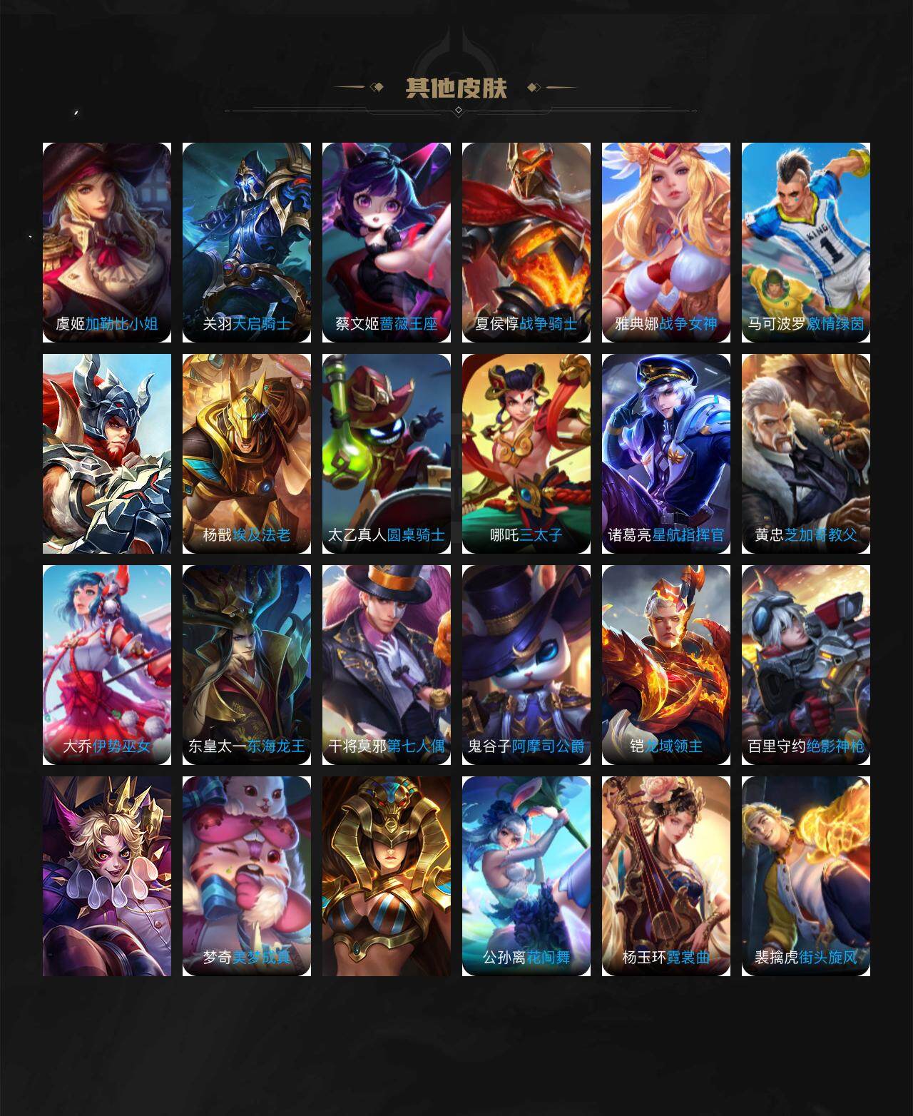 【限定皮肤】:白起狰,蒙犽顽岩魄,蔡文姬夏日便利店,虞姬夏日便利店,姜子牙天穹之誓,狄仁杰阴阳师,虞姬凯尔特女王,廉颇寅虎御盾,赵云皇家上将,赵云引擎之心,嬴政白昼王子,鲁班七号狮舞东方,鲁班七号乒乒小将,鲁班七号寅虎瑞焰,鲁班七号时之奇旅,庄周高山流水,高渐离死亡摇滚,钟无艳王者之锤,孙膑寅虎展翼,芈月重明,芈月幻夜卜梦,吕布猎兽之王,周瑜赤莲之焰,元歌云间偶戏,夏侯惇朔风刀,甄姬女儿国国王,曹操烛龙,典韦穷奇,典韦蓝屏警告,马可波罗暗影游猎,马可波罗深海之息,狄仁杰魔术师,狄仁杰万华元夜,达摩沙漠行僧,项羽海滩派对,老夫子醍醐杖,关羽冰锋战神,程咬金演武夺筹,露娜启示之音,韩信傲雪梅枪,兰陵王驯魔猎人,兰陵王金庭之子,花木兰青春决赛季,亚瑟潮玩骑士王,孙悟空美猴王,孙悟空至尊宝,孙悟空大圣娶亲,孙悟空孙行者,牛魔御旌,后羿如梦令,后羿圣弓游侠,李元芳银河之约,虞姬启明星使,钟馗神迹守卫,钟馗驱傩正仪,杨玉环寅虎心曲,干将莫邪冰霜恋舞曲,干将莫邪真爱魔法,雅典娜单词大作战,雅典娜黎明之约,蔡文姬繁星吟游,太乙真人华丽摇滚,鬼谷子原初探秘者,黄忠火炮绅士,苏烈千军破阵,百里玄策原初追逐者,百里守约朱雀志,弈星混沌棋,梦奇顽趣,沈梦溪星空之诺,明世隐疑决卦,裴擒虎李小龙,裴擒虎寅虎赤拳,裴擒虎擒涛扼浪,狂铁御狮,米莱狄御霄,云中君纤云弄巧,盾山御銮,猪八戒猪悟能,上官婉儿梁祝,嫦娥拒霜思,西施玲珑珍味,蒙犽狂想玩偶喵,鲁班大师探海日志,镜匿光追影者,戈娅驭风魔法,艾琳女武神,艾琳流音漫舞,司空震地狱燃心,张良古海寻踪,蒙犽百解令,蒙恬荣光圣徽,高渐离燃音魔法,妲己灵卜魔法,鬼谷子天穹祈灯,姬小满妄想食味,沈梦