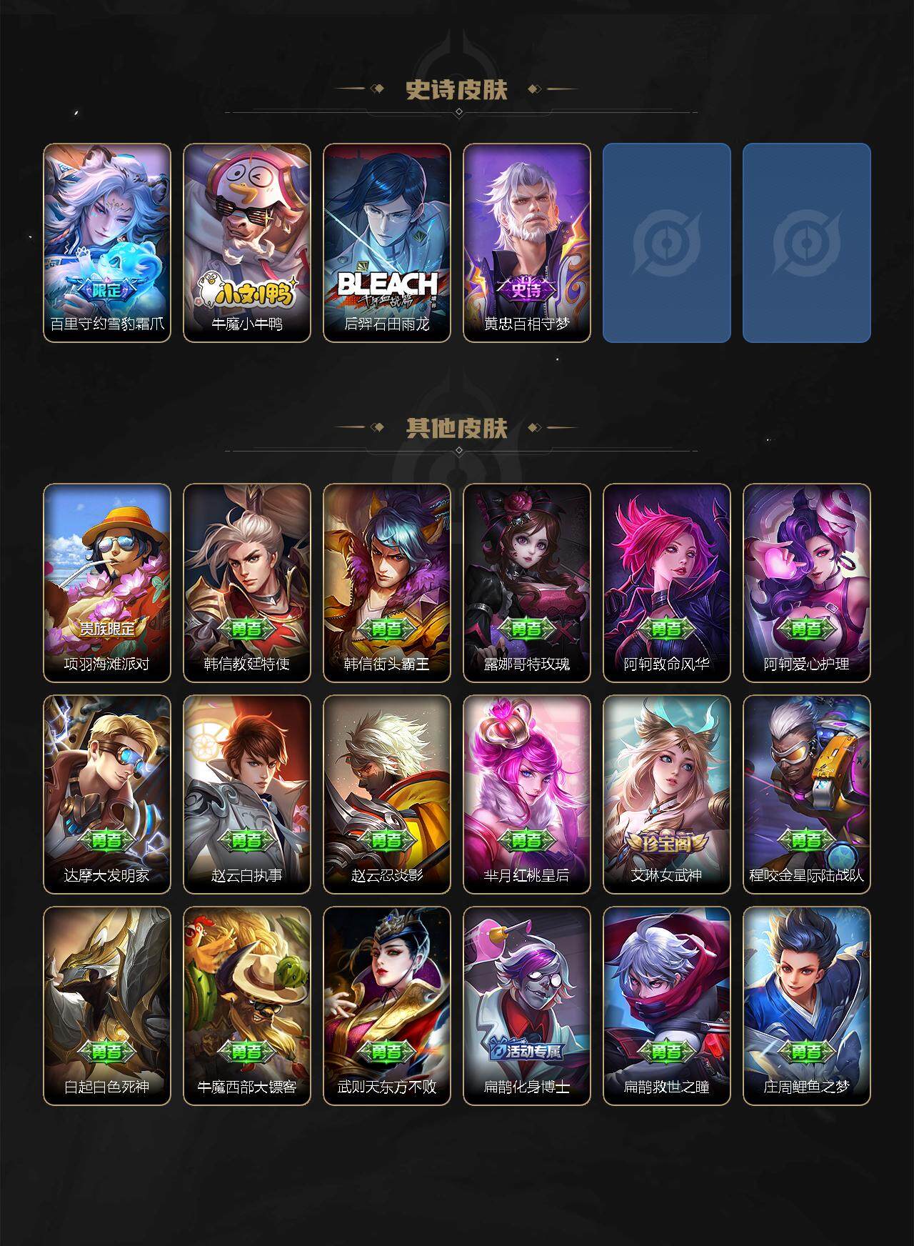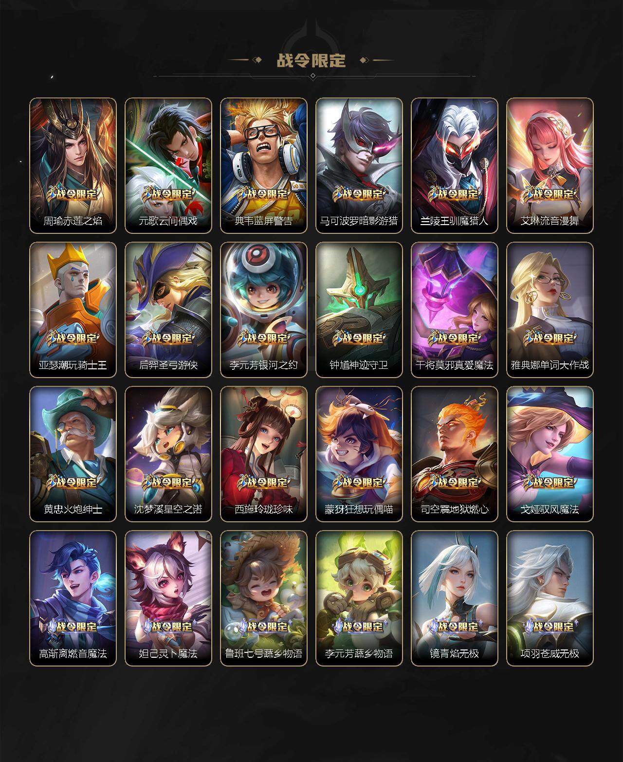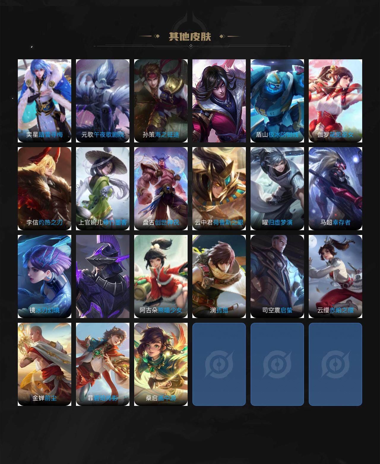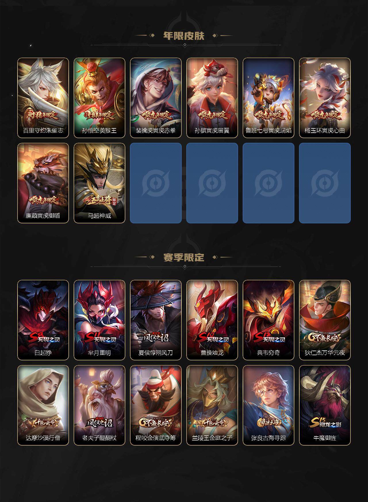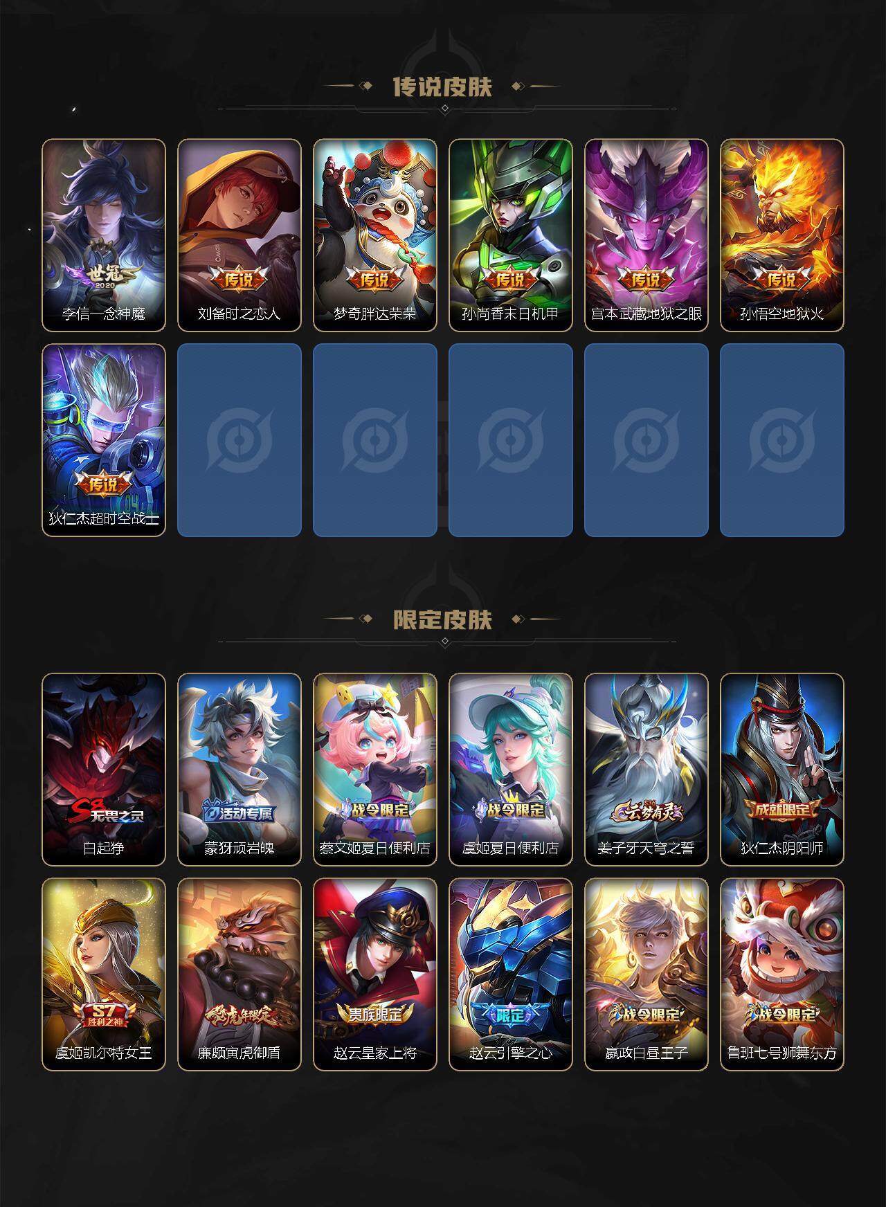 【限定皮肤】:白起狰,蒙犽顽岩魄,蔡文姬夏日便利店,虞姬夏日便利店,姜子牙天穹之誓,狄仁杰阴阳师,虞姬凯尔特女王,廉颇寅虎御盾,赵云皇家上将,赵云引擎之心,嬴政白昼王子,鲁班七号狮舞东方,鲁班七号乒乒小将,鲁班七号寅虎瑞焰,鲁班七号时之奇旅,庄周高山流水,高渐离死亡摇滚,钟无艳王者之锤,孙膑寅虎展翼,芈月重明,芈月幻夜卜梦,吕布猎兽之王,周瑜赤莲之焰,元歌云间偶戏,夏侯惇朔风刀,甄姬女儿国国王,曹操烛龙,典韦穷奇,典韦蓝屏警告,马可波罗暗影游猎,马可波罗深海之息,狄仁杰魔术师,狄仁杰万华元夜,达摩沙漠行僧,项羽海滩派对,老夫子醍醐杖,关羽冰锋战神,程咬金演武夺筹,露娜启示之音,韩信傲雪梅枪,兰陵王驯魔猎人,兰陵王金庭之子,花木兰青春决赛季,亚瑟潮玩骑士王,孙悟空美猴王,孙悟空至尊宝,孙悟空大圣娶亲,孙悟空孙行者,牛魔御旌,后羿如梦令,后羿圣弓游侠,李元芳银河之约,虞姬启明星使,钟馗神迹守卫,钟馗驱傩正仪,杨玉环寅虎心曲,干将莫邪冰霜恋舞曲,干将莫邪真爱魔法,雅典娜单词大作战,雅典娜黎明之约,蔡文姬繁星吟游,太乙真人华丽摇滚,鬼谷子原初探秘者,黄忠火炮绅士,苏烈千军破阵,百里玄策原初追逐者,百里守约朱雀志,弈星混沌棋,梦奇顽趣,沈梦溪星空之诺,明世隐疑决卦,裴擒虎李小龙,裴擒虎寅虎赤拳,裴擒虎擒涛扼浪,狂铁御狮,米莱狄御霄,云中君纤云弄巧,盾山御銮,猪八戒猪悟能,上官婉儿梁祝,嫦娥拒霜思,西施玲珑珍味,蒙犽狂想玩偶喵,鲁班大师探海日志,镜匿光追影者,戈娅驭风魔法,艾琳女武神,艾琳流音漫舞,司空震地狱燃心,张良古海寻踪,蒙犽百解令,蒙恬荣光圣徽,高渐离燃音魔法,妲己灵卜魔法,鬼谷子天穹祈灯,姬小满妄想食味,沈梦