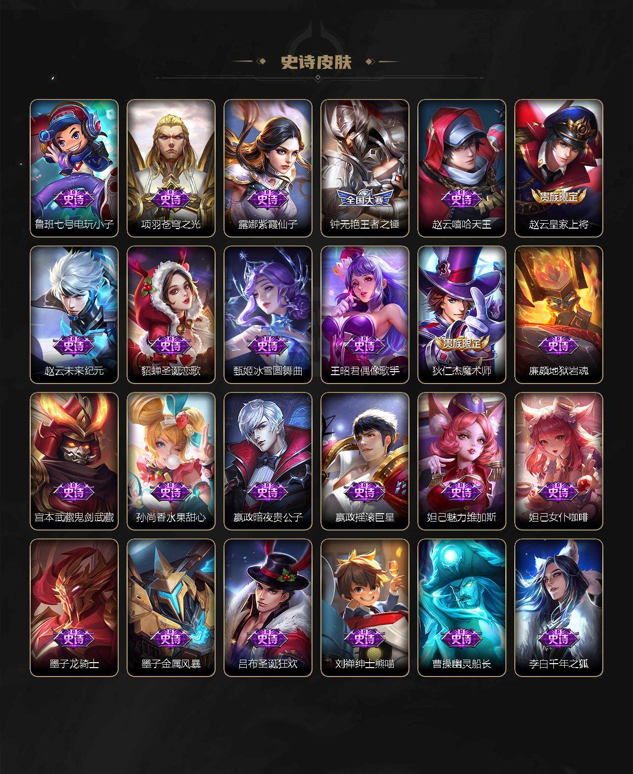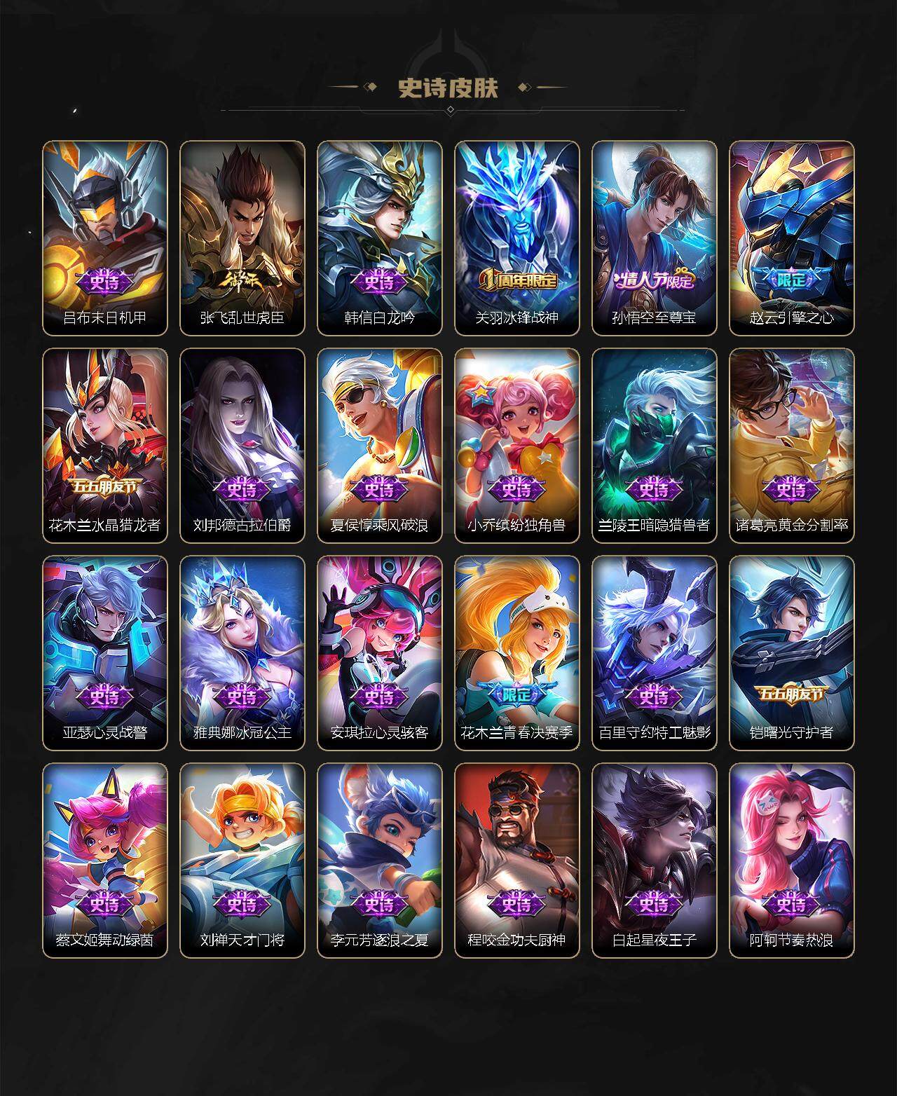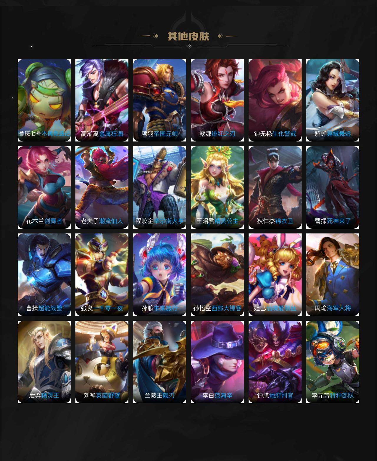 虞姬凯尔特女王,白起狰,曹操烛龙,芈月重明,典韦穷奇,狂铁御狮,米莱狄御霄,牛魔御旌,盾山御銮,夏侯惇朔风刀,明世隐疑决卦,老夫子醍醐杖,鬼谷子原初探秘者,狄仁杰万华元夜,程咬金演武夺筹,钟馗驱傩正仪,苏烈千军破阵,吕布猎兽之王,嬴政白昼王子,典韦蓝屏警告,钟馗神迹守卫,鲁班七号狮舞东方,沈梦溪星空之诺,李元芳银河之约,马可波罗暗影游猎,蒙犽狂想玩偶喵,元歌云间偶戏,弈星混沌棋,达摩沙漠行僧,兰陵王金庭之子,裴擒虎擒涛扼浪,鲁班大师探海日志,张良古海寻踪,项羽苍威无极,镜青焰无极