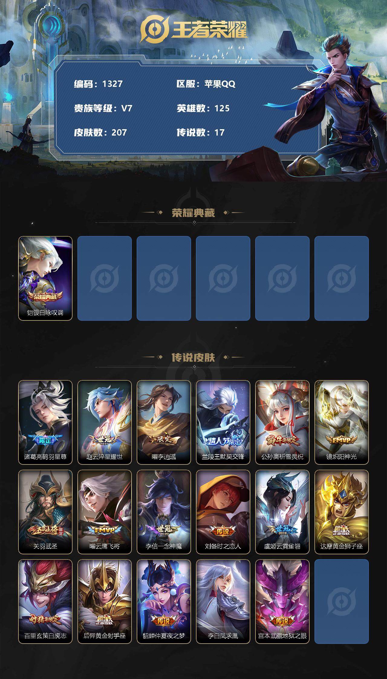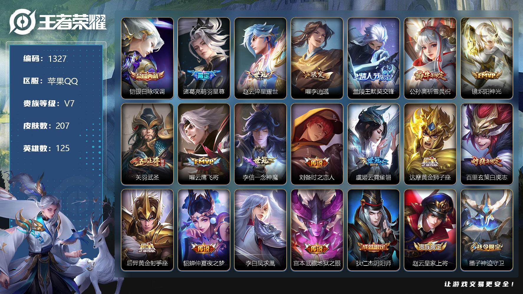 [11426493]【商品标题】:苹果Q-V4-最强王者段位-125英雄-207皮肤-1典藏-0珍品无双-0无双-0珍品传说-17传说-68史诗