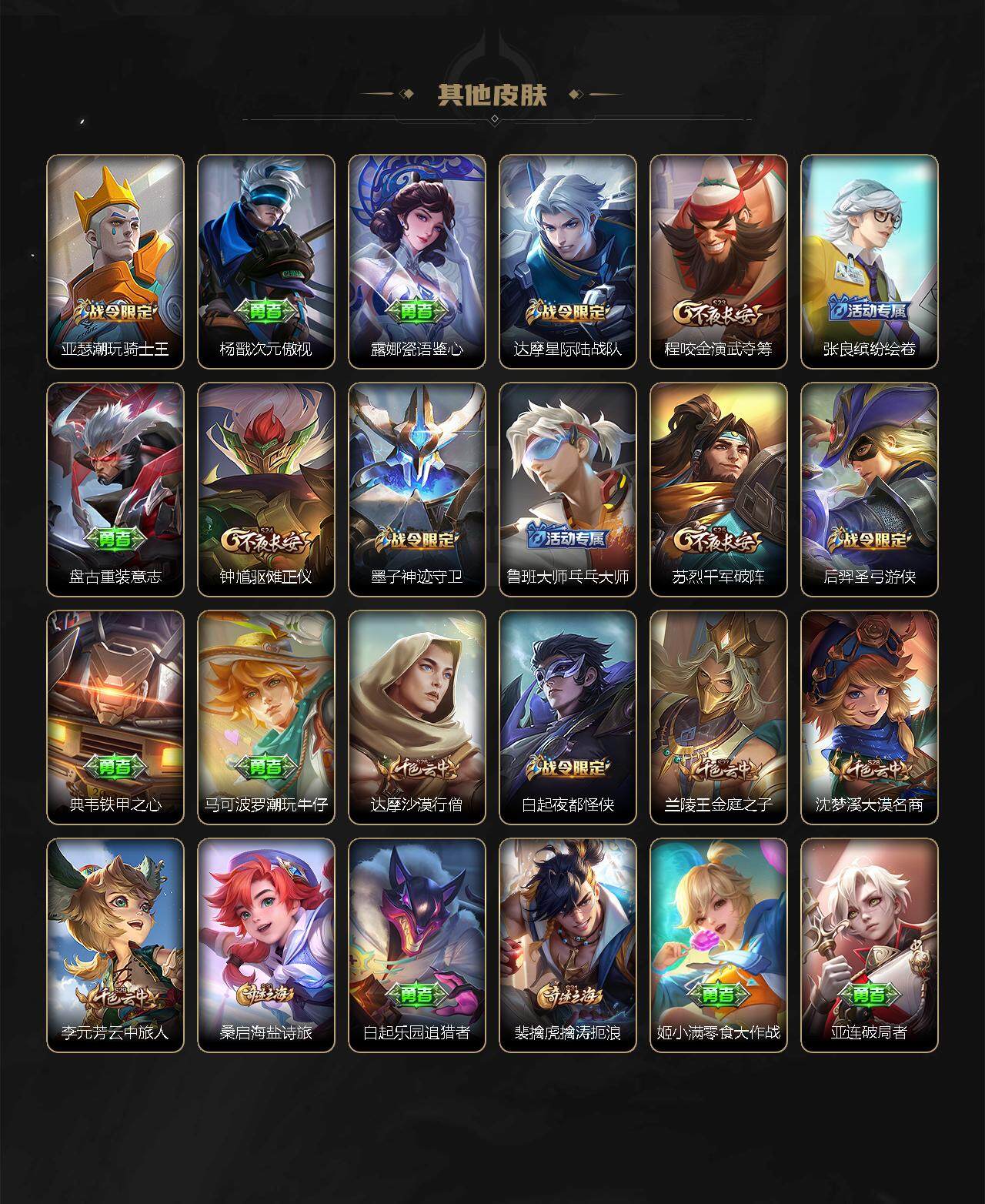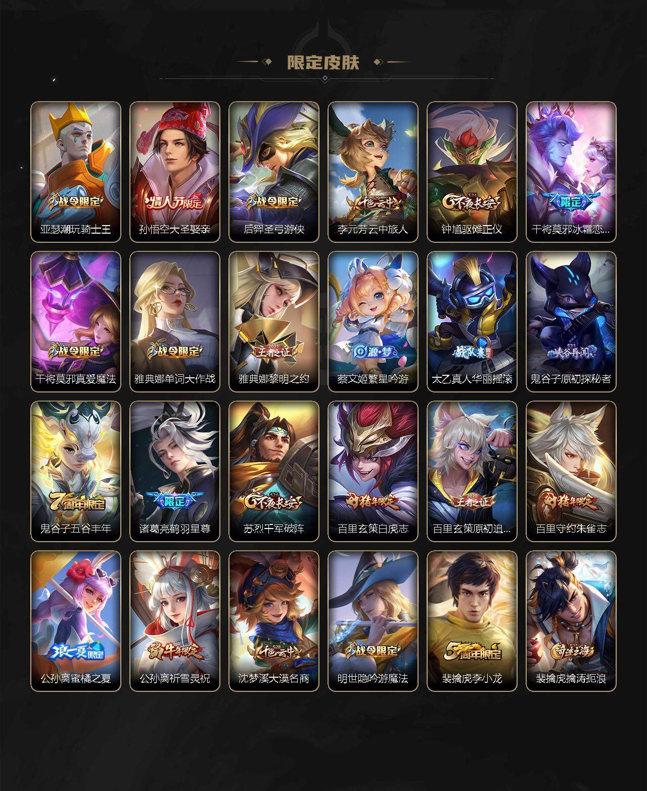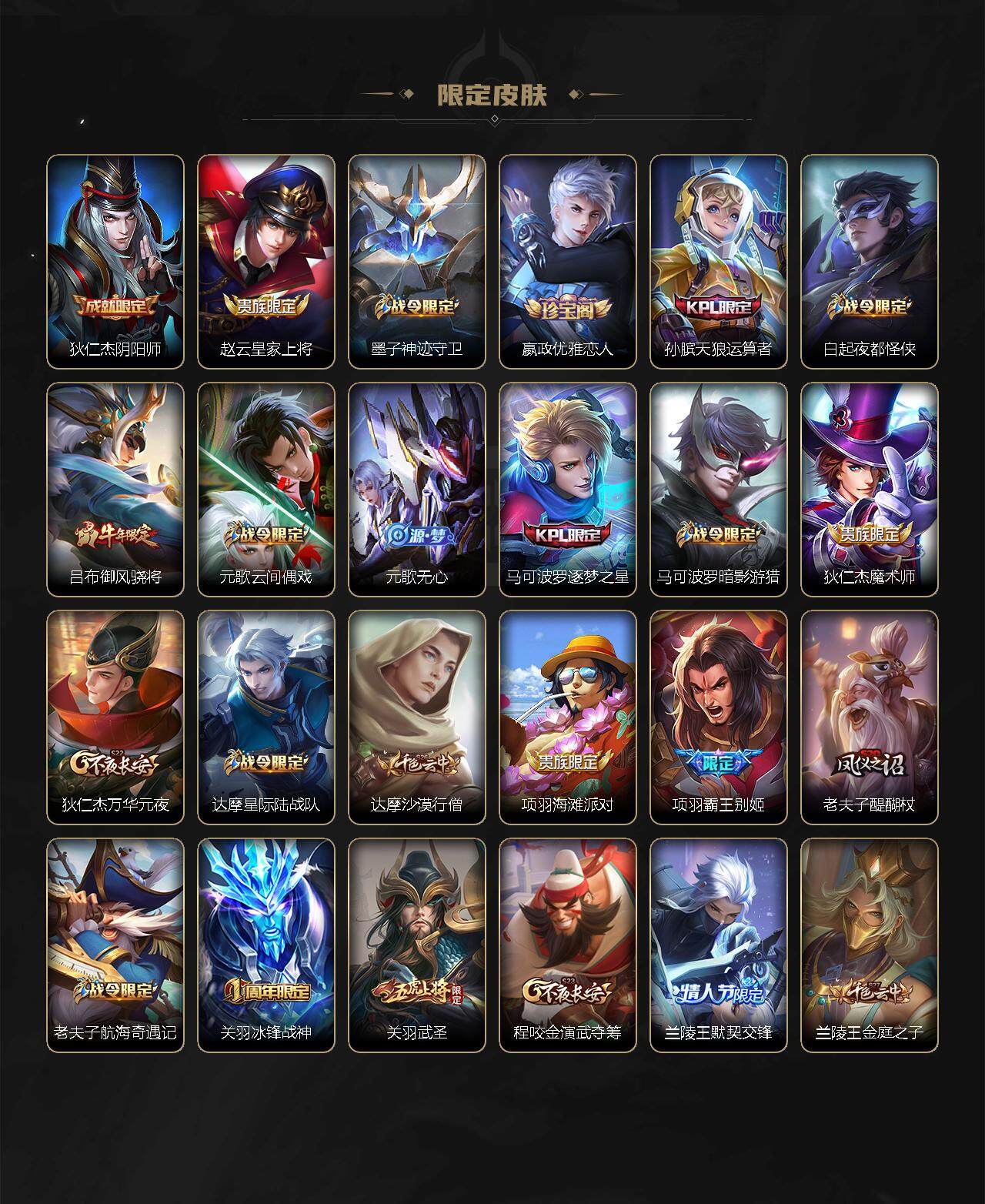 【限定皮肤】:狄仁杰阴阳师,赵云皇家上将,墨子神迹守卫,嬴政优雅恋人,孙膑天狼运算者,白起夜都怪侠,吕布御风骁将,元歌云间偶戏,元歌无心,马可波罗逐梦之星,马可波罗暗影游猎,狄仁杰魔术师,狄仁杰万华元夜,达摩星际陆战队,达摩沙漠行僧,项羽海滩派对,项羽霸王别姬,老夫子醍醐杖,老夫子航海奇遇记,关羽冰锋战神,关羽武圣,程咬金演武夺筹,兰陵王默契交锋,兰陵王金庭之子,亚瑟潮玩骑士王,孙悟空大圣娶亲,后羿圣弓游侠,李元芳云中旅人,钟馗驱傩正仪,干将莫邪冰霜恋舞曲,干将莫邪真爱魔法,雅典娜单词大作战,雅典娜黎明之约,蔡文姬繁星吟游,太乙真人华丽摇滚,鬼谷子原初探秘者,鬼谷子五谷丰年,诸葛亮鹤羽星尊,苏烈千军破阵,百里玄策白虎志,百里玄策原初追逐者,百里守约朱雀志,公孙离蜜橘之夏,公孙离祈雪灵祝,沈梦溪大漠名商,明世隐吟游魔法,裴擒虎李小龙,裴擒虎擒涛扼浪,米莱狄胡桃异想国,云中君纤云弄巧,伽罗天狼溯光者,猪八戒西部大镖客,曜李逍遥 ,蒙犽狂想玩偶喵,桑启海盐诗旅,暃星界游侠,鬼谷子天穹祈灯,沈梦溪龙舞盛年