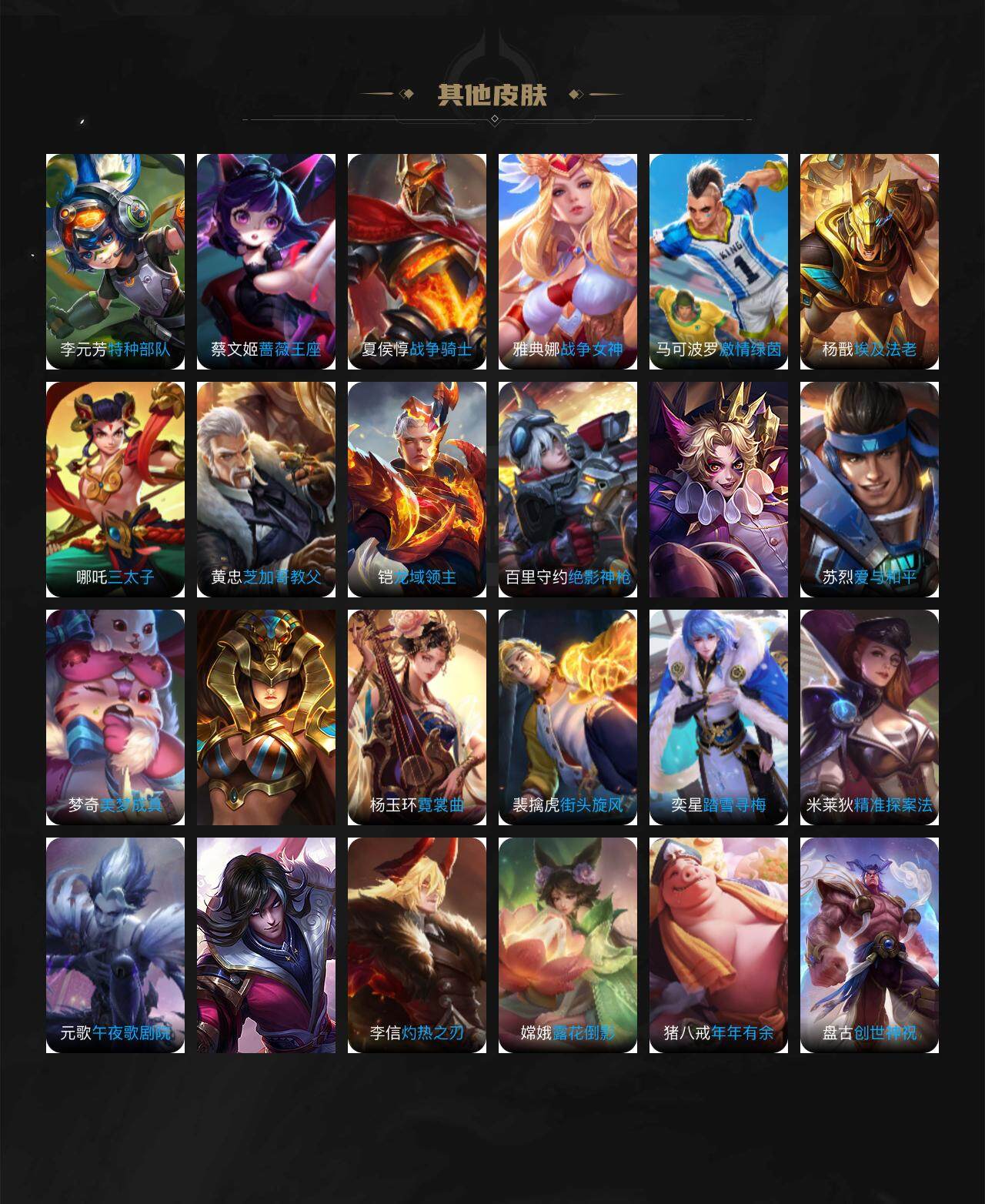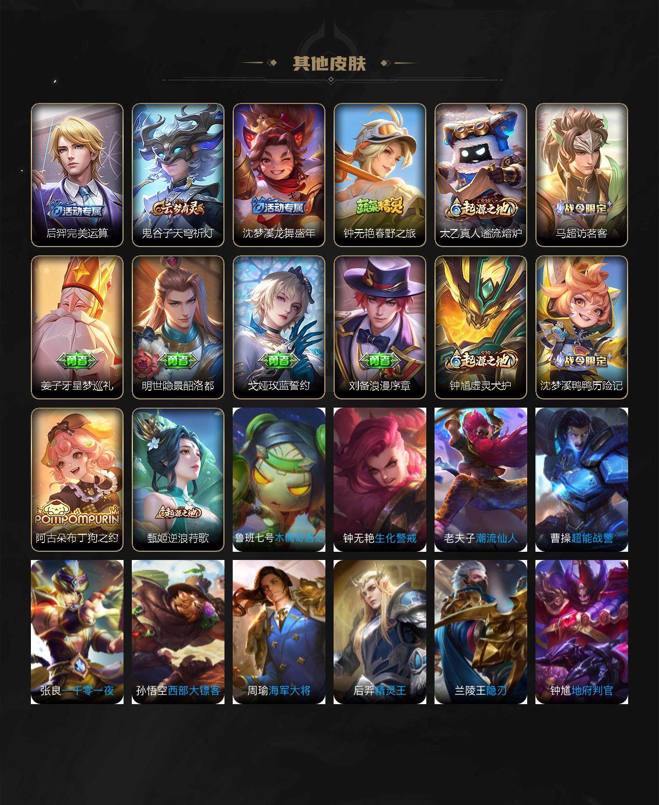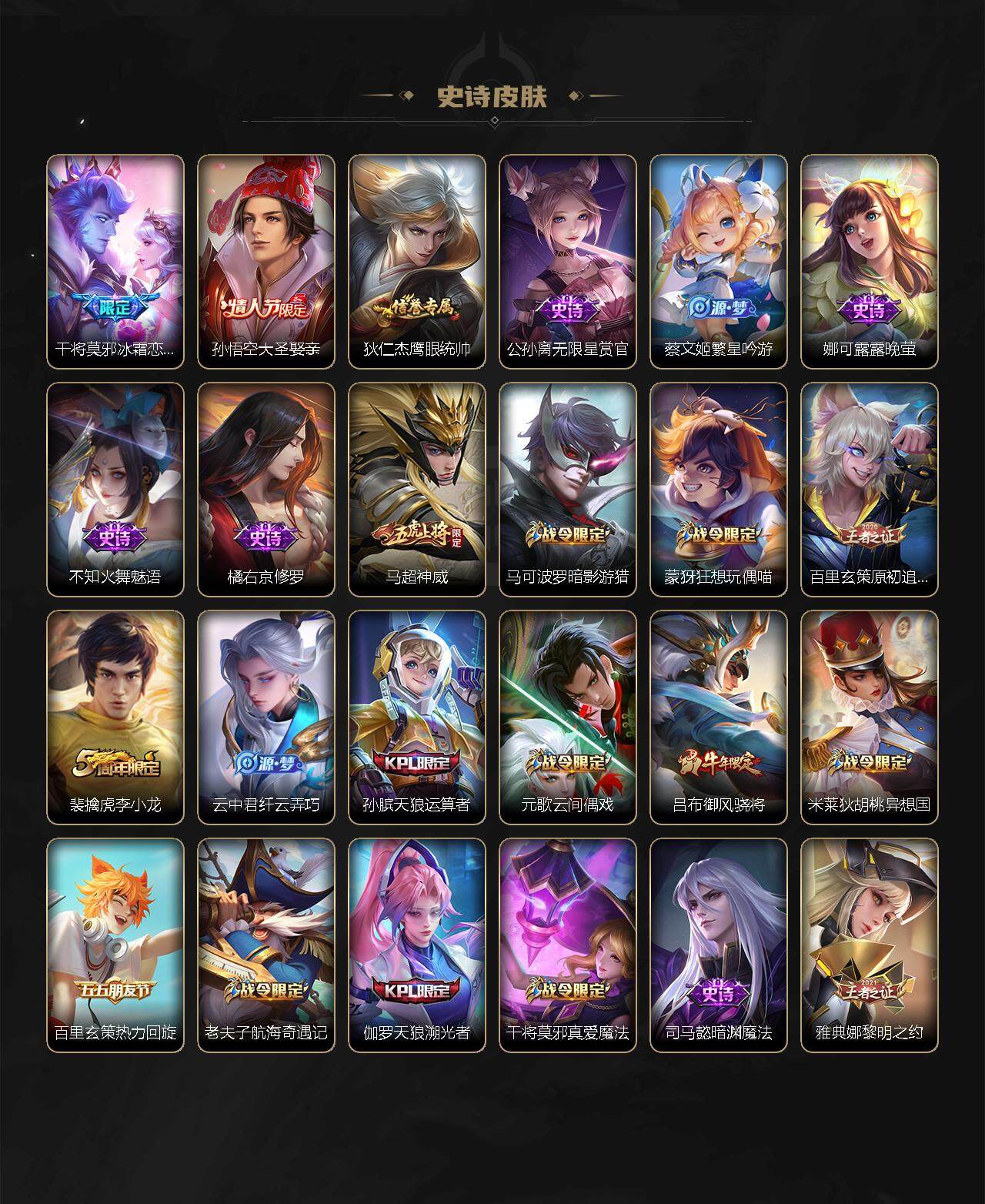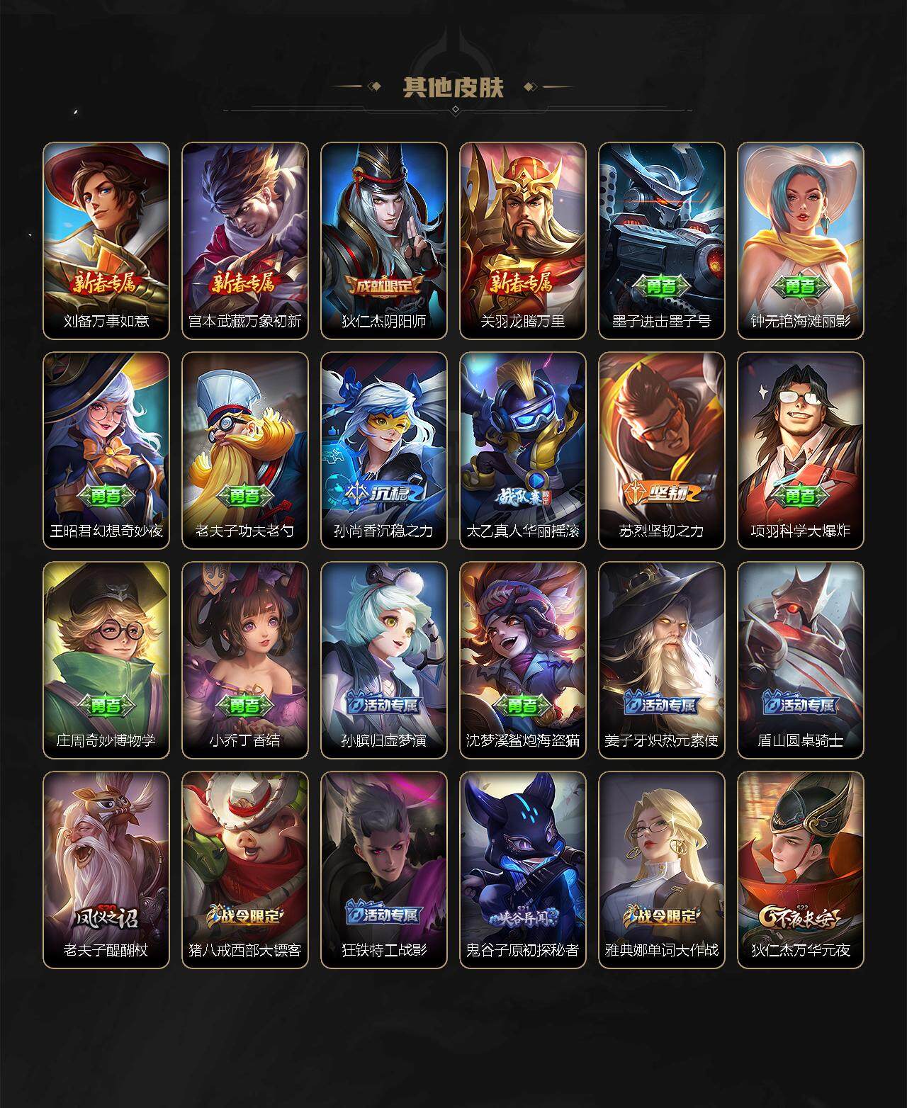 【限定皮肤】:狄仁杰阴阳师,赵云皇家上将,墨子神迹守卫,嬴政优雅恋人,孙膑天狼运算者,白起夜都怪侠,吕布御风骁将,元歌云间偶戏,元歌无心,马可波罗逐梦之星,马可波罗暗影游猎,狄仁杰魔术师,狄仁杰万华元夜,达摩星际陆战队,达摩沙漠行僧,项羽海滩派对,项羽霸王别姬,老夫子醍醐杖,老夫子航海奇遇记,关羽冰锋战神,关羽武圣,程咬金演武夺筹,兰陵王默契交锋,兰陵王金庭之子,亚瑟潮玩骑士王,孙悟空大圣娶亲,后羿圣弓游侠,李元芳云中旅人,钟馗驱傩正仪,干将莫邪冰霜恋舞曲,干将莫邪真爱魔法,雅典娜单词大作战,雅典娜黎明之约,蔡文姬繁星吟游,太乙真人华丽摇滚,鬼谷子原初探秘者,鬼谷子五谷丰年,诸葛亮鹤羽星尊,苏烈千军破阵,百里玄策白虎志,百里玄策原初追逐者,百里守约朱雀志,公孙离蜜橘之夏,公孙离祈雪灵祝,沈梦溪大漠名商,明世隐吟游魔法,裴擒虎李小龙,裴擒虎擒涛扼浪,米莱狄胡桃异想国,云中君纤云弄巧,伽罗天狼溯光者,猪八戒西部大镖客,曜李逍遥 ,蒙犽狂想玩偶喵,桑启海盐诗旅,暃星界游侠,鬼谷子天穹祈灯,沈梦溪龙舞盛年