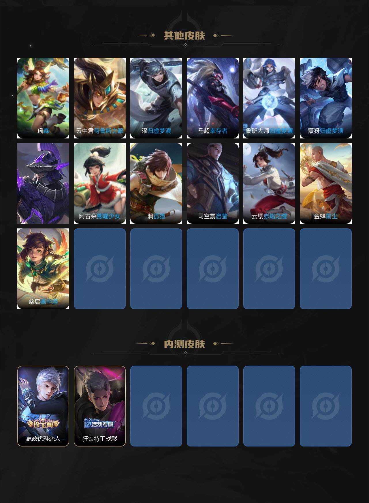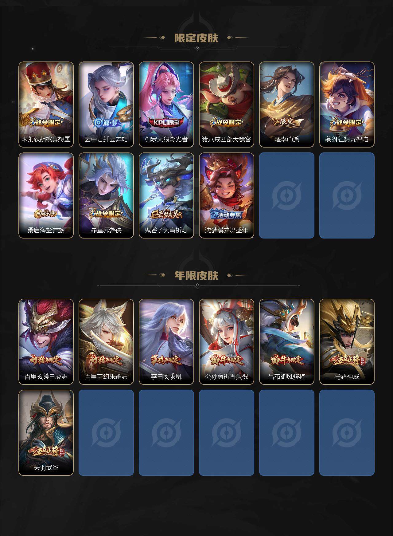 【年限皮肤】:百里玄策白虎志,百里守约朱雀志,李白凤求凰,公孙离祈雪灵祝,吕布御风骁将,马超神威,关羽武圣