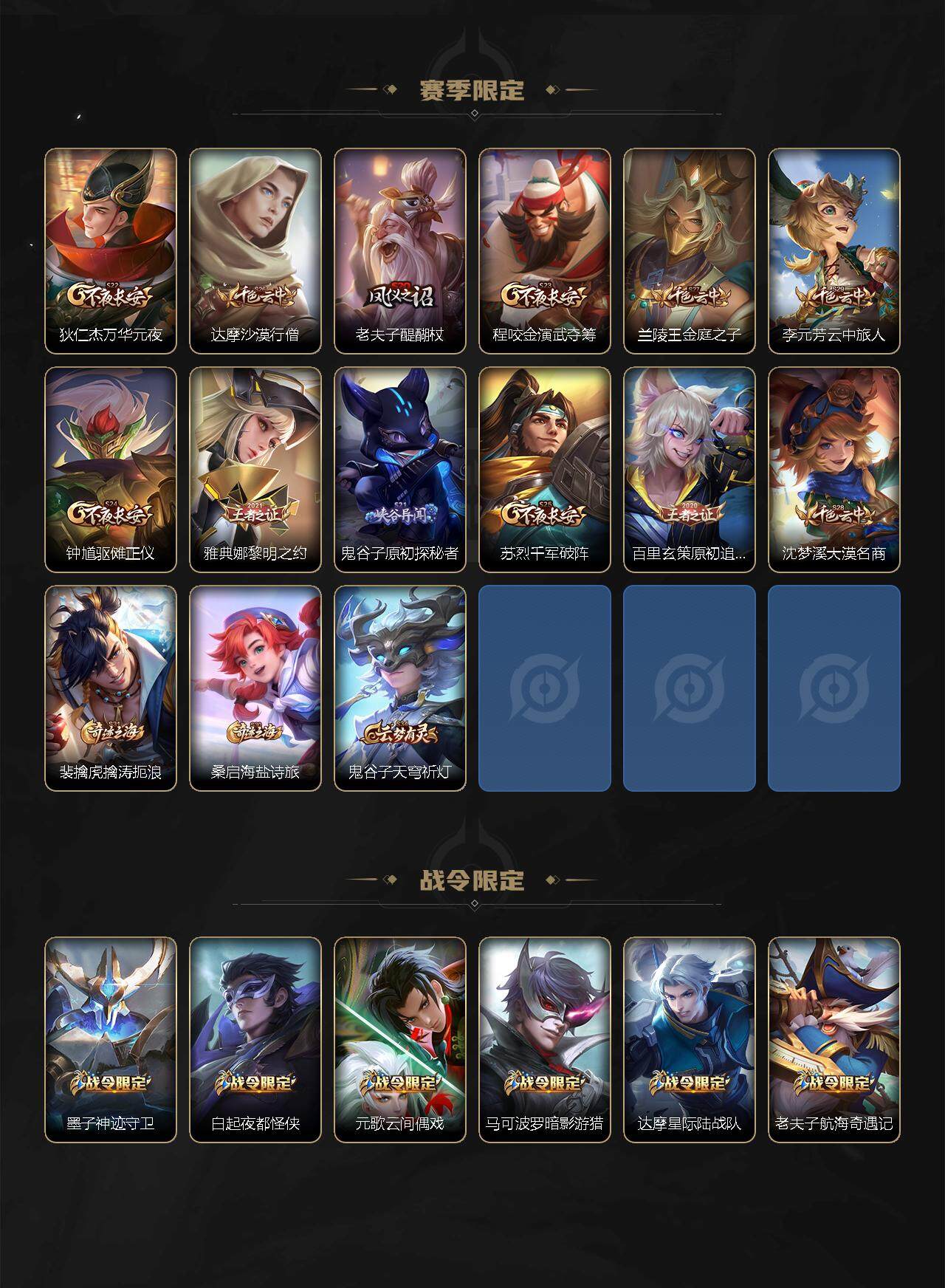 【赛季限定】:狄仁杰万华元夜,达摩沙漠行僧,老夫子醍醐杖,程咬金演武夺筹,兰陵王金庭之子,李元芳云中旅人,钟馗驱傩正仪,雅典娜黎明之约,鬼谷子原初探秘者,苏烈千军破阵,百里玄策原初追逐者,沈梦溪大漠名商,裴擒虎擒涛扼浪,桑启海盐诗旅,鬼谷子天穹祈灯