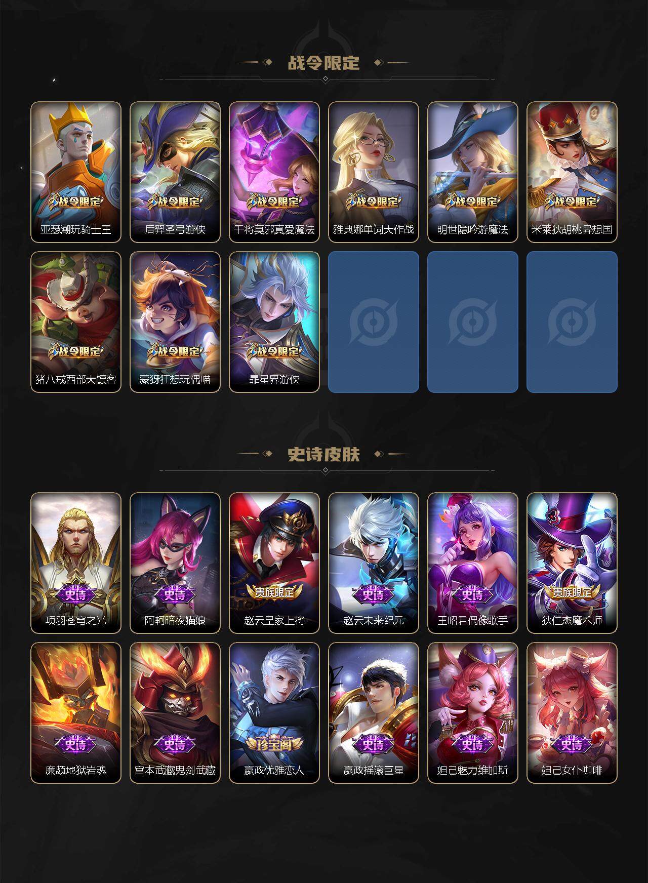【战令限定】:墨子神迹守卫,白起夜都怪侠,元歌云间偶戏,马可波罗暗影游猎,达摩星际陆战队,老夫子航海奇遇记,亚瑟潮玩骑士王,后羿圣弓游侠,干将莫邪真爱魔法,雅典娜单词大作战,明世隐吟游魔法,米莱狄胡桃异想国,猪八戒西部大镖客,蒙犽狂想玩偶喵,暃星界游侠