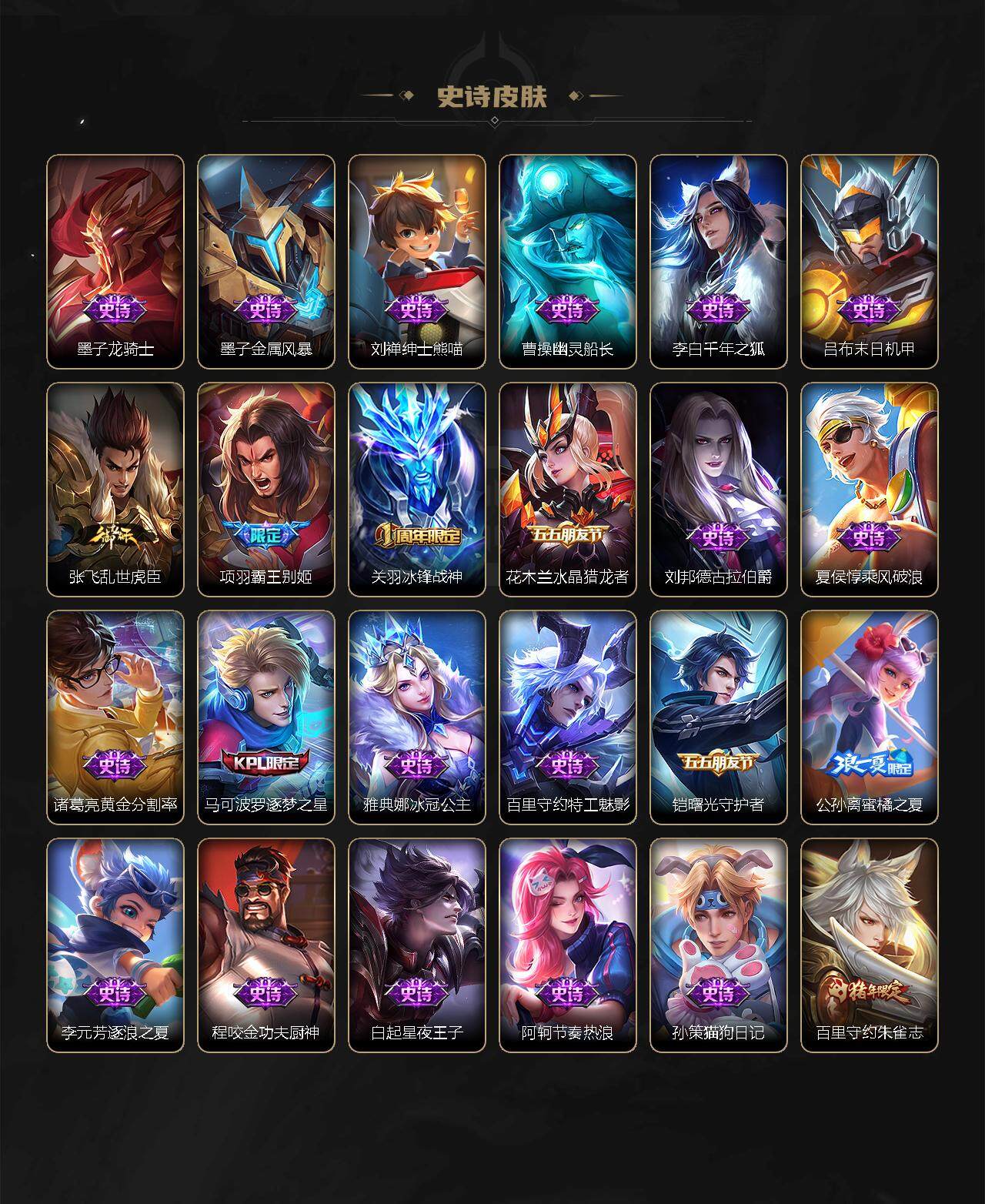 【史诗皮肤】:项羽苍穹之光,阿轲暗夜猫娘,赵云皇家上将,赵云未