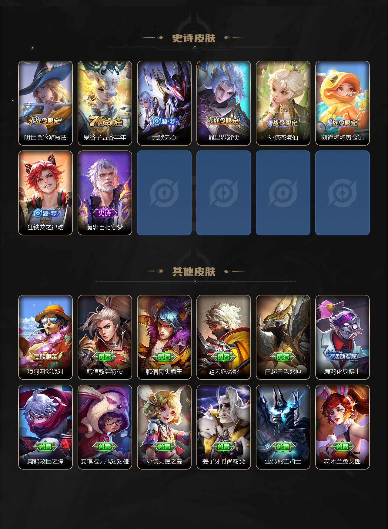 - [11678965]V6 4传说 123英雄 221皮肤 可修改实名 优质装备:地狱之眼 传说皮:典韦战鼓燎原 珍宝阁皮:蔷薇恋人,玩趣恶龙 限定皮:鸣野蒿,至尊宝,白虎志(电光耗子),凤凰于飞,遇见飞天,游园惊梦,梁祝,李小龙 史诗皮:星界战将,龙之律动,破空之剑,百相守梦-百里守约,百相守梦-黄忠,黄金分割率,特工魅影,千年之狐,江河有灵,百解令(蒙犽),高渐离燃音魔法,蒙恬荣光圣徽,冰冠公主,青蛇,偶像歌手,猫狗日记-孙策,乱世虎臣,节奏热浪,摇滚巨星,水果甜心,天才门将,星夜王子,心灵骇客,暗隐猎兽者,幽灵船长,心灵战警,天秀·启明,纤云弄巧,繁星吟游(呼啦呼啦),拒霜思,乘风破浪,逐浪之夏,水晶猎龙者,箭羽风息,金属风暴,圣诞狂欢,鹰眼统帅,天秀·音浪,无心
