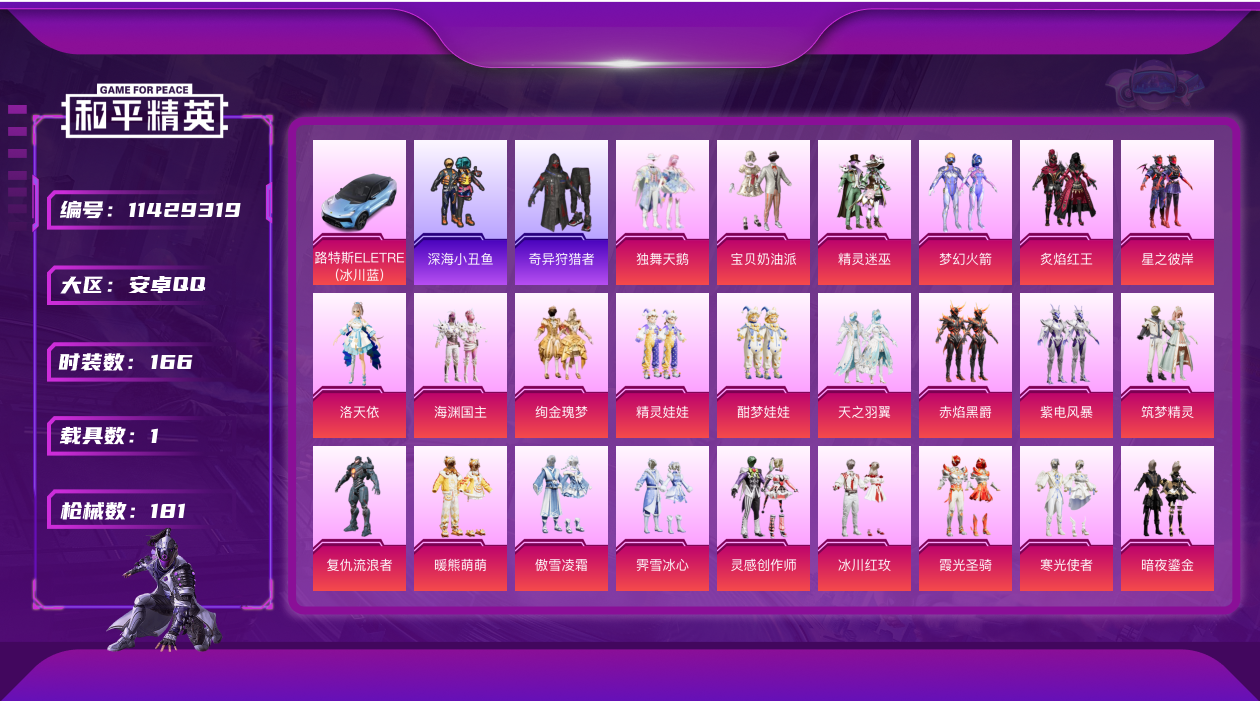 [11429319]【商品标题】:安卓 手Q-26粉装-6特效枪-1载具-71852热力值-8印记-166套装-181枪皮 【稀有载具】:路特斯ELETRE(冰川蓝) 【特效枪等级】:AKM-梦之光华(六级),M416-风花雪月(七级),AUG-星之彼岸(七级),Vector-环太平洋(四级),M249-绒雪飘舞(四级),MG3-炙焰牛王(五级) 【优质套装】:粉装-独舞天鹅,粉装-宝贝奶油派,粉装-精灵迷巫,粉装-梦幻火箭,粉装-炙焰红王,粉装-星之彼岸,粉装-蜜桃特工,角色-洛天依,粉装-海渊国主,粉装-绚金瑰梦,粉装-精灵娃娃,粉装-酣梦娃娃,粉装-天之羽翼,粉装-赤焰黑爵,粉装-紫电风暴,粉装-筑梦精灵,角色-复仇流浪者,粉装-暖熊萌萌,粉装-傲雪凌霜,粉装-霁雪冰心,粉装-灵感创作师,粉装-冰川红玫,粉装-霞光圣骑,粉装-寒光使者,粉装-暗夜鎏金,粉装-第五大道 【优质武器皮肤】:AKM-梦之光华,M416-风花雪月,AUG-星之彼岸,Vector-环太平洋,M249-绒雪飘舞,MG3-炙焰牛王 【稀有武器皮肤】:AKM-夜灯,AKM-彩虹符号,AKM-星之彼岸,AKM-环太平洋,AKM-生命誓言,AKM-虎虎生威,AKM-霓虹街区,AKM-龙的传人,M16A4-幻世战舞者,M16A4-甜心亚梦,M16A4-魔法学院,SCAR-L-暗夜玫瑰,SCAR-L-炫彩节奏,SCAR-L-玉兔迎春,M416-潮汐统领,M416-糯团青竹,M416-红色方程式,GROZA-异彩先驱,GROZA-彩虹符号,GROZA-懵萌河马,GROZA-春暖花开,GROZA-田园牧歌,AUG-2P战斗服款,AUG-青春冒险家,AUG-魔法学院,AUG-黑白懵懵牛,QBZ-妙趣可丽,QBZ-彩虹符号,QBZ-潮汐统领,QBZ-绚金瑰梦,QBZ-飞驰魅影,M762-天降萌叽,M762-牛气冲天,M762-瑞龙福将,M762-甜心宝贝,M762-绒雪飘舞,Mk47-天之羽翼,Mk47-妙红点点,Mk47-荒漠赏金,G36C-懵萌河马,G36C-暗夜玫瑰,G36C-炙焰牛王,AC-VAL-天降萌叽,AC-VAL-灵感创作师,AC-VAL-甜心亚梦,蜜獾-垂柳戏鸭,蜜獾-娇憨猪猪,UZI-娇憨猪猪,UZI-炫彩节奏,UZI-魔法学院,UMP45-仲夏莫吉托,UMP45-春暖花开,UMP45-生命誓言,Vecto