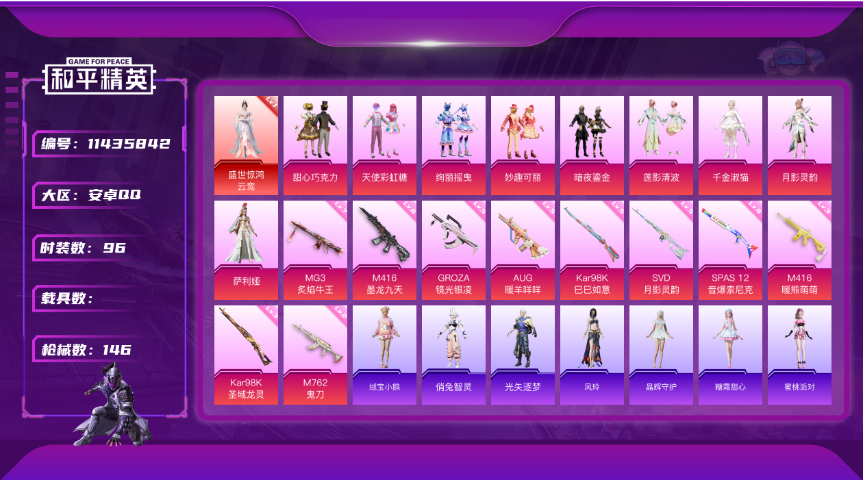 [11435842]【商品标题】:安卓 手Q-9粉装-10特效枪-0载具-59968热力值-8印记-96套装-146枪皮 【角色神装】:盛世惊鸿-云鸾 【角色神装等级】:盛世惊鸿-云鸾(一级) 【特效枪等级】:M416-暖熊萌萌(三级),M416-墨龙九天(六级),GROZA-镜光银凌(五级),AUG-暖羊咩咩(五级),M762-鬼刀(二级),Kar98K-巳巳如意(五级),Kar98K-圣域龙灵(三级),SVD-月影灵韵(五级),SPAS-12-音爆索尼克(四级),MG3-炙焰牛王(七级) 【优质套装】:粉装-甜心巧克力,粉装-天使彩虹糖,粉装-绚丽摇曳,粉装-妙趣可丽,粉装-暗夜鎏金,粉装-莲影清波,角色-千金淑猫,角色-月影灵韵,角色-萨利娅 【稀有套装】:套装-龟仙人,套装-绒宝小鹅,套装-巳巳如意,角色-许七安,角色-俏兔智灵,角色-光矢逐梦,套装-燕燕于飞,套装-鱼渊荷华,角色-风玲,套装-晶辉守护,角色-糖霜甜心,角色-蜜桃派对,套装-蓝冰羽 【优质武器皮肤】:M416-暖熊萌萌,M416-墨龙九天,GROZA-镜光银凌,AUG-暖羊咩咩,M762-鬼刀,Kar98K-巳巳如意,Kar98K-圣域龙灵,SVD-月影灵韵,SPAS-12-音爆索尼克,MG3-炙焰牛王 【稀有武器皮肤】:AKM-彩虹符号,AKM-灼热熔岩,AKM-破晓战魂,M16A4-幻世战舞者,M16A4-甜心亚梦,M16A4-千金淑猫,SCAR-L-炫彩节奏,SCAR-L-玉兔迎春,SCAR-L-红色方程式,M416-糯团青竹,M416-紫翼圣骑,M416-红色方程式,M416-蓝色火焰,GROZA-懵萌河马,GROZA-田园牧歌,AUG-天降萌叽,AUG-甜蜜菠萝,AUG-耀粉歌者,AUG-月影灵韵,QBZ-妙趣可丽,QBZ-彩虹符号,QBZ-飞驰魅影,M762-天降萌叽,M762-暗夜鎏金,M762-橘柚倾心,M762-甜心宝贝,Mk47-妙红点点,G36C-懵萌河马,AC-VAL-天降萌叽,AC-VAL-快闪甜心,AC-VAL-甜心亚梦,蜜獾-垂柳戏鸭,蜜獾-天降萌叽,蜜獾-娇憨猪猪,Famas-墨龙九天,UZI-娇憨猪猪,UZI-月影灵韵,UMP45-仲夏莫吉托,UMP45-涂山之恋,UMP45-生命誓言,UMP45-绒宝小鹅,Vector-生命誓言,Vector-田园牧歌,汤姆逊-耀粉歌者,A