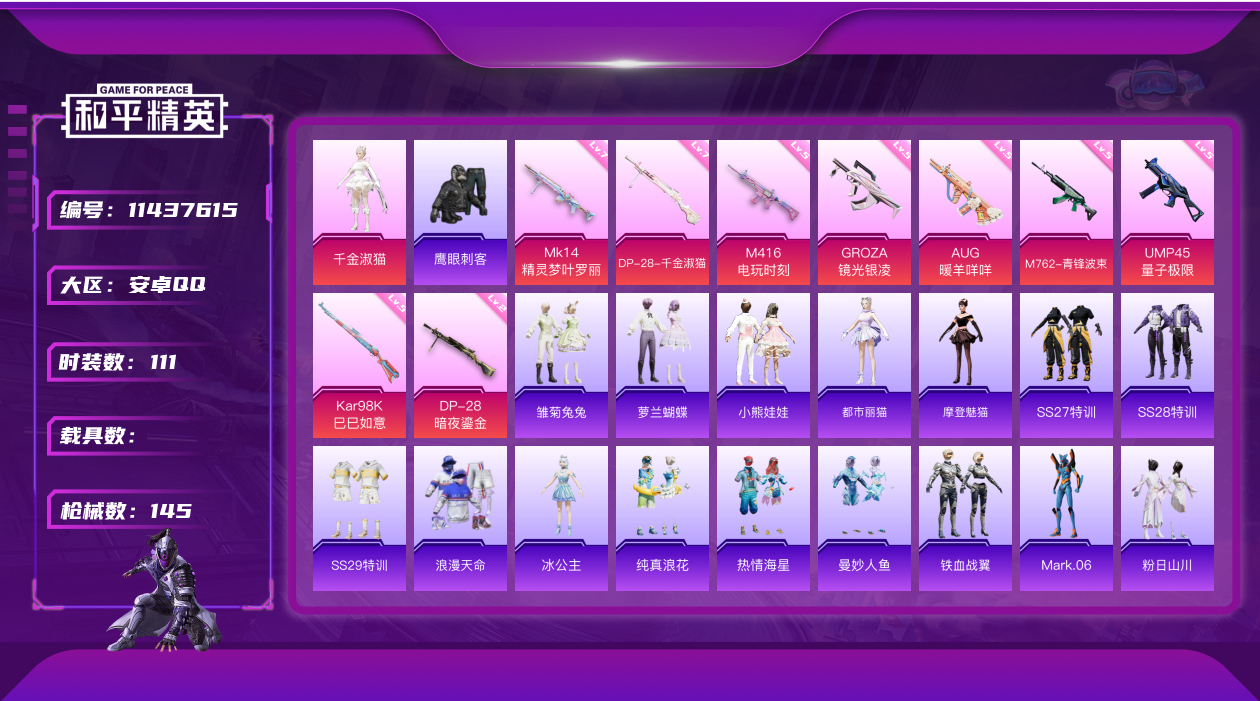 [11437615]【商品标题】:安卓 手Q-1粉装-9特效枪-0载具-43108热力值-12印记-111套装-145枪皮