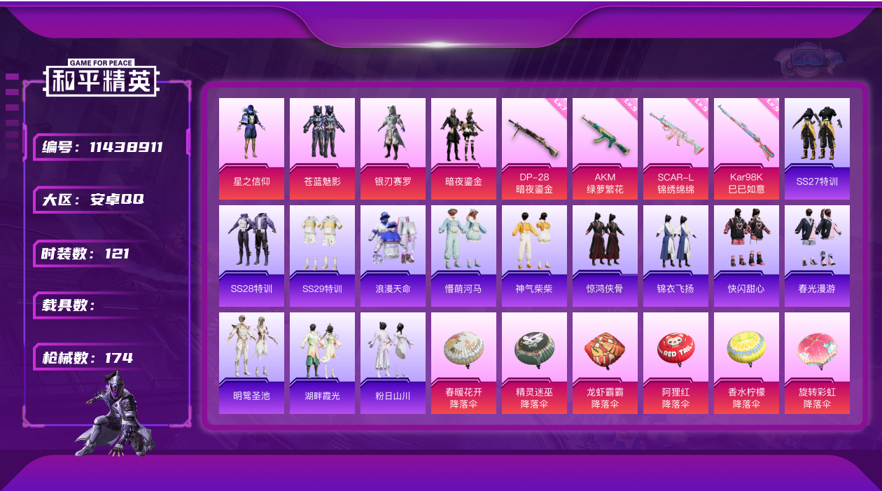 [11438911]【商品标题】:安卓 手Q-4粉装-4特效枪-0载具-48258热力值-9印记-121套装-174枪皮