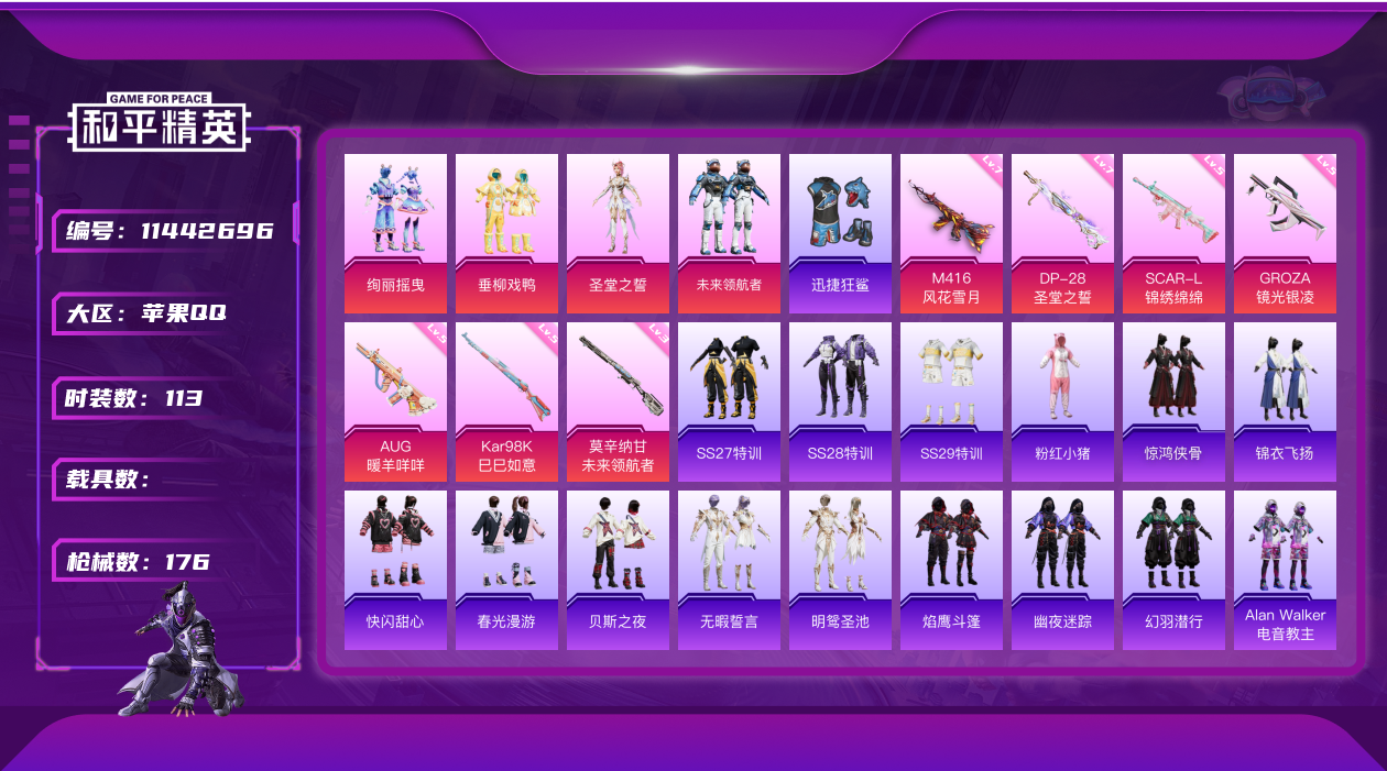 [11442696]【商品标题】:苹果 手Q-4粉装-7特效枪-0载具-49656热力值-10印记-113套装-176枪皮