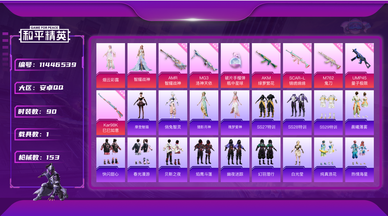 [11446539]【商品标题】:安卓 手Q-3粉装-9特效枪-1载具-49106热力值-10印记-90套装-153枪皮 【稀有载具】:虚妄之影(炫耀紫) 【特效枪等级】:AKM-绿萝繁花(五级),SCAR-L-锦绣绵绵(五级),M762-鬼刀(五级),UMP45-量子极限(五级),Kar98K-巳巳如意(五级),Mk14-甜梦熊击(五级),AMR-智耀战神(七级),MG3-洛神天依(七级),破片手榴弹-瓶中星球(七级) 【优质套装】:角色-烟云彩露,角色-智耀战神,粉装-幻彩电音 【稀有套装】:套装-龟仙人,套装-巳巳如意,套装-糖糖葫芦,套装-青团波波,套装-棉花软糖,角色-摩登魅猫,角色-俏兔智灵,套装-燕燕于飞,套装-鱼渊荷华,套装-粉恋花,套装-紫幽梦,套装-蓝冰羽,角色-猎影月神,角色-瑰梦爱神,角色-鲛海歌灵,套装-星影赞美诗,套装-星渊小夜曲,套装-彩虹兔,套装-云朵鹅,套装-雪绒豹,套装-诡诞巡游,角色-时希公主,角色-乐音 【优质武器皮肤】:AKM-绿萝繁花,SCAR-L-锦绣绵绵,M762-鬼刀,UMP45-量子极限,Kar98K-巳巳如意,Mk14-甜梦熊击,AMR-智耀战神,MG3-洛神天依,破片手榴弹-瓶中星球 【稀有武器皮肤】:AKM-霓虹街区,AKM-龙的传人,SCAR-L-玉兔迎春,SCAR-L-粉锦千层,SCAR-L-冷漠罗丽,M416-糯团青竹,M416-蓝色火焰,GROZA-彩虹符号,GROZA-荧海星豚,AUG-耀粉歌者,QBZ-洛神天依,M762-云朵鹅,Mk47-洛神天依,G36C-镜域双华,G36C-星穹咏叹调,AC-VAL-天降萌叽,AC-VAL-快闪甜心,蜜獾-天降萌叽,UZI-啾咪啾咪,UZI-天降萌叽,UZI-红色方程式,UMP45-涂山之恋,UMP45-蓝色火焰,UMP45-绒宝小鹅,Vector-焰鹰斗篷,Vector-彩虹符号,Vector-百变魔方,汤姆逊-天降萌叽,汤姆逊-炫彩节奏,汤姆逊-智耀战神,P90-快闪甜心,P90-巳巳如意,Kar98K-彩虹符号,Kar98K-洛神天依,Kar98K-红色方程式,Kar98K-星穹咏叹调,AWM-焰鹰斗篷,VSS-彩虹符号,Mini14-耀粉歌者,Mini14-辉羽雀灵,Mk14-魔药课室,莫辛纳甘-蜜语绒猫,MK20-H-快闪甜心,MK20-H-莲影清波,SVD-云朵鹅,