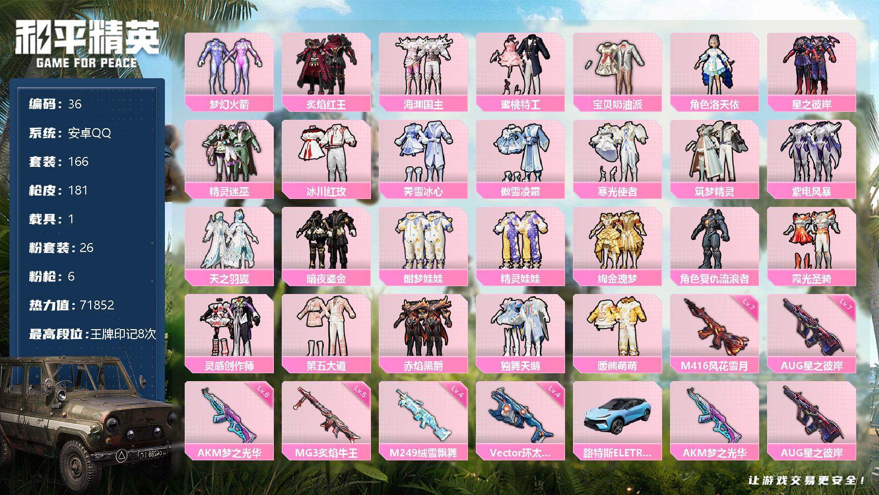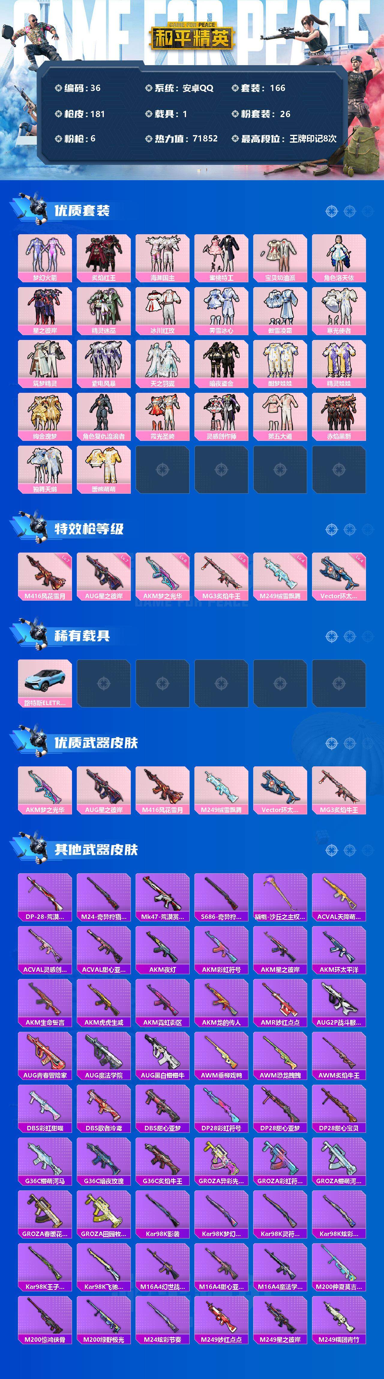 [11447384]【商品标题】:安卓 手Q-26粉装-6特效枪-1载具-71852热力值-8印记-166套装-181枪皮 【稀有载具】:路特斯ELETRE(冰川蓝) 【特效枪等级】:AKM-梦之光华(六级),M416-风花雪月(七级),AUG-星之彼岸(七级),Vector-环太平洋(四级),M249-绒雪飘舞(四级),MG3-炙焰牛王(五级) 【优质套装】:粉装-独舞天鹅,粉装-宝贝奶油派,粉装-精灵迷巫,粉装-梦幻火箭,粉装-炙焰红王,粉装-星之彼岸,粉装-蜜桃特工,角色-洛天依,粉装-海渊国主,粉装-绚金瑰梦,粉装-精灵娃娃,粉装-酣梦娃娃,粉装-天之羽翼,粉装-赤焰黑爵,粉装-紫电风暴,粉装-筑梦精灵,角色-复仇流浪者,粉装-暖熊萌萌,粉装-傲雪凌霜,粉装-霁雪冰心,粉装-灵感创作师,粉装-冰川红玫,粉装-霞光圣骑,粉装-寒光使者,粉装-暗夜鎏金,粉装-第五大道 【优质武器皮肤】:AKM-梦之光华,M416-风花雪月,AUG-星之彼岸,Vector-环太平洋,M249-绒雪飘舞,MG3-炙焰牛王 【稀有武器皮肤】:AKM-夜灯,AKM-彩虹符号,AKM-星之彼岸,AKM-环太平洋,AKM-生命誓言,AKM-虎虎生威,AKM-霓虹街区,AKM-龙的传人,M16A4-幻世战舞者,M16A4-甜心亚梦,M16A4-魔法学院,SCAR-L-暗夜玫瑰,SCAR-L-炫彩节奏,SCAR-L-玉兔迎春,M416-潮汐统领,M416-糯团青竹,M416-红色方程式,GROZA-异彩先驱,GROZA-彩虹符号,GROZA-懵萌河马,GROZA-春暖花开,GROZA-田园牧歌,AUG-2P战斗服款,AUG-青春冒险家,AUG-魔法学院,AUG-黑白懵懵牛,QBZ-妙趣可丽,QBZ-彩虹符号,QBZ-潮汐统领,QBZ-绚金瑰梦,QBZ-飞驰魅影,M762-天降萌叽,M762-牛气冲天,M762-瑞龙福将,M762-甜心宝贝,M762-绒雪飘舞,Mk47-天之羽翼,Mk47-妙红点点,Mk47-荒漠赏金,G36C-懵萌河马,G36C-暗夜玫瑰,G36C-炙焰牛王,AC-VAL-天降萌叽,AC-VAL-灵感创作师,AC-VAL-甜心亚梦,蜜獾-垂柳戏鸭,蜜獾-娇憨猪猪,UZI-娇憨猪猪,UZI-炫彩节奏,UZI-魔法学院,UMP45-仲夏莫吉托,UMP45-春暖花开,UMP45-生命誓言,Vecto