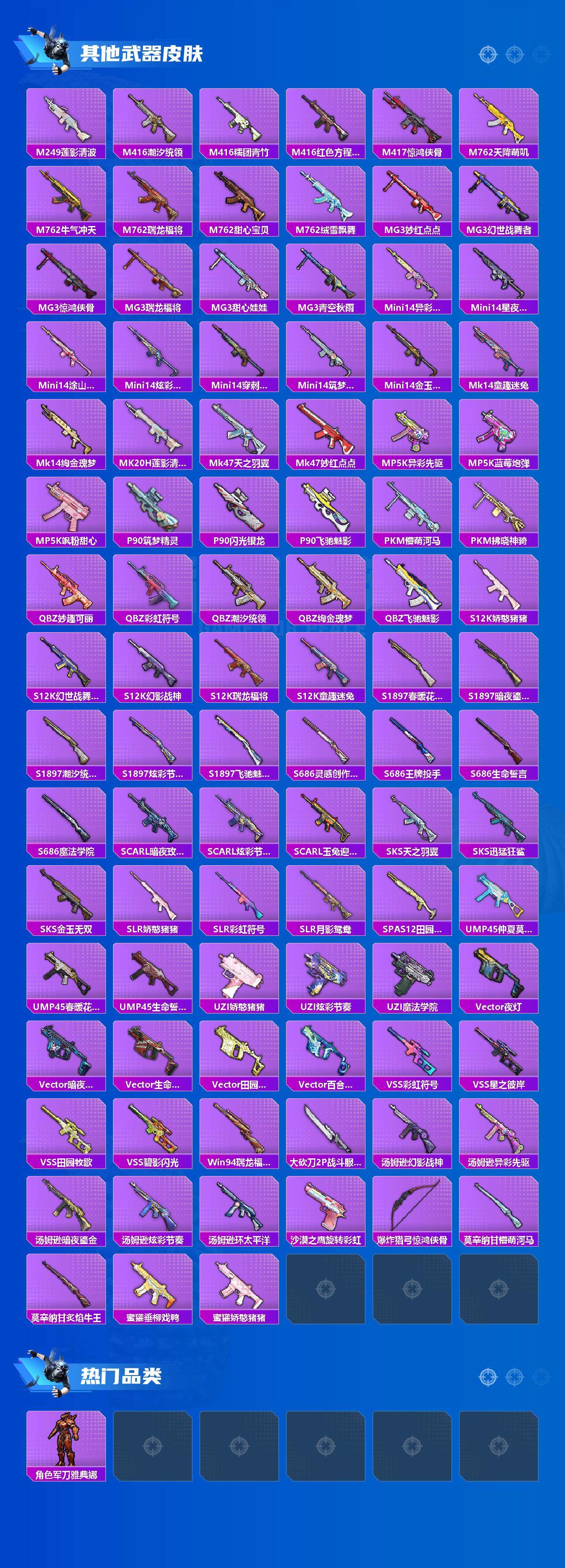 【稀有武器皮肤】:AKM-夜灯,AKM-彩虹符号,AKM-星之彼岸,AKM-环太平洋,AKM-生命誓言,AKM-虎虎生威,AKM-霓虹街区,AKM-龙的传人,M16A4-幻世战舞者,M16A4-甜心亚梦,M16A4-魔法学院,SCAR-L-暗夜玫瑰,SCAR-L-炫彩节奏,SCAR-L-玉兔迎春,M416-潮汐统领,M416-糯团青竹,M416-红色方程式,GROZA-异彩先驱,GROZA-彩虹符号,GROZA-懵萌河马,GROZA-春暖花开,GROZA-田园牧歌,AUG-2P战斗服款,AUG-青春冒险家,AUG-魔法学院,AUG-黑白懵懵牛,QBZ-妙趣可丽,QBZ-彩虹符号,QBZ-潮汐统领,QBZ-绚金瑰梦,QBZ-飞驰魅影,M762-天降萌叽,M762-牛气冲天,M762-瑞龙福将,M762-甜心宝贝,M762-绒雪飘舞,Mk47-天之羽翼,Mk47-妙红点点,Mk47-荒漠赏金,G36C-懵萌河马,G36C-暗夜玫瑰,G36C-炙焰牛王,AC-VAL-天降萌叽,AC-VAL-灵感创作师,AC-VAL-甜心亚梦,蜜獾-垂柳戏鸭,蜜獾-娇憨猪猪,UZI-娇憨猪猪,UZI-炫彩节奏,UZI-魔法学院,UMP45-仲夏莫吉托,UMP45-春暖花开,UMP45-生命誓言,Vecto