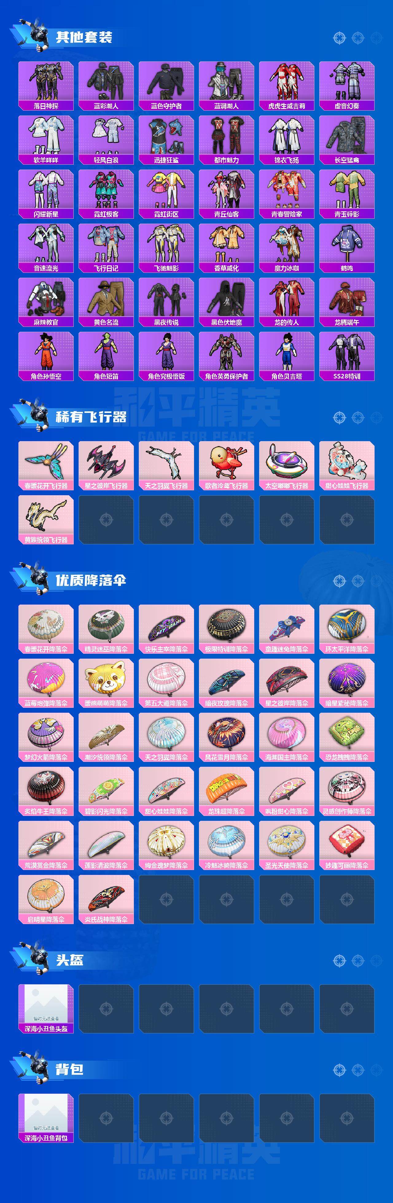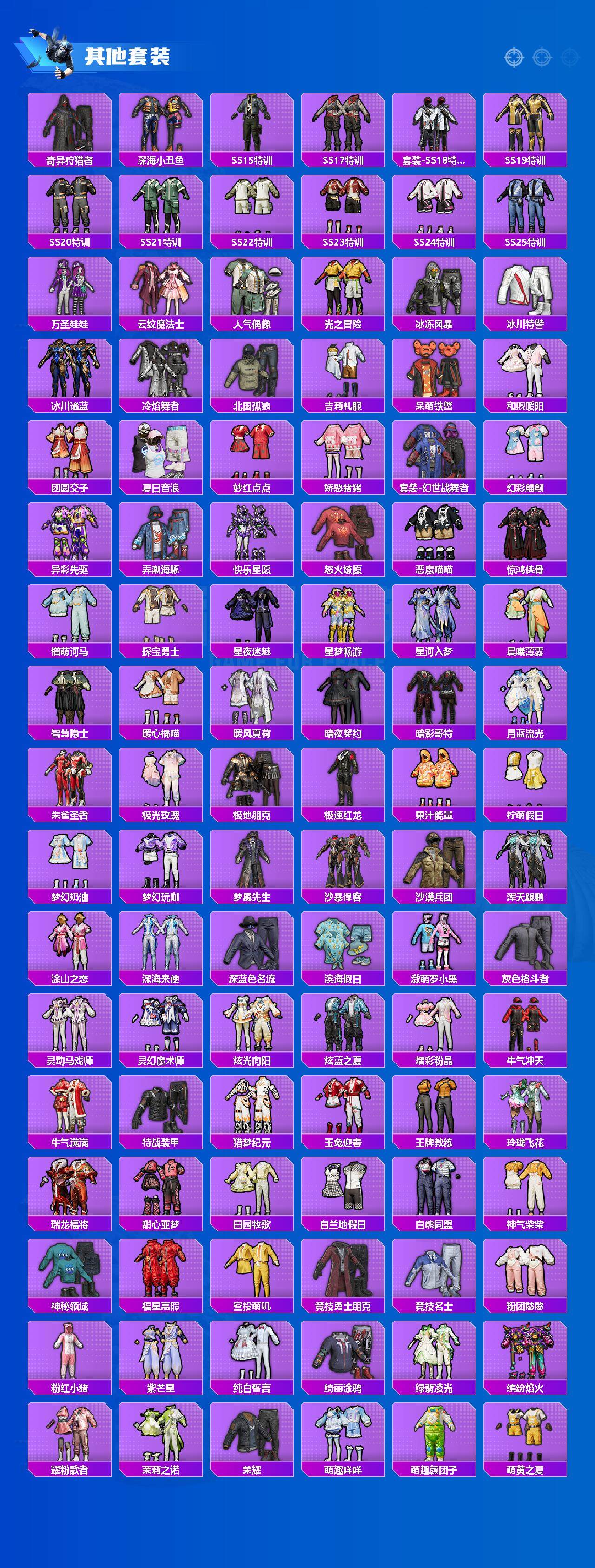 套装-深海小丑鱼,套装-奇异狩猎者,独舞天鹅套装,套装-宝贝奶油派,套装-精灵迷巫,套装-梦幻火箭,套装-炙焰红王,套装-星之彼岸,角色-洛天依,套装-海渊国主,套装-绚金瑰梦,套装-精灵娃娃,套装-酣梦娃娃,套装-天之羽翼,套装-赤焰黑爵,套装-紫电风暴,套装-筑梦精灵,角色-复仇流浪者,套装-暖熊萌萌,套装-傲雪凌霜,套装-霁雪冰心,套装-灵感创作师,套装-冰川红玫,套装-霞光圣骑,套装-寒光使者,套装-暗夜鎏金,套装-第五大道,套装-迅捷狂鲨,套装-梦魇先生,套装-恶魔喵喵