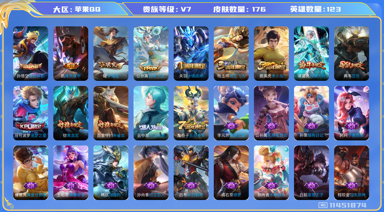 - PX_2095783-实名: 可修改 贵族等级: V7 英雄数: 100 皮肤数: 88 传说皮: 猫影幻舞,仲夏夜之梦,游龙清影,无双飞将,音你闪耀 限定皮: 遇见飞天,瑞麟志,朱雀志,五谷丰年,神器·万象笔,鸣野蒿