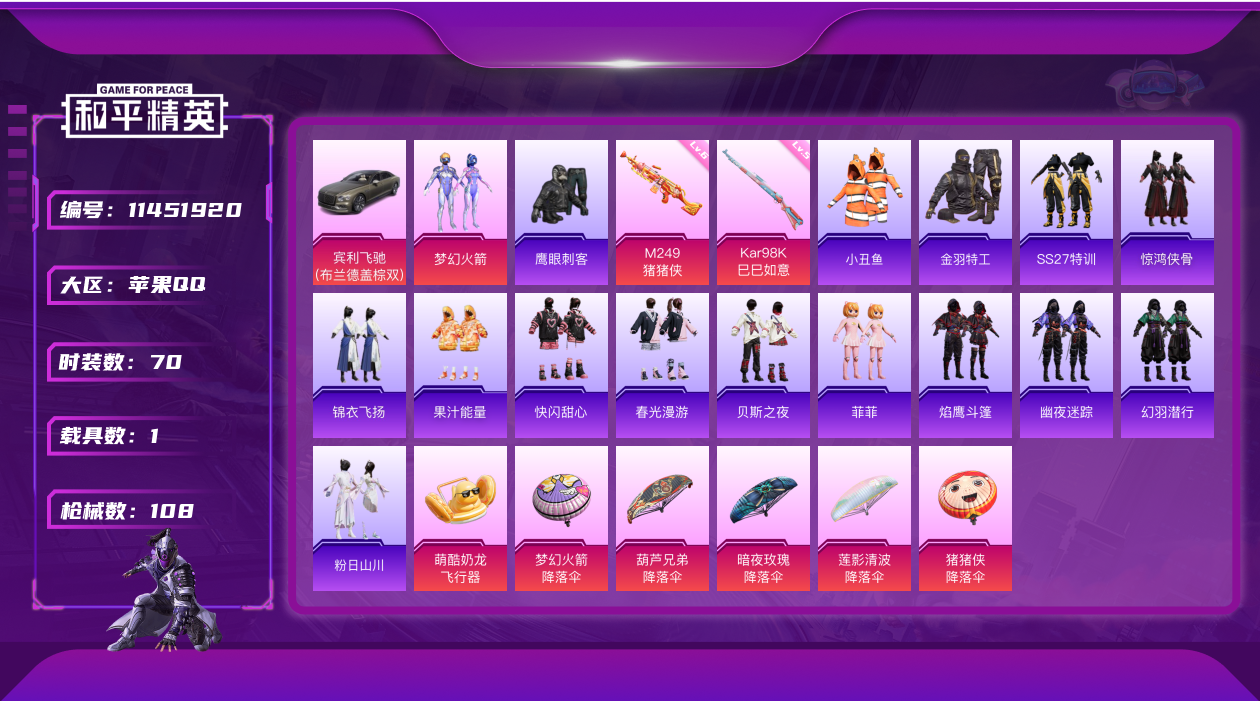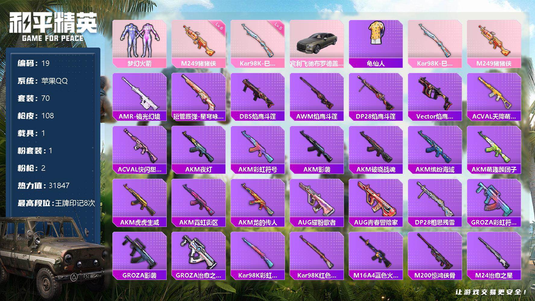 [11451920]【商品标题】:苹果 手Q-1粉装-2特效枪-1载具-31847热力值-8印记-70套装-108枪皮