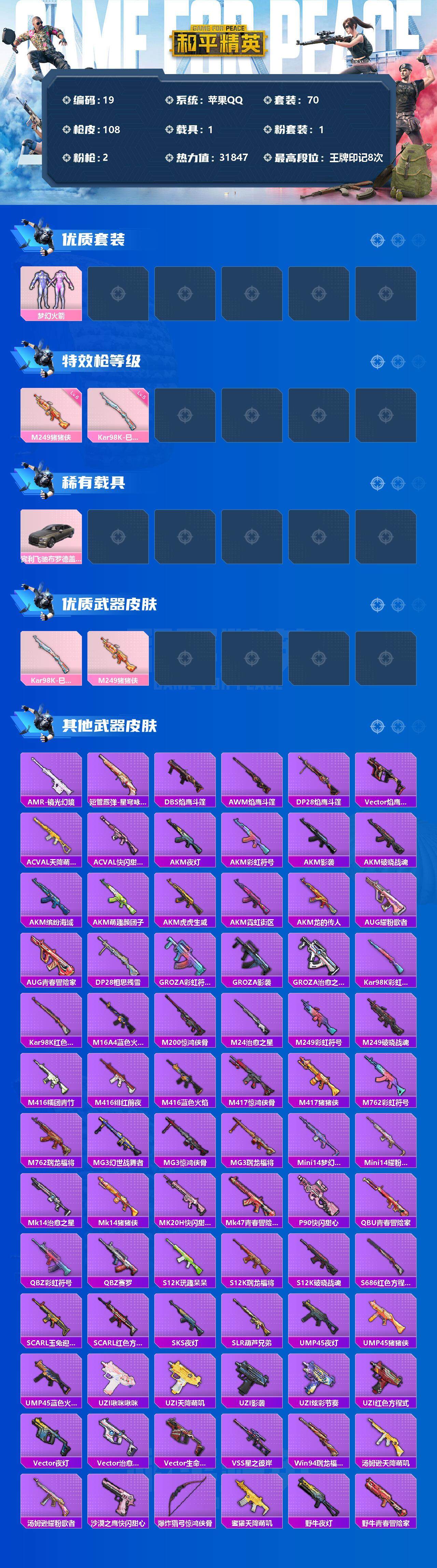[11451920]【商品标题】:苹果 手Q-1粉装-2特效枪-1载具-31847热力值-8印记-70套装-108枪皮 【稀有载具】:宾利飞驰(布罗德盖棕双色) 【特效枪等级】:Kar98K-巳巳如意(五级),M249-猪猪侠(六级) 【优质套装】:粉装-梦幻火箭 【稀有套装】:套装-龟仙人 【优质武器皮肤】:Kar98K-巳巳如意,M249-猪猪侠 【稀有武器皮肤】:AKM-夜灯,AKM-彩虹符号,AKM-影袭,AKM-破晓战魂,AKM-缤纷海域,AKM-萌趣颜团子,AKM-虎虎生威,AKM-霓虹街区,AKM-龙的传人,M16A4-蓝色火焰,SCAR-L-玉兔迎春,SCAR-L-红色方程式,M416-糯团青竹,M416-绯红前夜,M416-蓝色火焰,GROZA-彩虹符号,GROZA-影袭,GROZA-治愈之星,AUG-耀粉歌者,AUG-青春冒险家,QBZ-彩虹符号,QBZ-赛罗,M762-彩虹符号,M762-瑞龙福将,Mk47-青春冒险家,AC-VAL-天降萌叽,AC-VAL-快闪甜心,蜜獾-天降萌叽,UZI-啾咪啾咪,UZI-天降萌叽,UZI-影袭,UZI-炫彩节奏,UZI-红色方程式,UMP45-夜灯,UMP45-猪猪侠,UMP45-蓝色火焰,Vector-焰鹰斗篷,Vector-夜灯,Vector-治愈之星,Vector-生命誓言,汤姆逊-天降萌叽,汤姆逊-耀粉歌者,野牛-夜灯,野牛-青春冒险家,P90-快闪甜心,Kar98K-彩虹符号,Kar98K-红色方程式,M24-治愈之星,AWM-焰鹰斗篷,SKS-夜灯,VSS-星之彼岸,Mini14-梦幻火箭,Mini14-耀粉歌者,Mk14-治愈之星,Mk14-猪猪侠,Win94-瑞龙福将,SLR-葫芦兄弟,QBU-青春冒险家,AMR-镜光幻境,M417-惊鸿侠骨,M417-猪猪侠,MK20-H-快闪甜心,M200-惊鸿侠骨,S686-红色方程式,S12K-玩趣呆呆,S12K-瑞龙福将,S12K-破晓战魂,DBS-焰鹰斗篷,M249-彩虹符号,M249-破晓战魂,DP-28-焰鹰斗篷,DP-28-相思残雪,MG3-幻世战舞者,MG3-惊鸿侠骨,MG3-瑞龙福将,短管霰弹-星穹咏叹调,沙漠之鹰-快闪甜心,爆炸猎弓-惊鸿侠骨 【热门品类】:套装-小丑鱼,套装-金羽特工 【其他套装】:套装-SS14特训,套装-SS15特训,套装-SS1