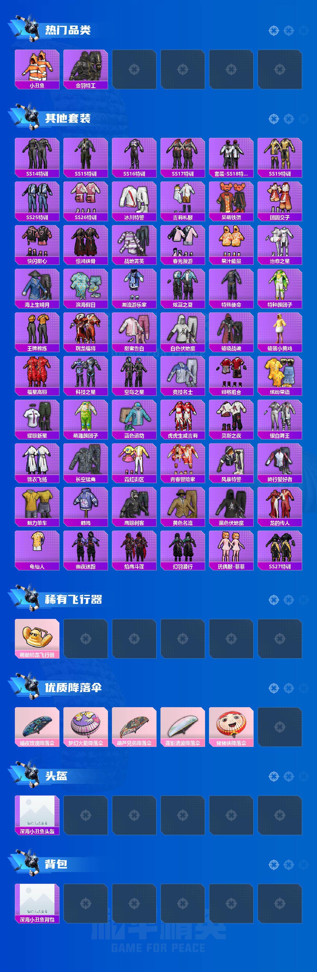 - PX_2099199--YXc11025【可二次】【因赛季更新游戏段付以上号为准!】 4王牌印记 历史超级王牌8星 140套装 187枪皮 【2载具】 宾利飞驰布罗德盖棕双色 兰博轿车灰色 【1稀有】 S1赛事外套 【13粉装】 梦幻火箭 小蓝 美琪 女娲灵识 金丰海韵 紫钛骑兵 宙之时溯 星云暗核 烈焰拳霸 炙焰赤龙 飓风飞鹰 蜜桃特工 桀骜红莲 【3特效枪】 M416-电玩时刻 (5级) Ka