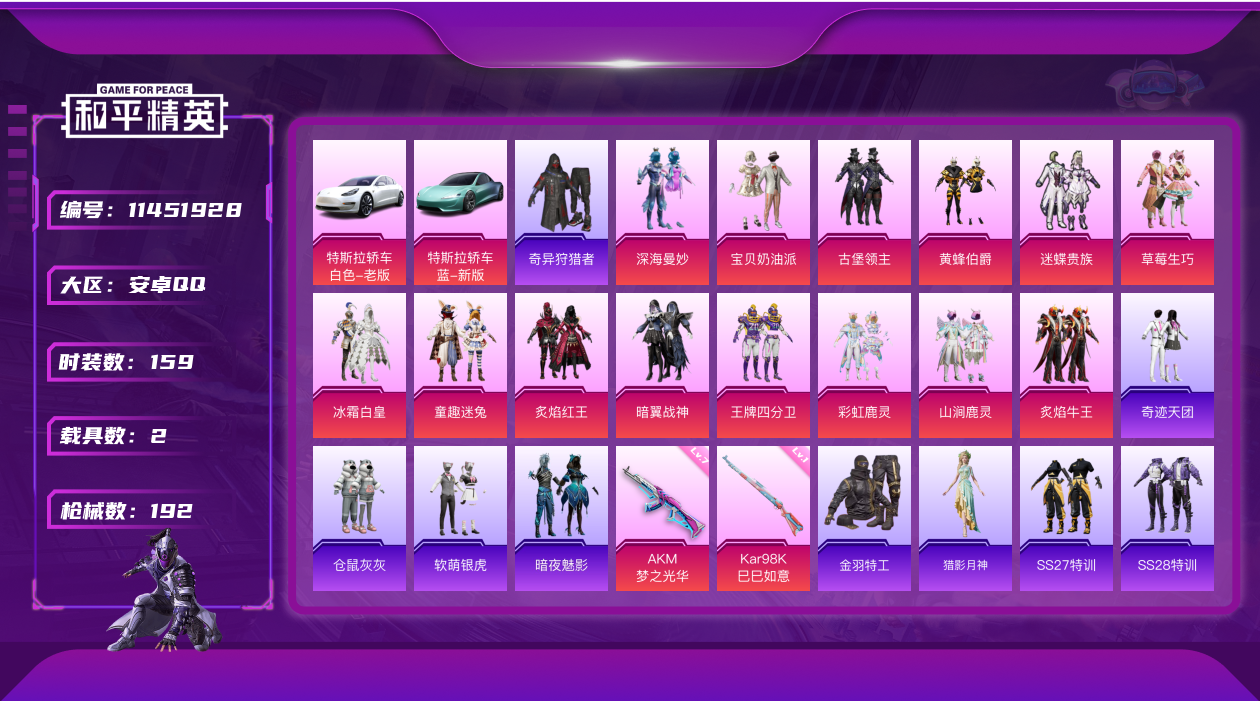 [11451928]【商品标题】:安卓 手Q-14粉装-2特效枪-2载具-72750热力值-6印记-159套装-192枪皮 【稀有载具】:特斯拉Model 3(珍珠白),特斯拉Roadster(水滴蓝) 【特效枪等级】:AKM-梦之光华(七级),Kar98K-巳巳如意(一级) 【优质套装】:粉装-深海曼妙,粉装-宝贝奶油派,粉装-古堡领主,粉装-黄蜂伯爵,粉装-迷蝶贵族,粉装-草莓生巧,粉装-冰霜白皇,粉装-童趣迷兔,粉装-炙焰红王,粉装-暗翼战神,粉装-王牌四分卫,粉装-彩虹鹿灵,粉装-山涧鹿灵,粉装-炙焰牛王 【稀有套装】:套装-龟仙人,角色-猎影月神 【优质武器皮肤】:AKM-梦之光华,Kar98K-巳巳如意 【稀有武器皮肤】:AKM-PEL轰鸣竞梦者,AKM-冰凉西瓜,AKM-彩虹符号,AKM-星之信仰,AKM-春暖花开,AKM-玉龙,AKM-百万伏特,AKM-破晓战魂,AKM-萌趣颜团子,AKM-龙的传人,M16A4-机械英豪,M16A4-蓝色火焰,SCAR-L-炫彩节奏,SCAR-L-玉兔迎春,SCAR-L-王牌四分卫,SCAR-L-金风玉露,M416-仓鼠灰灰,M416-夜灯,M416-神秘黑猫,M416-蓝色火焰,GROZA-异彩先驱,GROZA-春暖花开,GROZA-治愈之星,GROZA-生命誓言,GROZA-蓝莓炮弹,GROZA-黑色刀锋,AUG-青春冒险家,QBZ-原初圣火,QBZ-彩虹符号,QBZ-潮汐统领,QBZ-神秘黑猫,QBZ-赛罗,QBZ-飞驰魅影,M762-天降萌叽,M762-奇异狩猎者,M762-快乐主宰,M762-拳皇97,M762-牛气冲天,M762-瑞龙福将,M762-绯红前夜,M762-镭射皇者,Mk47-百万伏特,Mk47-青春冒险家,G36C-不夜海上花,G36C-时空追击者,G36C-金风玉露,AC-VAL-六号稻草人,UZI-众神之王,UZI-古堡领主,UZI-炫彩节奏,UZI-金风玉露,UZI-魔法学院,UZI-月影灵韵,UMP45-夜灯,UMP45-天启纪元,UMP45-快乐主宰,UMP45-时空追击者,Vector-彩虹符号,Vector-暗夜玫瑰,Vector-治愈之星,Vector-黑色刀锋,汤姆逊-勇闯险境,汤姆逊-天降萌叽,汤姆逊-奇异狩猎者,汤姆逊-异彩先驱,汤姆逊-花间之火,野牛-机械英豪,野牛-王牌四分卫,野牛-