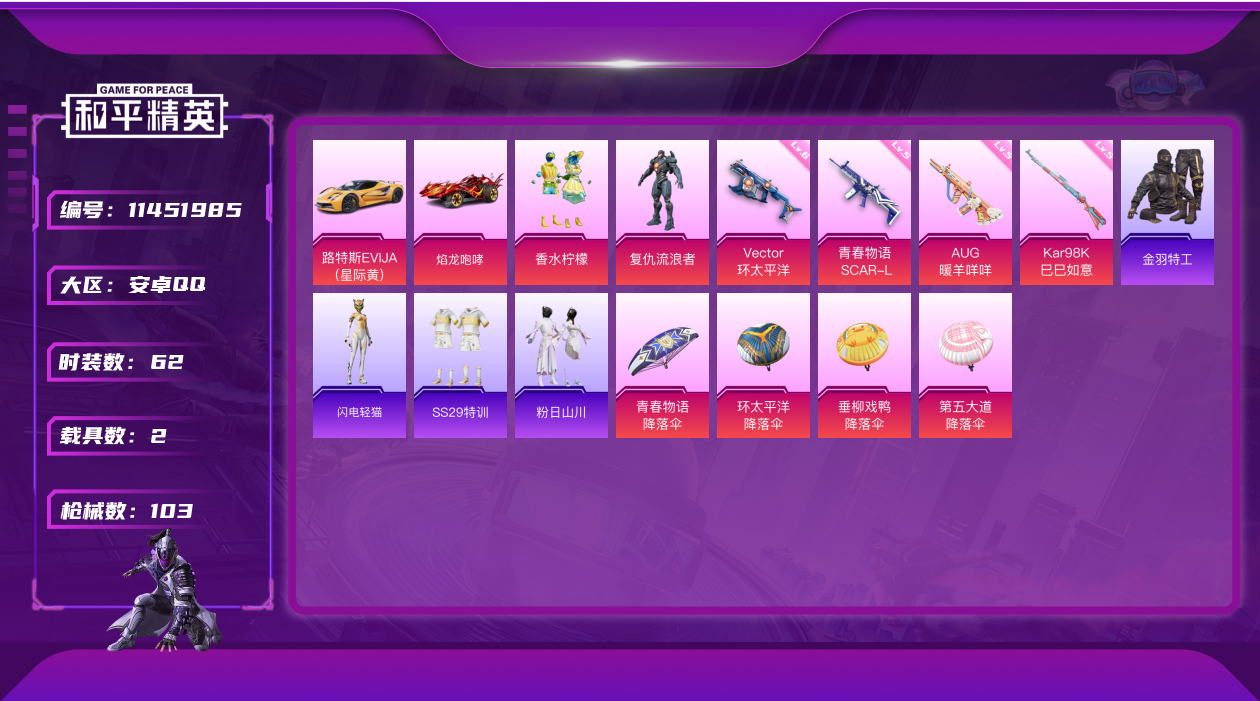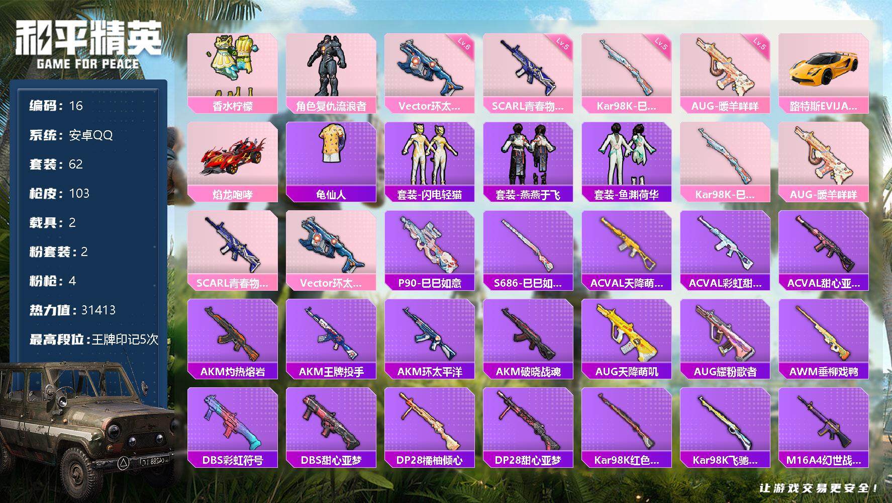 [11451985]【商品标题】:安卓 手Q-2粉装-4特效枪-2载具-31413热力值-5印记-62套装-103枪皮 【稀有载具】:路特斯EVIJA(星际黄),焰龙咆哮 【特效枪等级】:SCAR-L-青春物语(五级),AUG-暖羊咩咩(五级),Vector-环太平洋(六级),Kar98K-巳巳如意(五级) 【优质套装】:粉装-香水柠檬,角色-复仇流浪者 【稀有套装】:套装-龟仙人,套装-燕燕于飞,套装-鱼渊荷华,套装-闪电轻猫 【优质武器皮肤】:SCAR-L-青春物语,AUG-暖羊咩咩,Vector-环太平洋,Kar98K-巳巳如意 【稀有武器皮肤】:AKM-灼热熔岩,AKM-王牌投手,AKM-环太平洋,AKM-破晓战魂,M16A4-幻世战舞者,M16A4-甜心亚梦,M16A4-红色方程式,M16A4-蓝色火焰,SCAR-L-夜灯,SCAR-L-红色方程式,M416-糯团青竹,M416-红色方程式,M416-蓝色火焰,AUG-天降萌叽,AUG-耀粉歌者,QBZ-彩虹符号,QBZ-飞驰魅影,M762-天降萌叽,M762-彩虹符号,AC-VAL-天降萌叽,AC-VAL-彩虹甜喵,AC-VAL-甜心亚梦,蜜獾-垂柳戏鸭,蜜獾-天降萌叽,蜜獾-娇憨猪猪,UZI-娇憨猪猪,UZI-红色方程式,UMP45-涂山之恋,UMP45-蓝色火焰,汤姆逊-环太平洋,P90-筑梦精灵,P90-飞驰魅影,P90-巳巳如意,Kar98K-红色方程式,Kar98K-飞驰魅影,M24-炫彩节奏,AWM-垂柳戏鸭,SKS-炫彩节奏,Mini14-筑梦精灵,Mk14-海螺星光,SLR-娇憨猪猪,SLR-月影鸳鸯,QBU-飒粉甜心,S686-橘柚倾心,S686-生命誓言,S686-红色方程式,S686-巳巳如意,S1897-炫彩节奏,S1897-飞驰魅影,S12K-玩趣呆呆,S12K-破晓战魂,S12K-音爆索尼克,S12K-垂柳戏鸭,S12K-娇憨猪猪,S12K-幻世战舞者,DBS-彩虹符号,DBS-甜心亚梦,M249-彩虹符号,M249-破晓战魂,M249-糯团青竹,DP-28-橘柚倾心,DP-28-甜心亚梦,MG3-幻世战舞者,沙漠之鹰-旋转彩虹 【热门品类】:套装-金羽特工 【其他套装】:套装-SS19特训,套装-SS20特训,套装-SS21特训,套装-SS22特训,套装-SS23特训,套装-SS24特训,套装