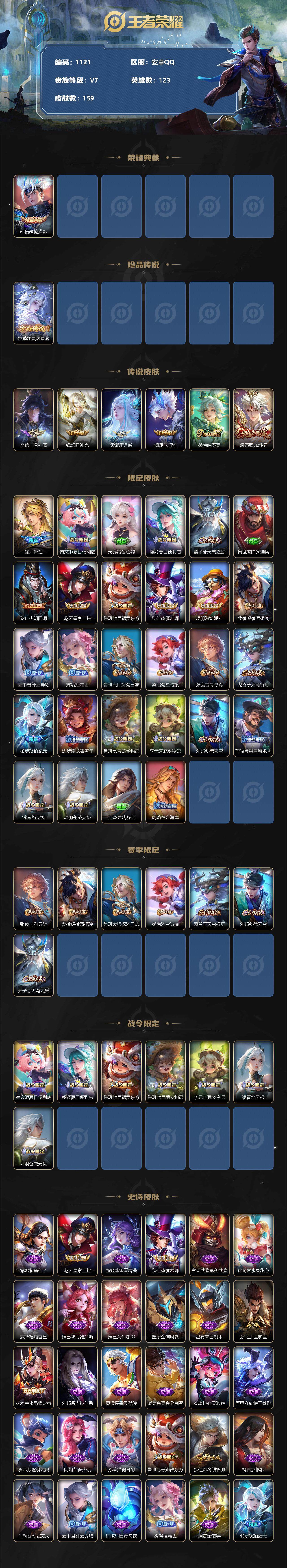 - PX_2089900-27 安卓QQ/至尊星耀/215皮肤/123英雄/0典藏/0珍品无双/0无双/1珍品传说/9传说/40史诗/8稀有英雄 【1 珍品传说】怪盗基德 马可波罗, 【9 传说皮肤】诗剑行 李白,异界灵契 孙尚香,炽翼辉光 伽罗,超时空战士 狄仁杰,山海·苍雷引 曜,愿照·九州拓 澜,牧神诗旅 庄周,鸣野蒿 桑启,云诺千山 公孙离, 【40 史诗皮肤】银河之约 李元芳,暗渊魔法 司马