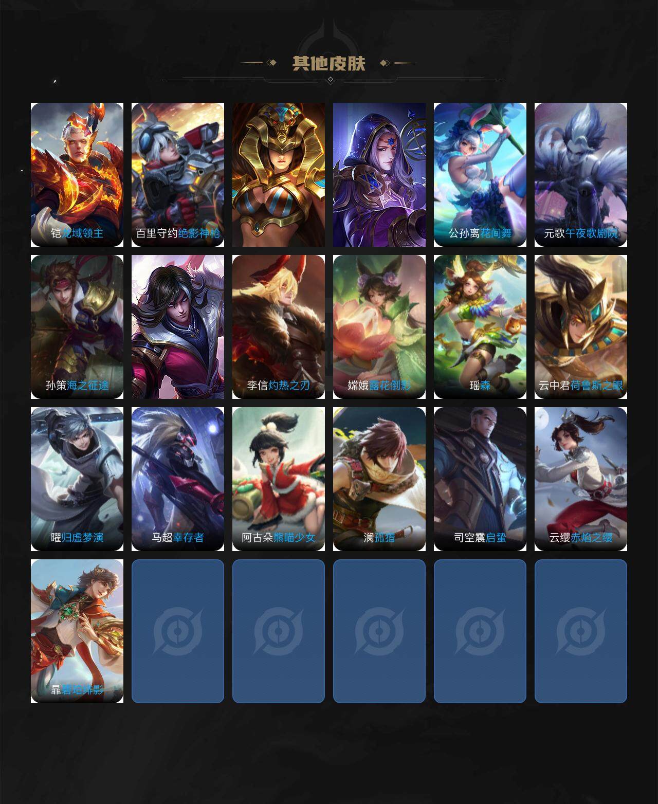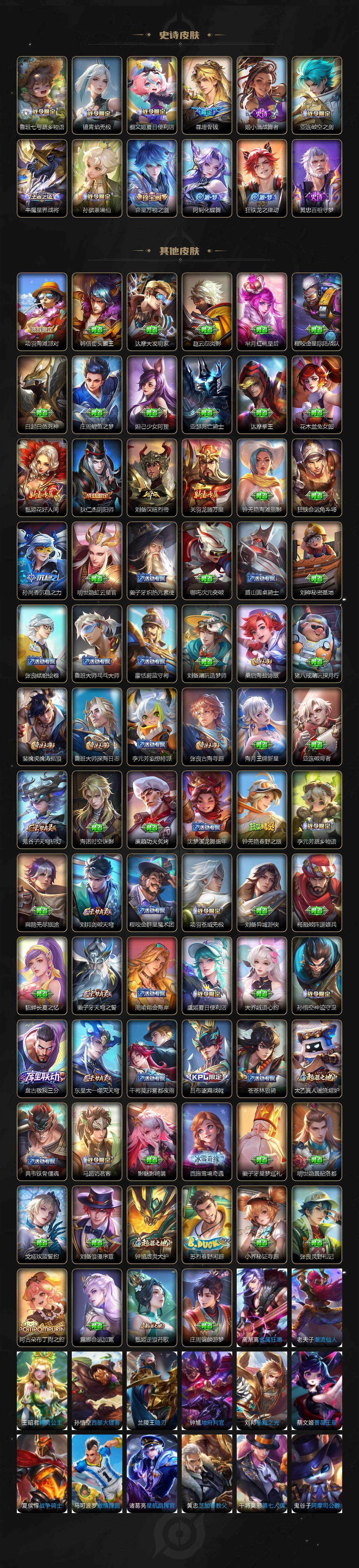 【史诗皮肤】:项羽苍穹之光,露娜紫霞仙子,赵云皇家上将,赵云未来纪元,甄姬冰雪圆舞曲,狄仁杰魔术师,宫本武藏鬼剑武藏,孙尚香水果甜心,嬴政暗夜贵公子,嬴政摇滚巨星,妲己魅力维加斯,妲己女仆咖啡,墨子金属风暴,吕布圣诞狂欢,曹操幽灵船长,李白千年之狐,吕布末日机甲,张飞乱世虎臣,韩信白龙吟,花木兰水晶猎龙者,刘邦德古拉伯爵,夏侯惇乘风破浪,小乔缤纷独角兽,兰陵王暗隐猎兽者,诸葛亮黄金分割率,雅典娜冰冠公主,铠曙光守护者,蔡文姬舞动绿茵,李元芳逐浪之夏,程咬金功夫厨神,白起星夜王子,阿轲节奏热浪,孙策猫狗日记,大乔猫狗日记,典韦蓝屏警告,狄仁杰鹰眼统帅,娜可露露晚萤,韩信飞衡,不知火舞魅语,橘右京修罗,马可波罗暗影游猎,裴擒虎李小龙,百里玄策热力回旋,