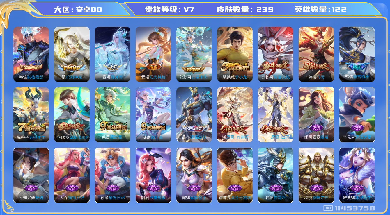 [11453758]【商品标题】:安卓Q-V4-尊贵铂金I段位-122英雄-239皮肤-1典藏-0珍品无双-0无双-0珍品传说-8传说-68史诗