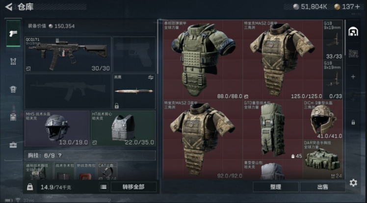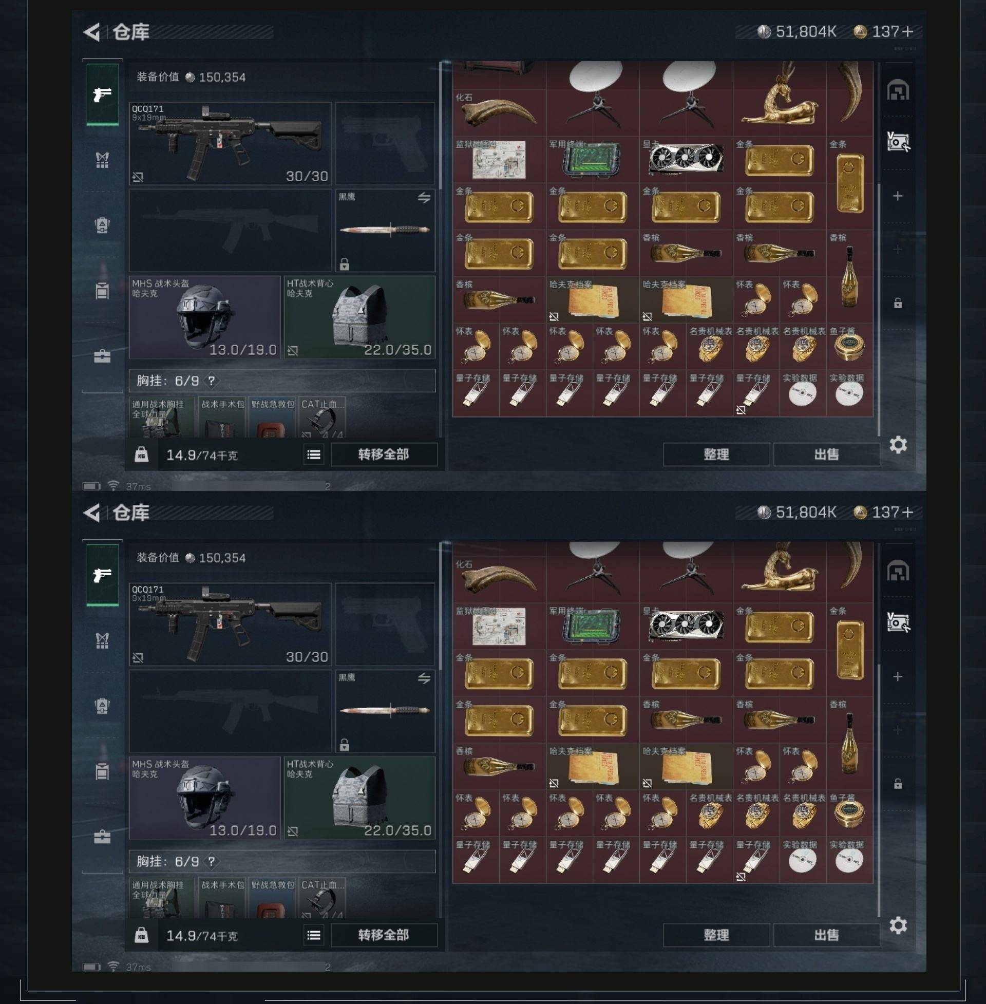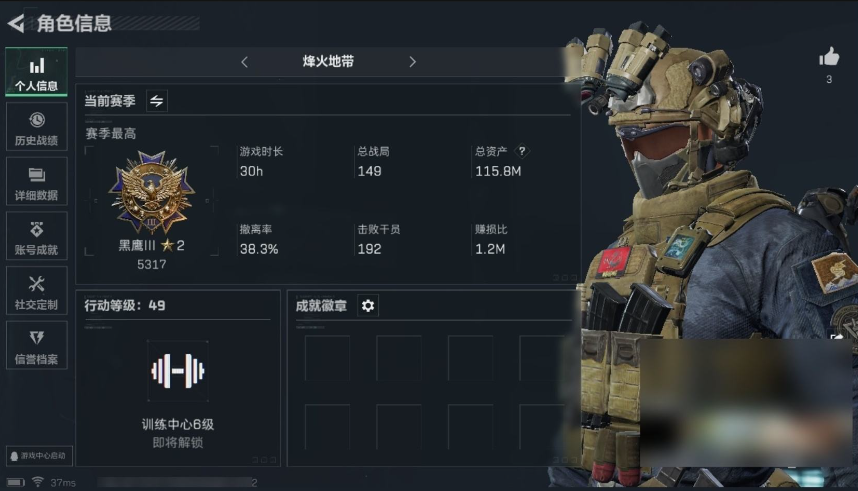 [10444638]总资产115M,哈夫币5180w,枪皮数量40,战场等级:1 无军衔,行动等级:49 黑鹰