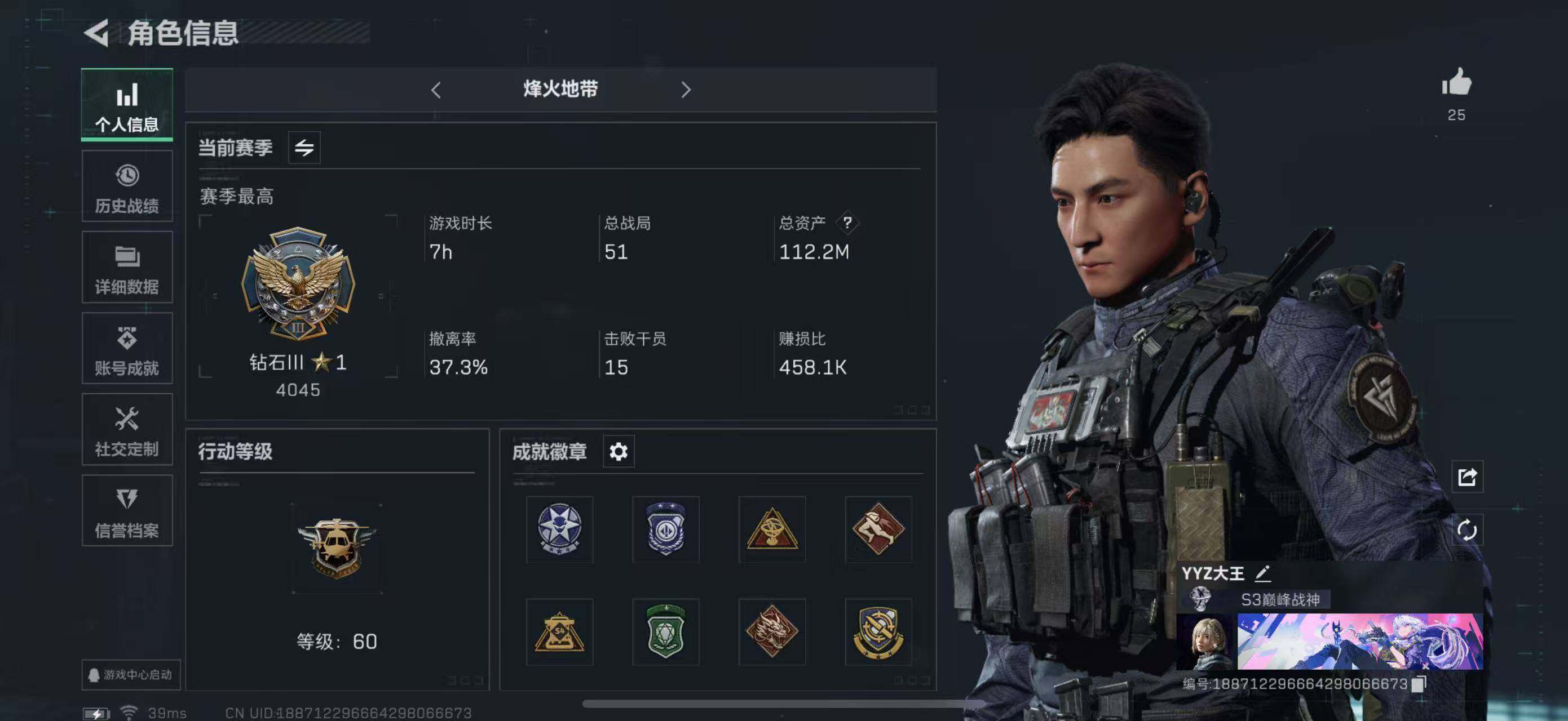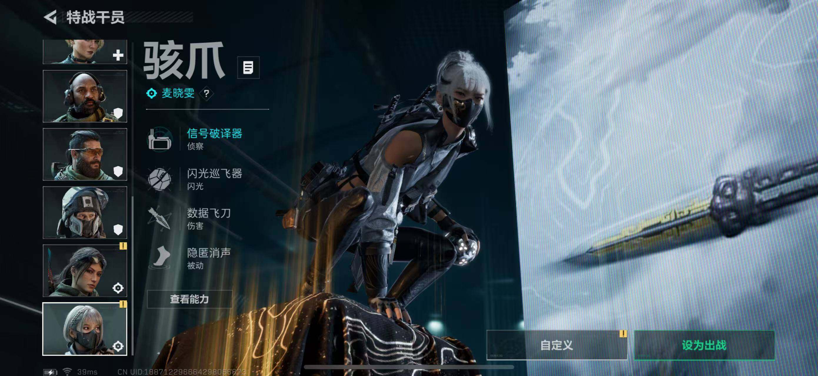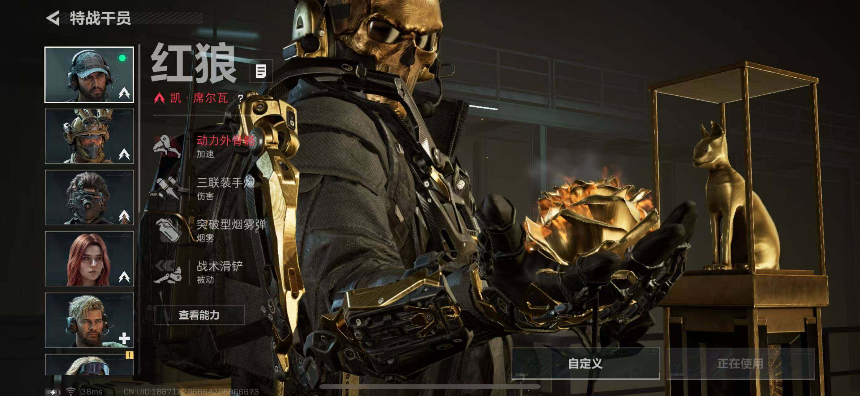 [11268240]总资产:112.2M,哈夫币:2874W,武器皮肤:2,钻石,【安全箱】基础安全箱;【特勤处等级】仓库LV.6,靶场LV.4,训练中心LV.4;【干员皮肤】红狼蚀金玫瑰,骇爪水墨云图;【近战武器】近战武器-影锋,近战武器-黑鹰;【可二次实名】