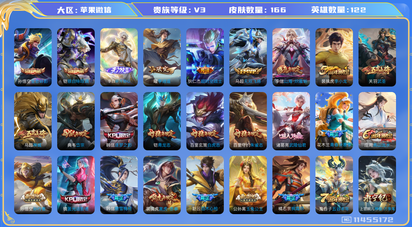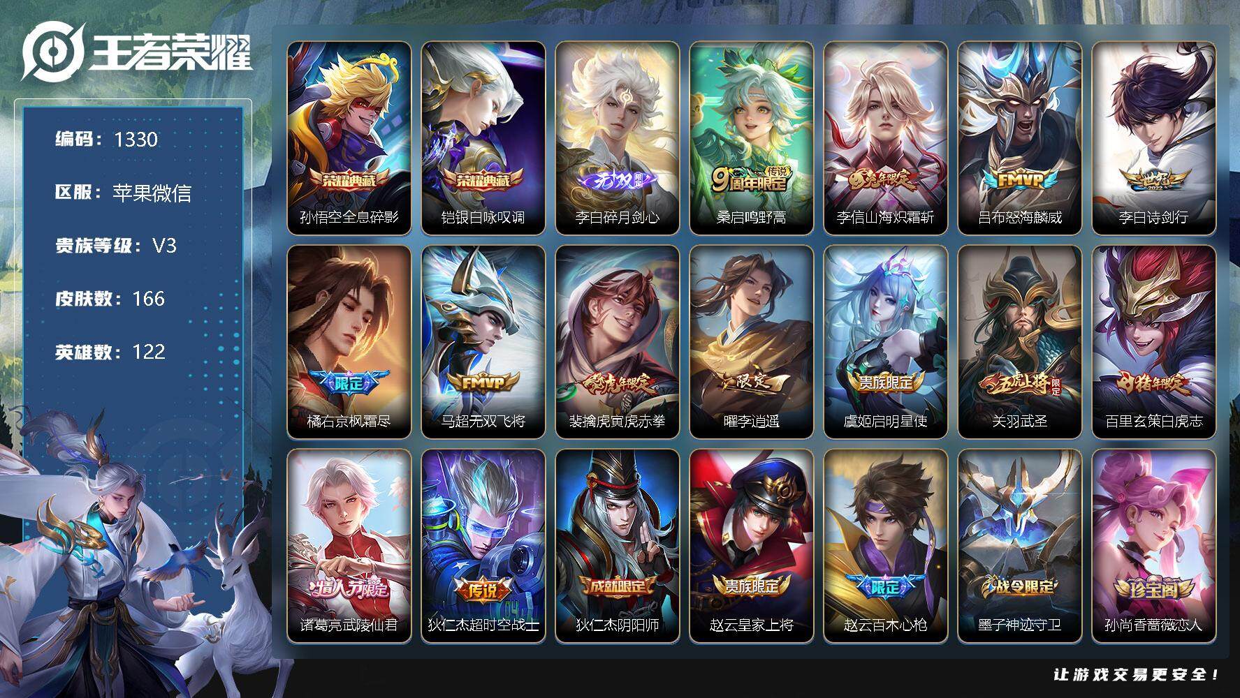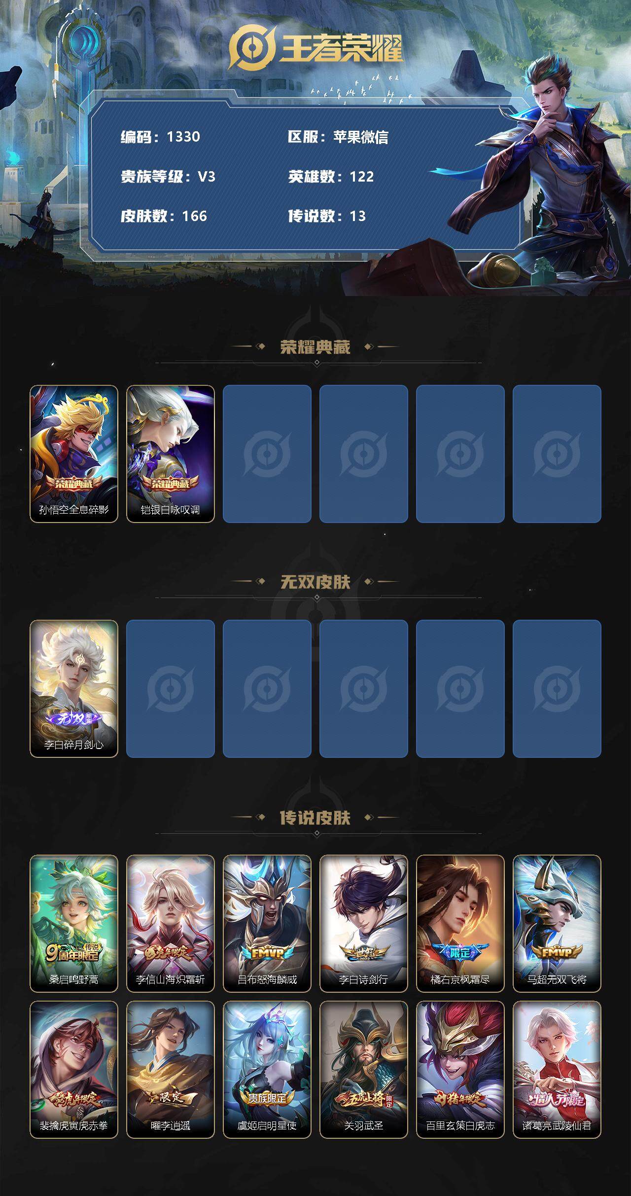 [11455172]【商品标题】:苹果WX-V3-尊贵铂金IV段位-122英雄-166皮肤-2典藏-0珍品无双-1无双-0珍品传说-13传说-60史诗