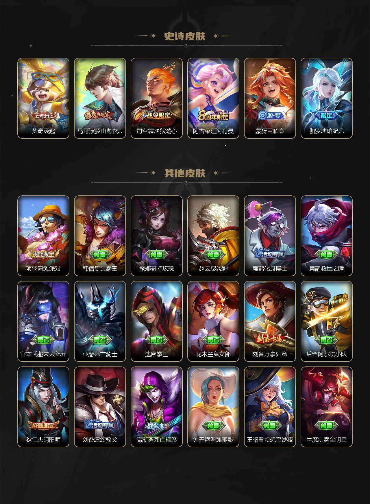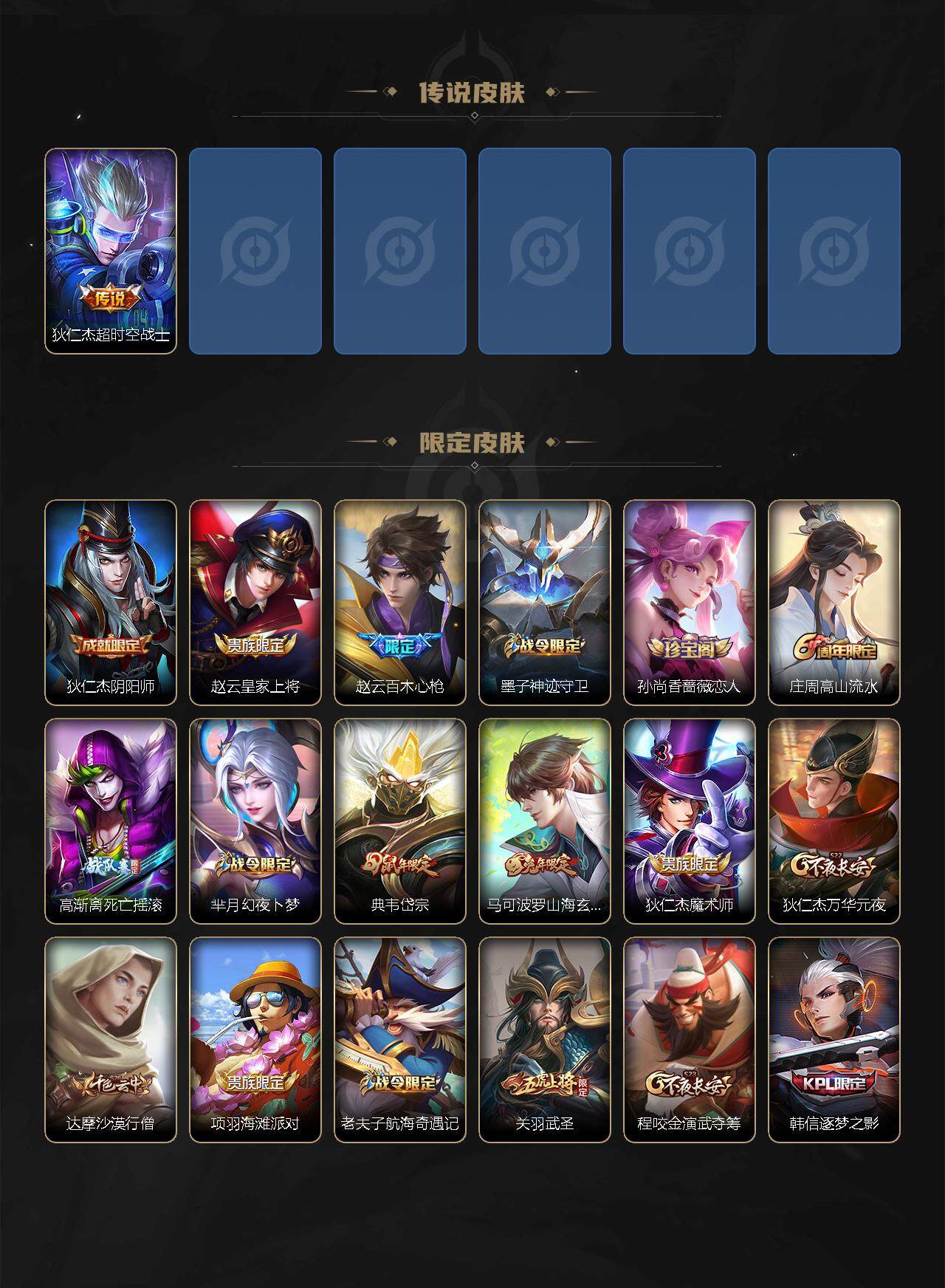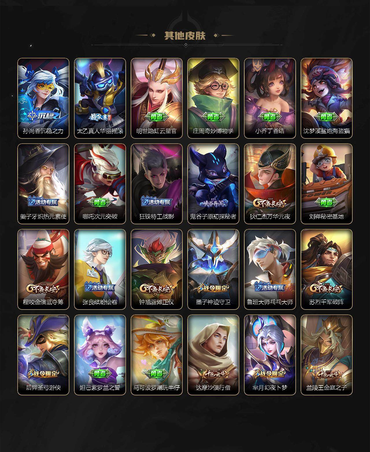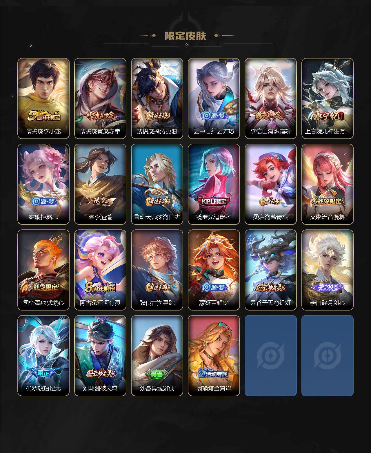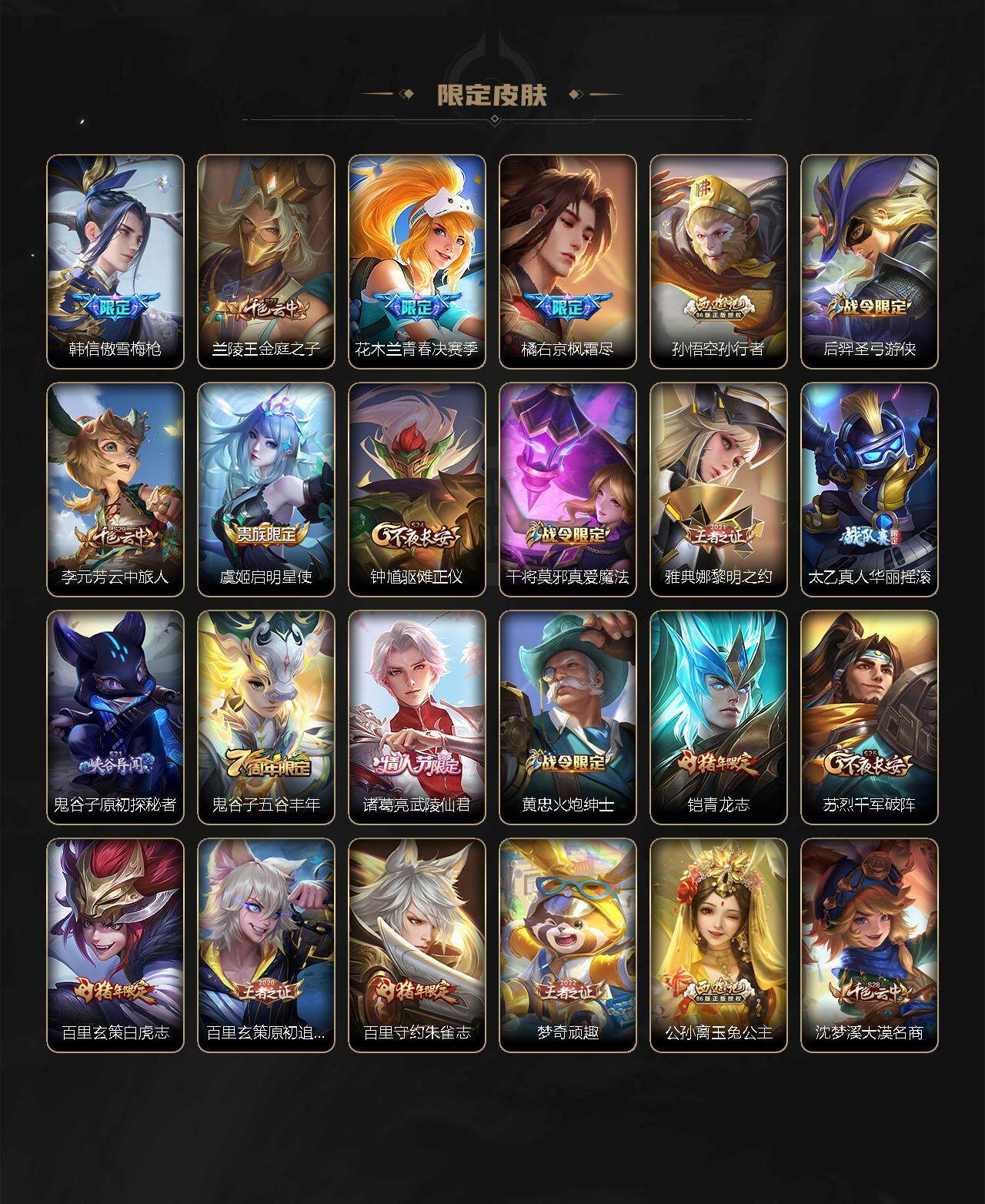 【限定皮肤】:狄仁杰阴阳师,赵云皇家上将,赵云百木心枪,墨子神迹守卫,孙尚香蔷薇恋人,庄周高山流水,高渐离死亡摇滚,芈月幻夜卜梦,典韦岱宗,马可波罗山海玄木吟,狄仁杰魔术师,狄仁杰万华元夜,达摩沙漠行僧,项羽海滩派对,老夫子航海奇遇记,关羽武圣,程咬金演武夺筹,韩信逐梦之影,韩信傲雪梅枪,兰陵王金庭之子,花木兰青春决赛季,橘右京枫霜尽,孙悟空孙行者,后羿圣弓游侠,李元芳云中旅人,虞姬启明星使,钟馗驱傩正仪,干将莫邪真爱魔法,雅典娜黎明之约,太乙真人华丽摇滚,鬼谷子原初探秘者,鬼谷子五谷丰年,诸葛亮武陵仙君,黄忠火炮绅士,铠青龙志,苏烈千军破阵,百里玄策白虎志,百里玄策原初追逐者,百里守约朱雀志,梦奇顽趣,公孙离玉兔公主,沈梦溪大漠名商,裴擒虎李小龙,裴擒虎寅虎赤拳,裴擒虎擒涛扼浪,云中君纤云弄巧,李信山海炽霜斩,上官婉儿神器万象笔,嫦娥拒霜思,曜李逍遥 ,鲁班大师探海日志,镜匿光追影者,桑启海盐诗旅,艾琳流音漫舞,司空震地狱燃心,阿古朵江河有灵,张良古海寻踪,蒙犽百解令,鬼谷子天穹祈灯,李白碎月剑心,伽罗琥珀纪元,刘邦剑破天穹,刘备异域游侠,周瑜熔金海岸