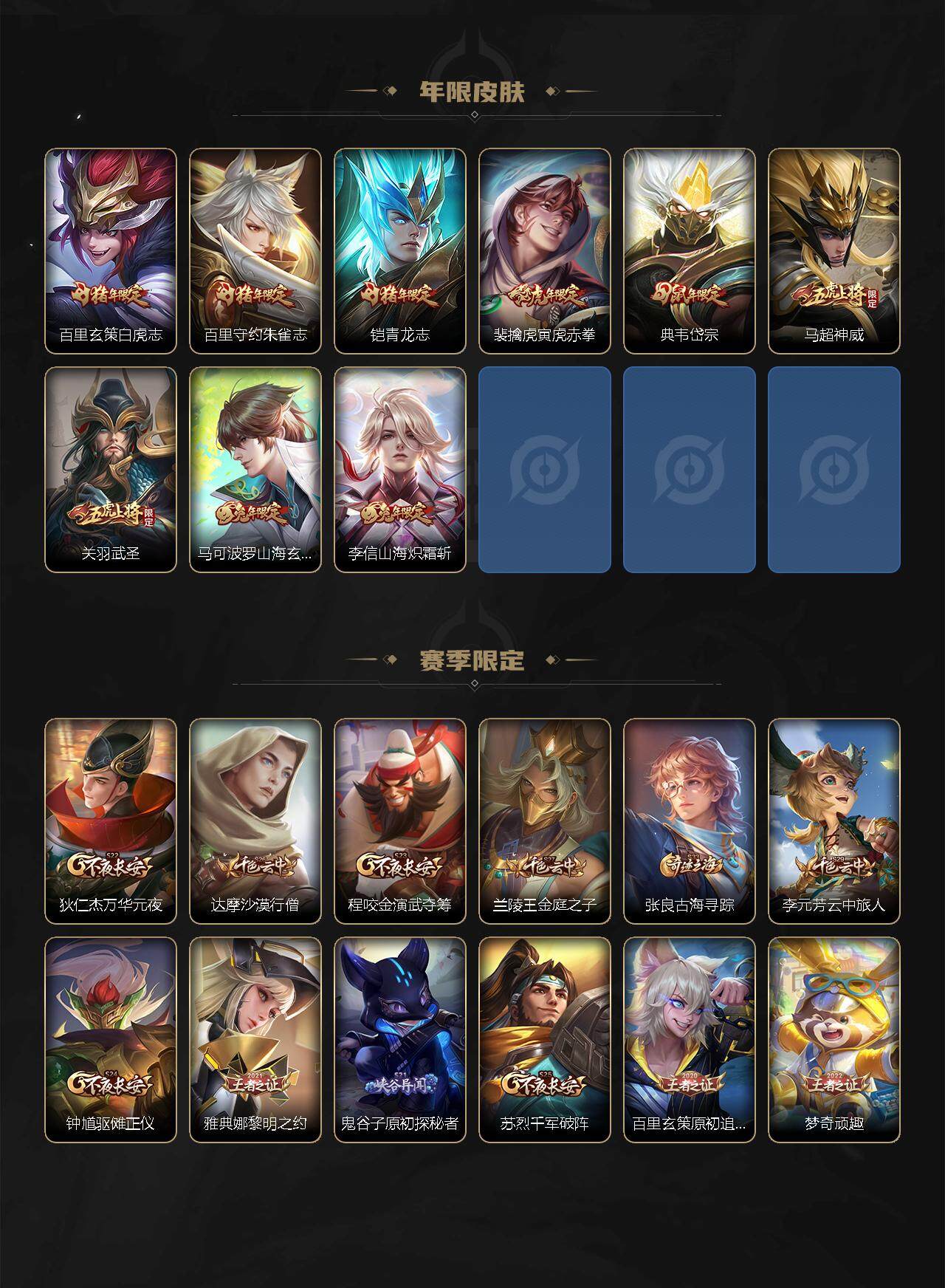 【年限皮肤】:百里玄策白虎志,百里守约朱雀志,铠青龙志,裴擒虎寅虎赤拳,典韦岱宗,马超神威,关羽武圣,马可波罗山海玄木吟,李信山海炽霜斩