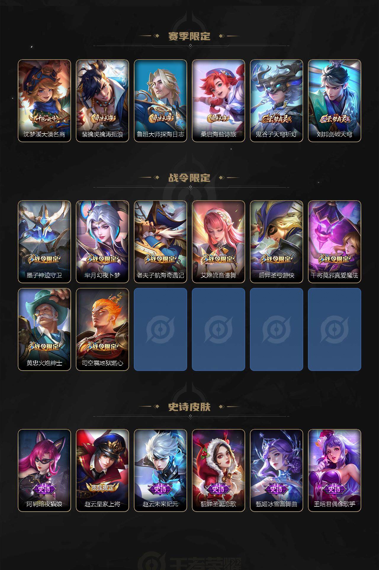 【赛季限定】:狄仁杰万华元夜,达摩沙漠行僧,程咬金演武夺筹,兰陵王金庭之子,张良古海寻踪,李元芳云中旅人,钟馗驱傩正仪,雅典娜黎明之约,鬼谷子原初探秘者,苏烈千军破阵,百里玄策原初追逐者,梦奇顽趣,沈梦溪大漠名商,裴擒虎擒涛扼浪,鲁班大师探海日志,桑启海盐诗旅,鬼谷子天穹祈灯,刘邦剑破天穹