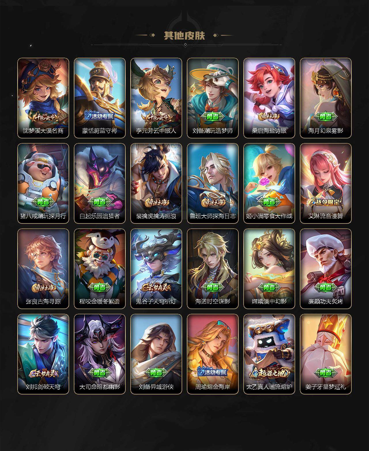 裴擒虎李小龙,关羽武圣,马超神威,典韦岱宗,韩信逐梦之影,铠青龙志,百里玄策白虎志,百里守约朱雀志,花木兰青春决赛季,孙悟空孙行者,镜匿光追影者,韩信傲雪梅枪,裴擒虎寅虎·赤拳,赵云百木心枪,公孙离玉兔公主,橘右京枫霜尽,上官婉儿神器·万象笔,李白诗剑行,马可波罗山海·玄木吟,桑启鸣野蒿