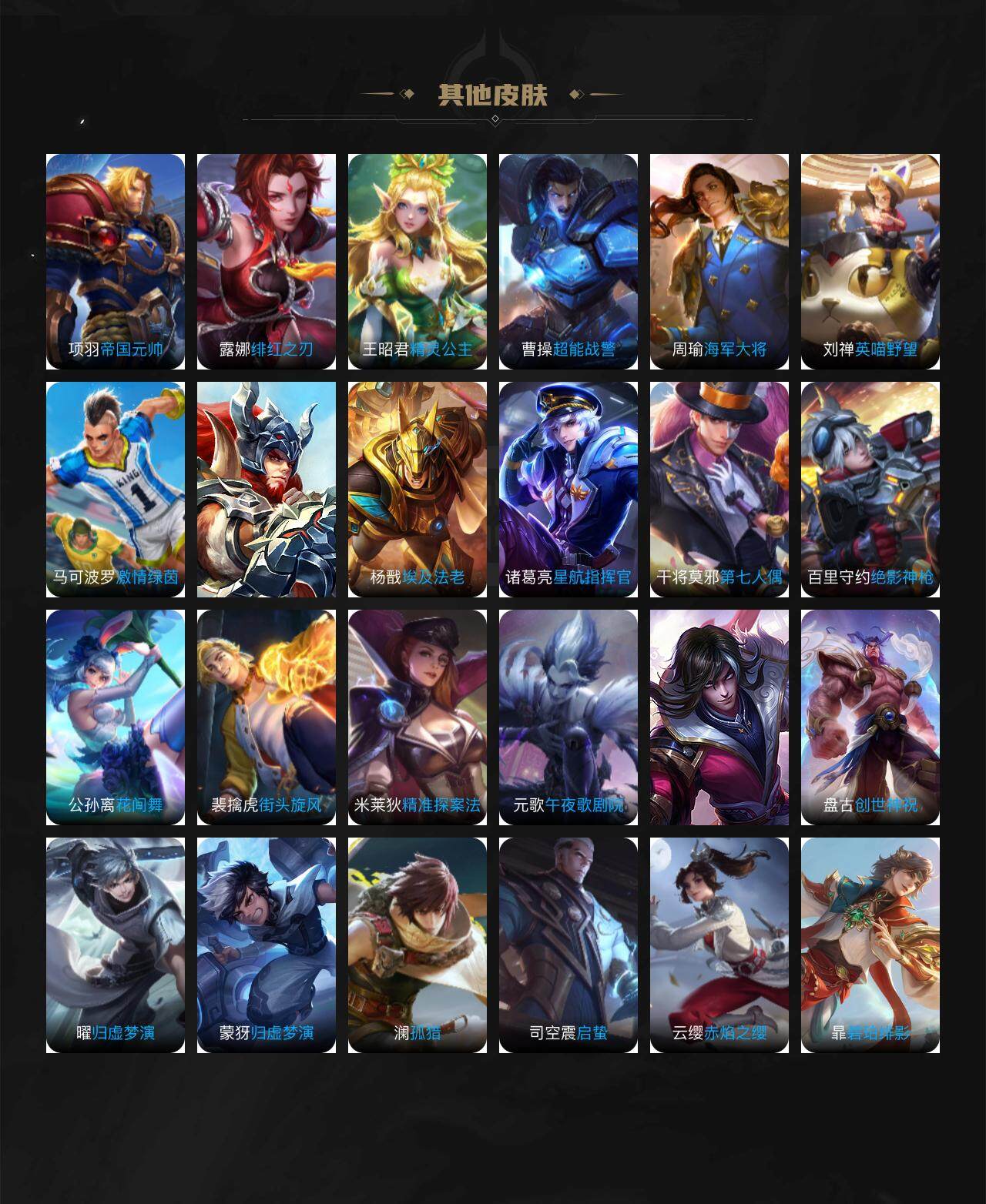 娜可露露晚萤,李元芳逐浪之夏,孙策猫狗日记,阿轲节奏热浪,王昭君偶像歌手,韩信白龙吟,阿轲暗夜猫娘,橘右京修罗,刘禅天才门将,白起星夜王子,安琪拉心灵骇客,刘邦德古拉伯爵,兰陵王暗隐猎兽者,曹操幽灵船长,宫本武藏鬼剑武藏,司马懿暗渊魔法,亚瑟心灵战警,蔡文姬舞动绿茵,墨子金属风暴,百里玄策原初追逐者,吕布圣诞狂欢,貂蝉圣诞恋歌,嫦娥拒霜思,雅典娜黎明之约,李白千年之狐,澜赏金猎手,貂蝉唤灵魅影,蒙犽百解令,伽罗琥珀纪元