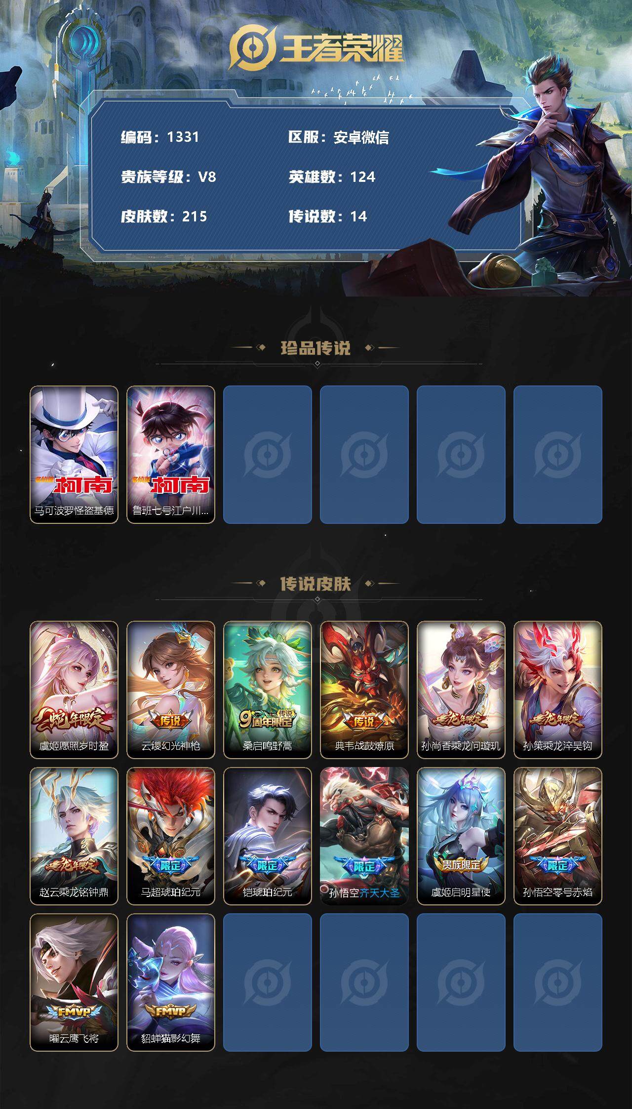 [11455251]【商品标题】:安卓WX-V8-至尊星耀I段位-124英雄-215皮肤-0典藏-0珍品无双-0无双-2珍品传说-14传说-70史诗 【珍品传说】:马可波罗怪盗基德,鲁班七号江户川柯南 【传说皮肤】:虞姬愿照岁时盈,云缨幻光神枪,桑启鸣野蒿,典韦战鼓燎原,孙尚香乘龙问璇玑,孙策乘龙淬吴钩,赵云乘龙铭钟鼎,马超琥珀纪元,铠琥珀纪元,孙悟空齐天大圣,虞姬启明星使,孙悟空零号赤焰,曜云鹰飞将,貂蝉猫影幻舞 【限定皮肤】:暃埋骨钱,蔡文姬夏日便利店,大乔绒语心约,虞姬夏日便利店,姜子牙天穹之誓,李白谪仙醉月,狄仁杰阴阳师,赵云皇家上将,庄周高山流水,高渐离死亡摇滚,阿轲迷踪丽影,吕布猎兽之王,元歌无心,典韦蓝屏警告,狄仁杰魔术师,项羽海滩派对,兰陵王驯魔猎人,孙悟空零号赤焰,孙悟空孙行者,孙悟空齐天大圣,李元芳银河之约,李元芳云中旅人,虞姬启明星使,杨戬潮玩骑兵,雅典娜黎明之约,蔡文姬奇迹圣诞,鬼谷子五谷丰年,梦奇顽趣,沈梦溪大漠名商,裴擒虎擒涛扼浪,云中君纤云弄巧,嫦娥拒霜思,鲁班大师探海日志,桑启海盐诗旅,阿古朵江河有灵,张良古海寻踪,蒙犽百解令,蒙恬荣光圣徽,高渐离燃音魔法,妲己灵卜魔法,鬼谷子天穹祈灯,伽罗琥珀纪元,铠琥珀纪元,马超琥珀纪元,姬小满妄想食味,大乔乘龙忆丹青,安琪拉乘龙聚宝船,孙尚香乘龙问璇玑,孙策乘龙淬吴钩,赵云乘龙铭钟鼎,沈梦溪龙舞盛年,鲁班七号蔬乡物语,李元芳蔬乡物语,刘邦剑破天穹,程咬金群星魔术团,周瑜熔金海岸 【年限皮肤】:大乔乘龙忆丹青,安琪拉乘龙聚宝船,孙尚香乘龙问璇玑,孙策乘龙淬吴钩,赵云乘龙铭钟鼎 【赛季限定】:张良古海寻踪,李元芳云中旅人,雅典娜黎明之约,梦奇顽趣,沈梦溪大漠名商,裴擒虎擒涛扼浪,鲁班大师探海日志,桑启海盐诗旅,鬼谷子天穹祈灯,蒙恬荣光圣徽,刘邦剑破天穹,姜子牙天穹之誓 【战令限定】:蔡文姬夏日便利店,虞姬夏日便利店,阿轲迷踪丽影,吕布猎兽之王,典韦蓝屏警告,兰陵王驯魔猎人,李元芳银河之约,杨戬潮玩骑兵,高渐离燃音魔法,妲己灵卜魔法,鲁班七号蔬乡物语,李元芳蔬乡物语 【史诗皮肤】:露娜紫霞仙子,赵云皇家上将,赵云未来纪元,貂蝉圣诞恋歌,甄姬冰雪圆舞曲,王昭君偶像歌手,狄仁杰魔术师,宫本武藏鬼剑武藏,孙尚香水果甜心,嬴政摇滚巨星,妲己魅力维加斯,妲己女仆咖啡,墨子金属风暴,曹操幽灵船长,李白千年之狐,花木兰水晶猎龙者,刘