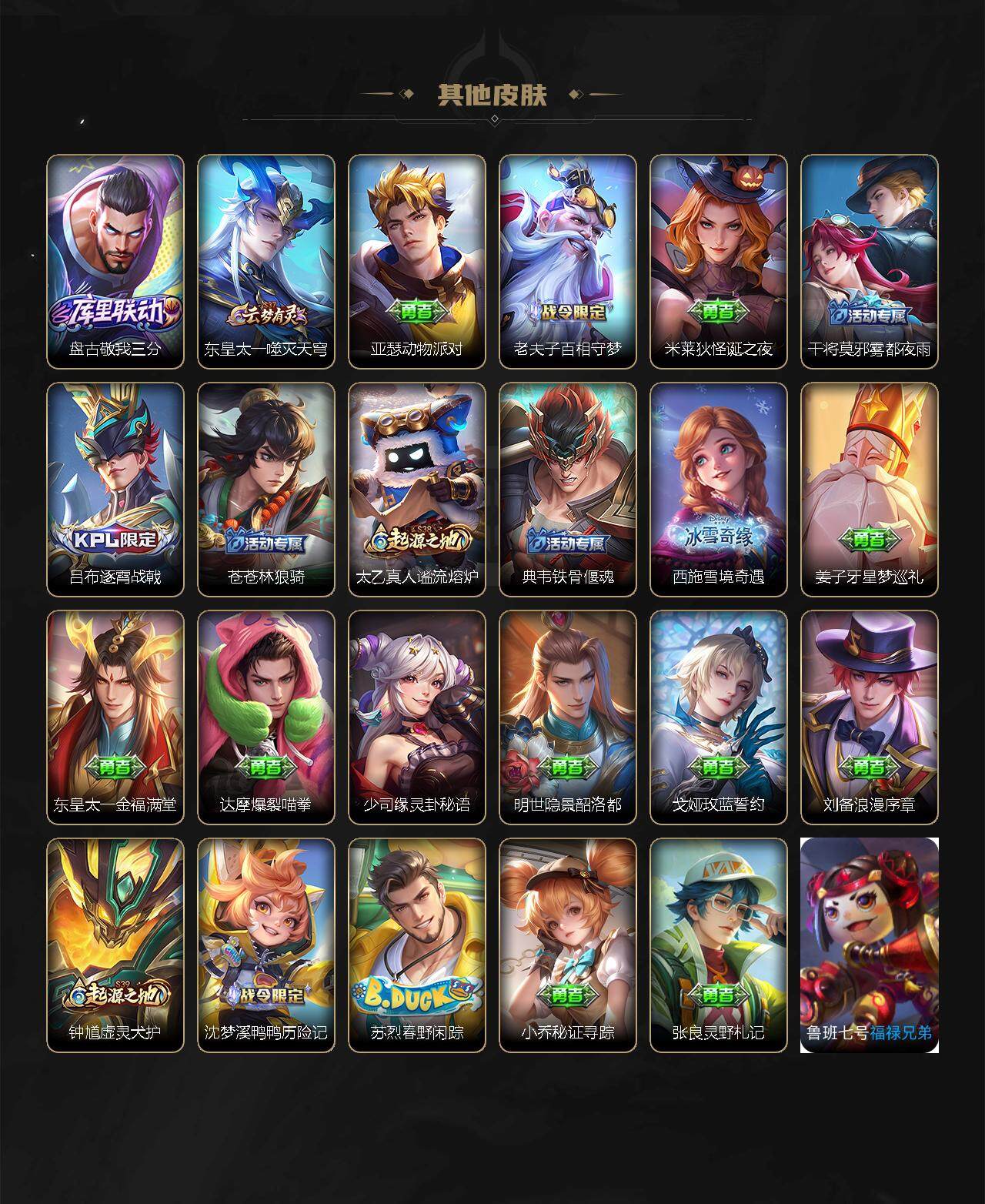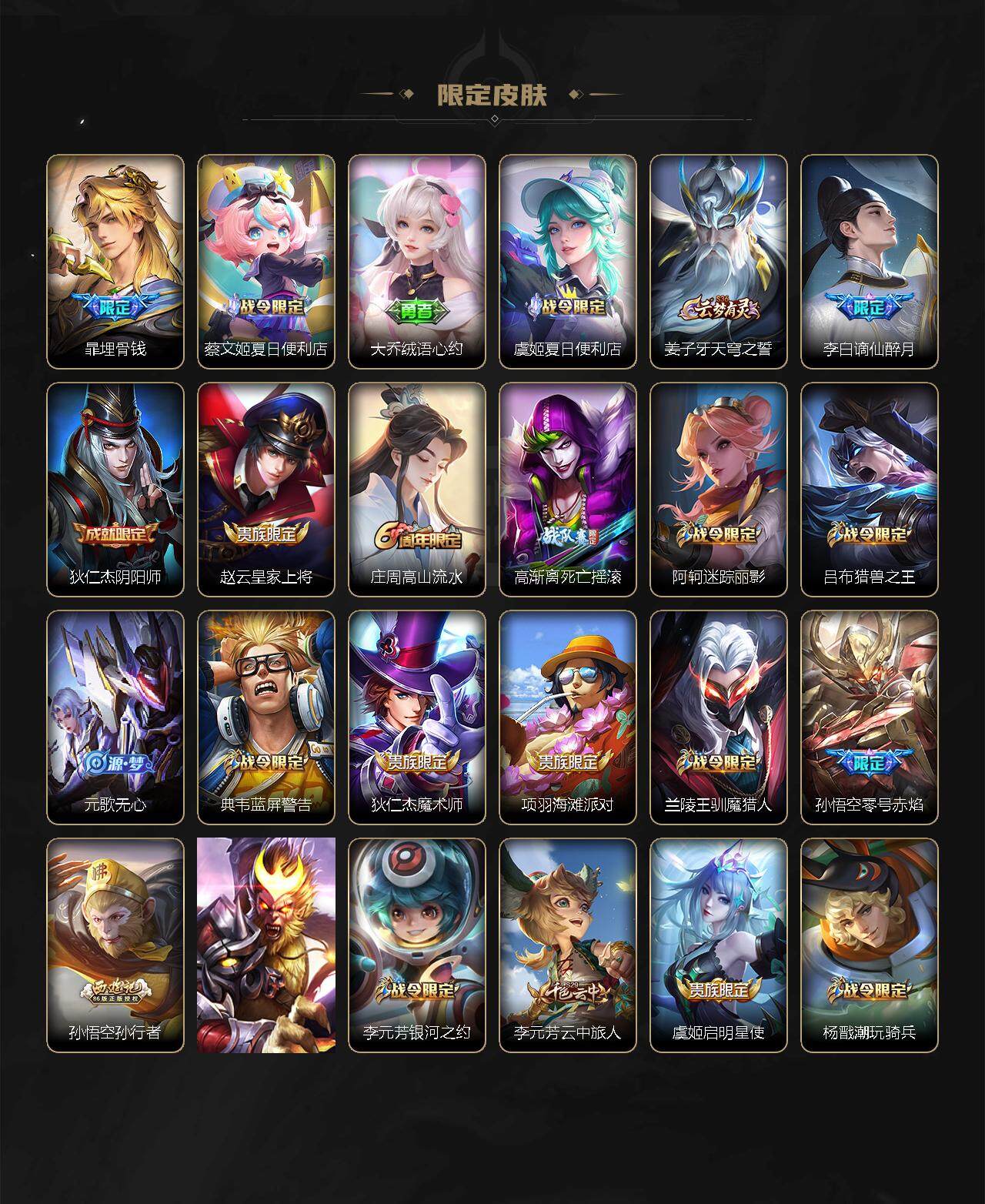 【限定皮肤】:暃埋骨钱,蔡文姬夏日便利店,大乔绒语心约,虞姬夏日便利店,姜子牙天穹之誓,李白谪仙醉月,狄仁杰阴阳师,赵云皇家上将,庄周高山流水,高渐离死亡摇滚,阿轲迷踪丽影,吕布猎兽之王,元歌无心,典韦蓝屏警告,狄仁杰魔术师,项羽海滩派对,兰陵王驯魔猎人,孙悟空零号赤焰,孙悟空孙行者,孙悟空齐天大圣,李元芳银河之约,李元芳云中旅人,虞姬启明星使,杨戬潮玩骑兵,雅典娜黎明之约,蔡文姬奇迹圣诞,鬼谷子五谷丰年,梦奇顽趣,沈梦溪大漠名商,裴擒虎擒涛扼浪,云中君纤云弄巧,嫦娥拒霜思,鲁班大师探海日志,桑启海盐诗旅,阿古朵江河有灵,张良古海寻踪,蒙犽百解令,蒙恬荣光圣徽,高渐离燃音魔法,妲己灵卜魔法,鬼谷子天穹祈灯,伽罗琥珀纪元,铠琥珀纪元,马超琥珀纪元,姬小满妄想食味,大乔乘龙忆丹青,安琪拉乘龙聚宝船,孙尚香乘龙问璇玑,孙策乘龙淬吴钩,赵云乘龙铭钟鼎,沈梦溪龙舞盛年,鲁班七号蔬乡物语,李元芳蔬乡物语,刘邦剑破天穹,程咬金群星魔术团,周瑜熔金海岸