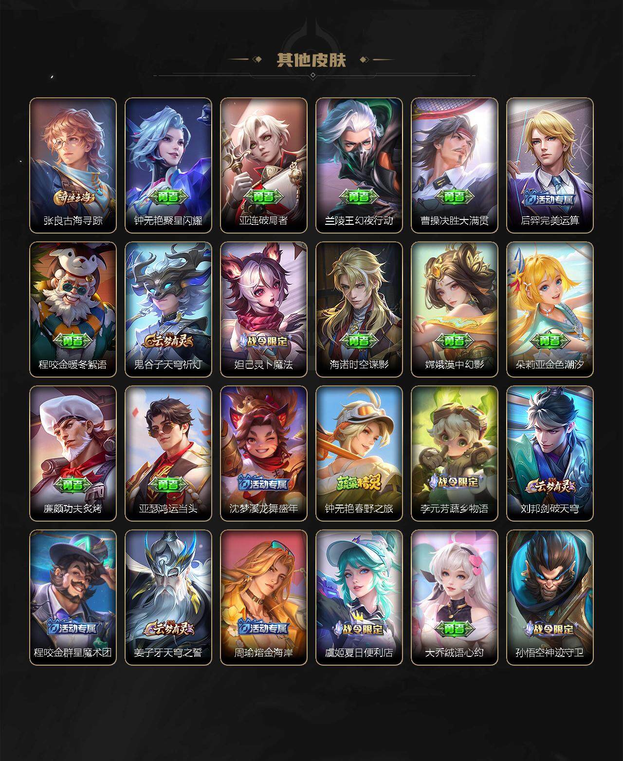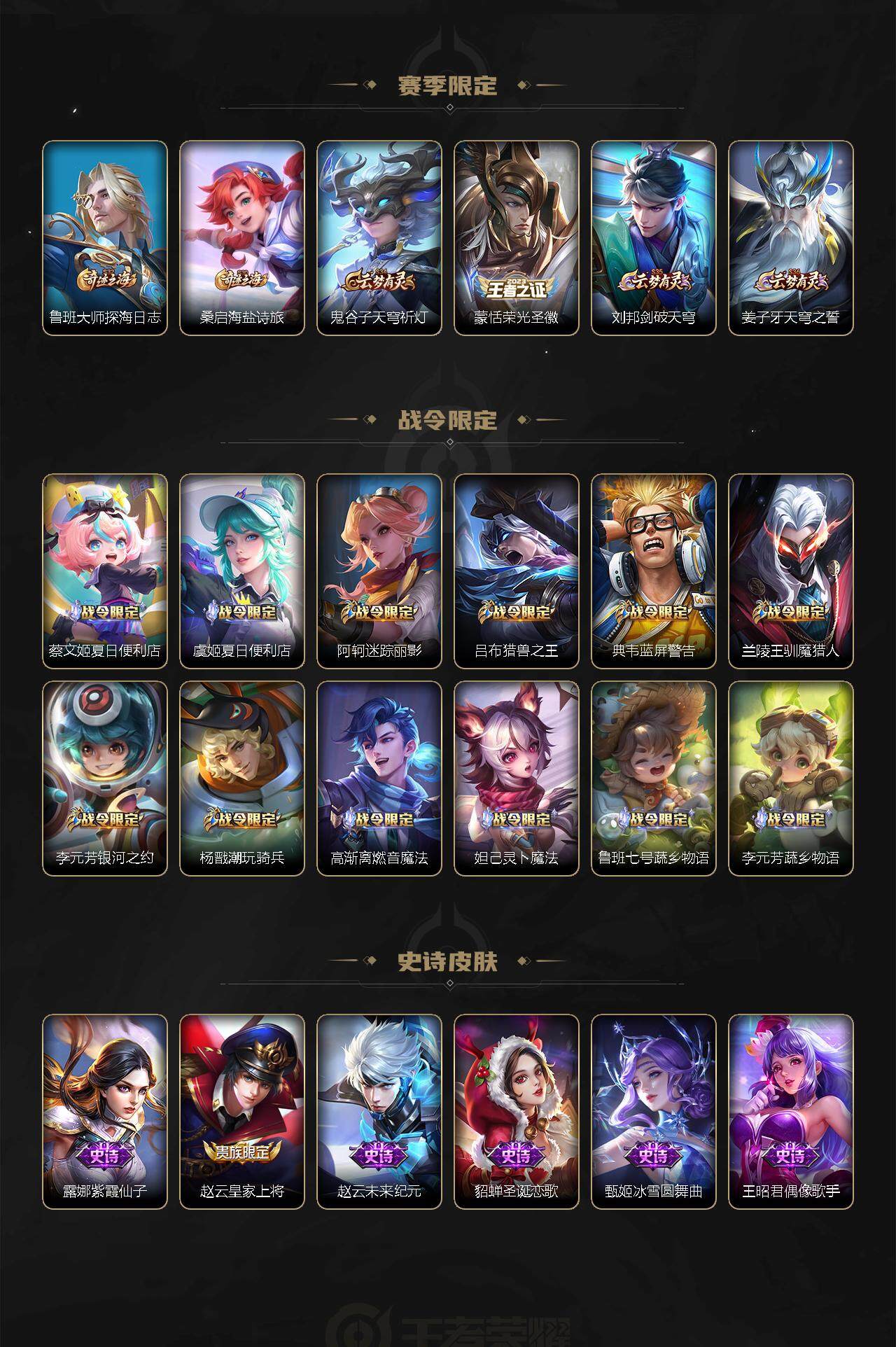 【赛季限定】:张良古海寻踪,李元芳云中旅人,雅典娜黎明之约,梦奇顽趣,沈梦溪大漠名商,裴擒虎擒涛扼浪,鲁班大师探海日志,桑启海盐诗旅,鬼谷子天穹祈灯,蒙恬荣光圣徽,刘邦剑破天穹,姜子牙天穹之誓