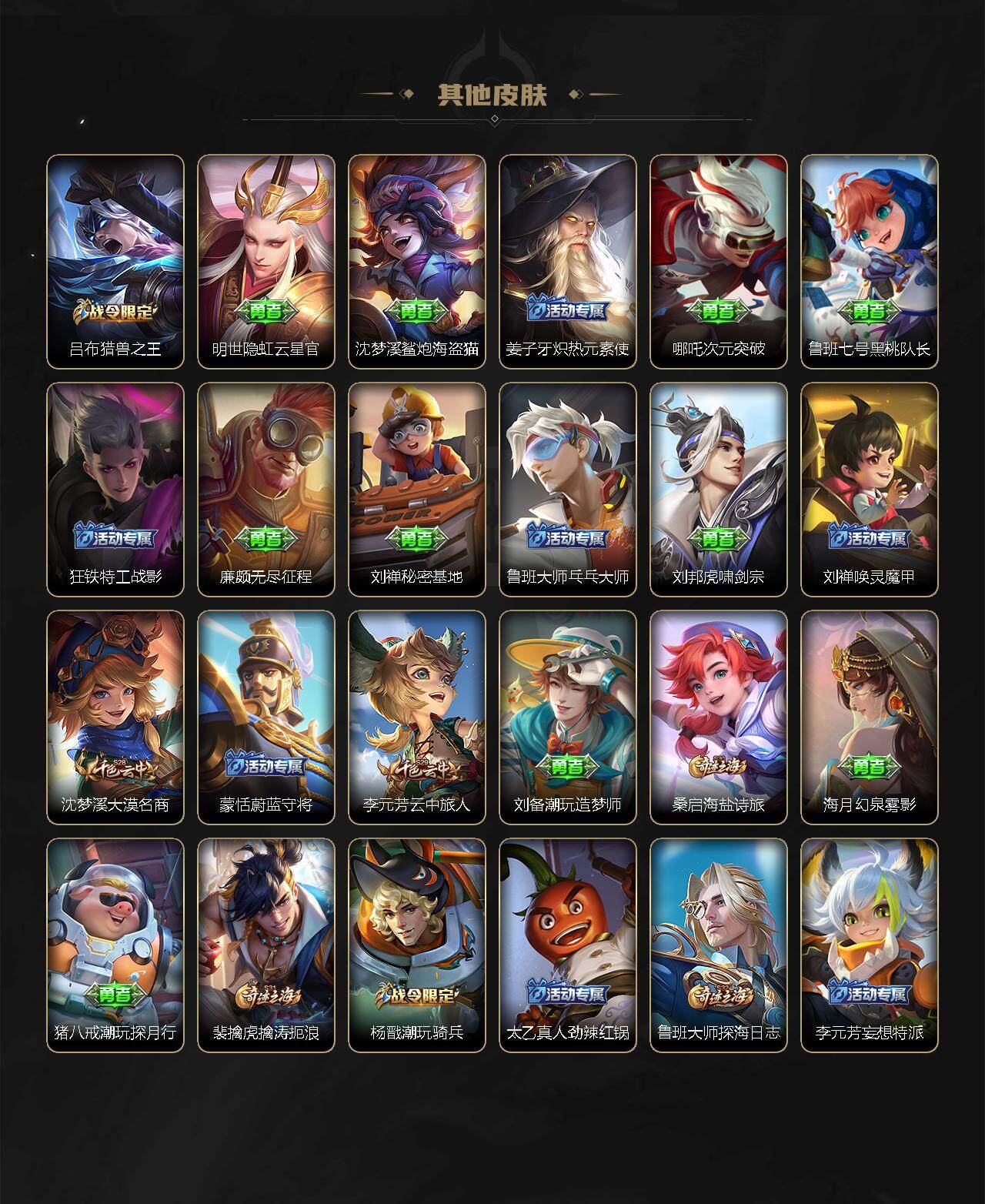 李元芳逐浪之夏,孙策猫狗日记,阿轲节奏热浪,露娜紫霞仙子,王昭君偶像歌手,橘右京修罗,嬴政摇滚巨星,刘禅天才门将,白起星夜王子,安琪拉心灵骇客,刘邦德古拉伯爵,兰陵王暗隐猎兽者,曹操幽灵船长,宫本武藏鬼剑武藏,亚瑟心灵战警,钟馗乐园奇幻夜,蔡文姬舞动绿茵,小乔缤纷独角兽,花木兰水晶猎龙者,铠曙光守护者,墨子金属风暴,貂蝉圣诞恋歌,百里守约特工魅影,嫦娥拒霜思,雅典娜黎明之约,李白千年之狐,夏洛特永昼,貂蝉唤灵魅影,蒙犽百解令,高渐离燃音魔法,伽罗琥珀纪元,大乔乘龙·忆丹青,安琪拉乘龙·聚宝船,李白谪仙醉月,赵怀真器灵·浮梦炉