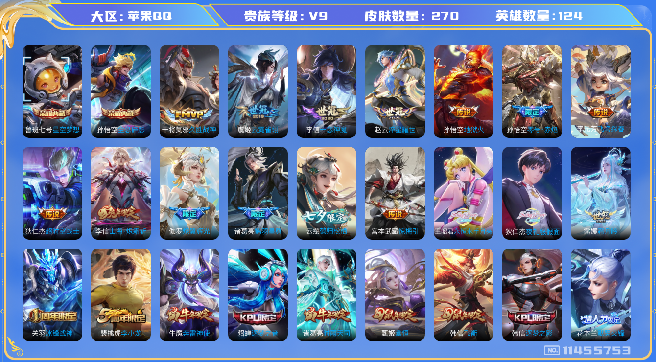 [11455753]【商品标题】:苹果Q-V9-至尊星耀IV段位-124英雄-270皮肤-2典藏-0珍品无双-0无双-0珍品传说-23传说-62史诗