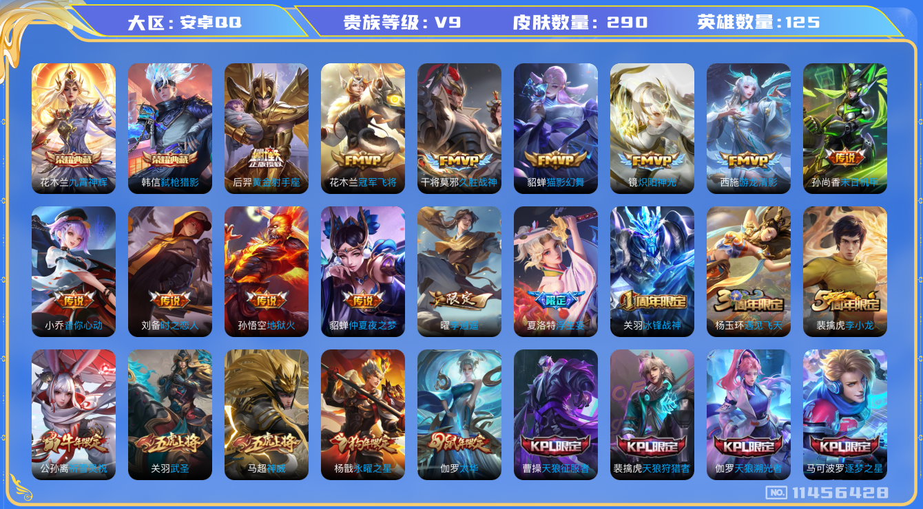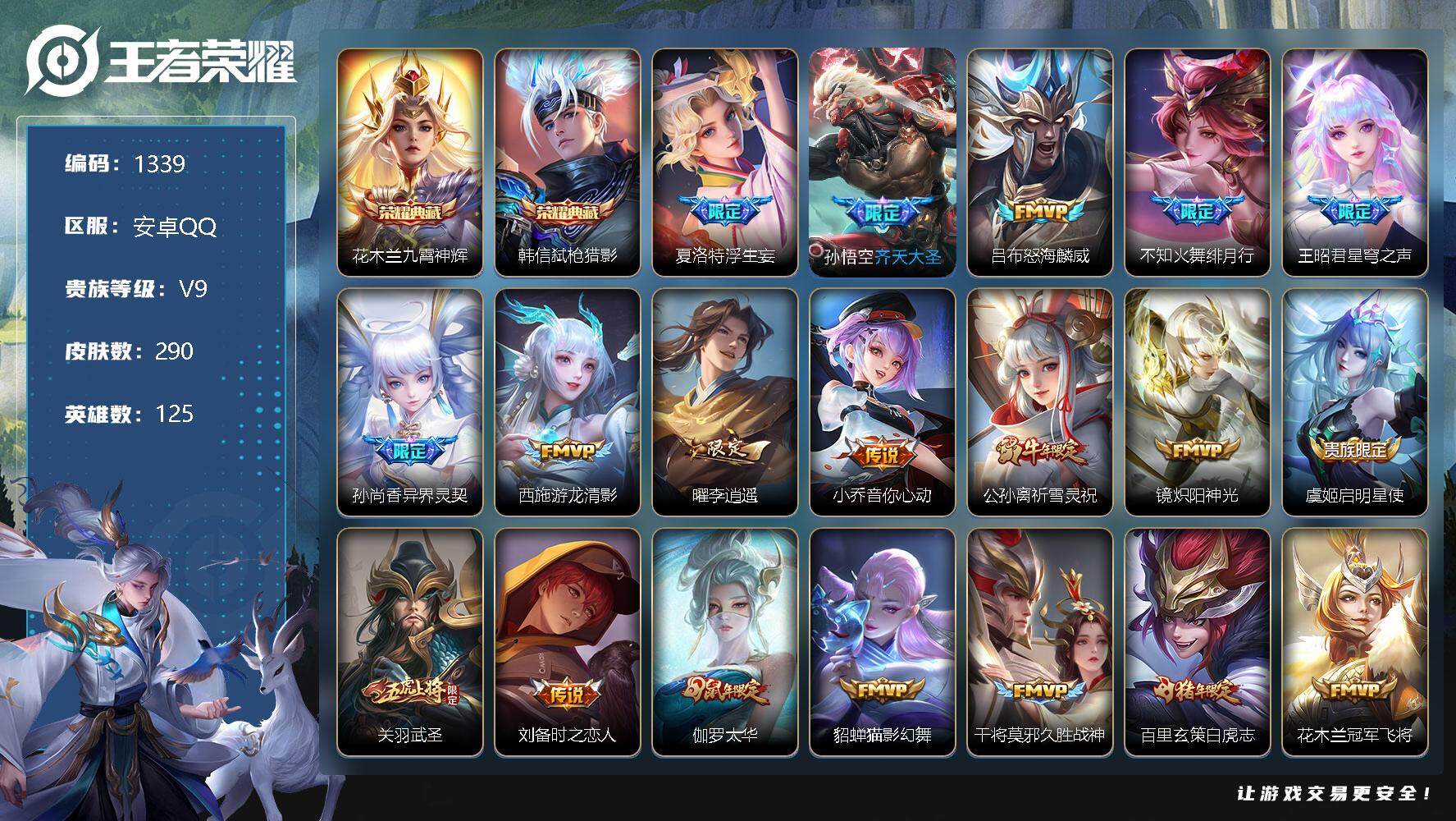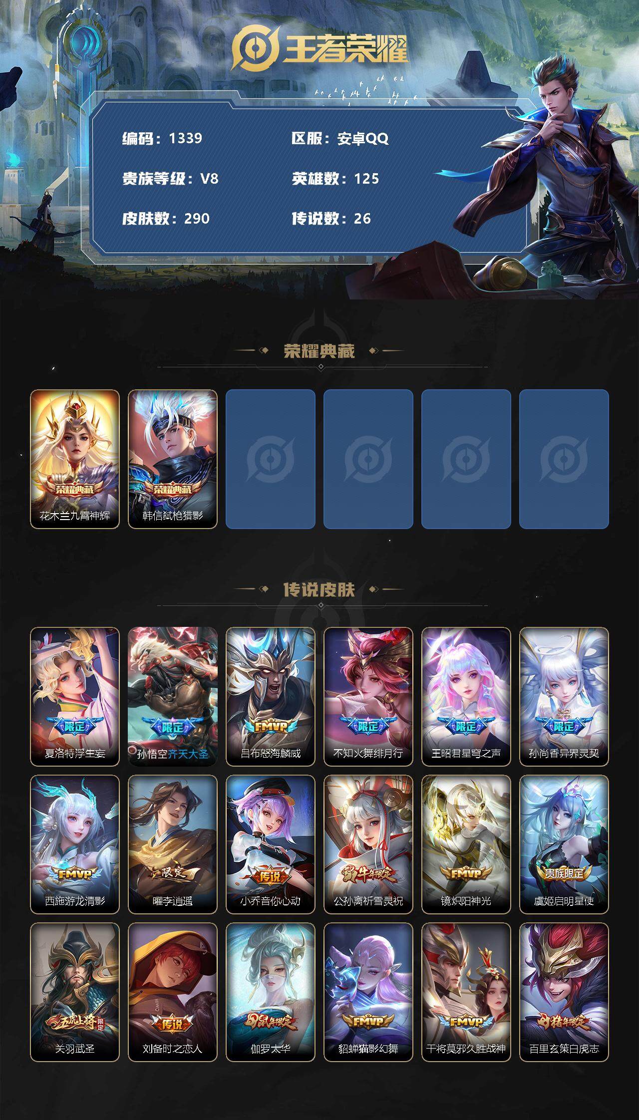 [11456428]【商品标题】:安卓Q-V8-永恒钻石I段位-125英雄-290皮肤-2典藏-0珍品无双-0无双-0珍品传说-26传说-87史诗