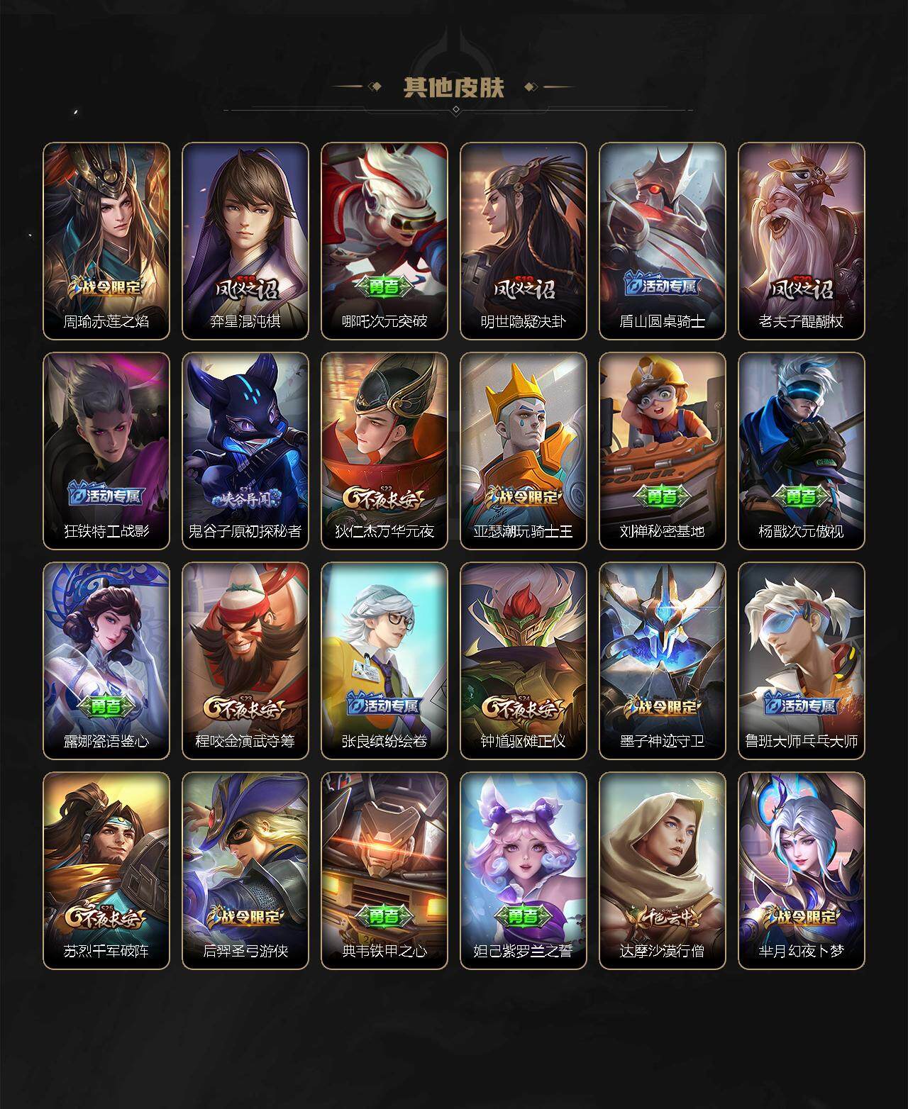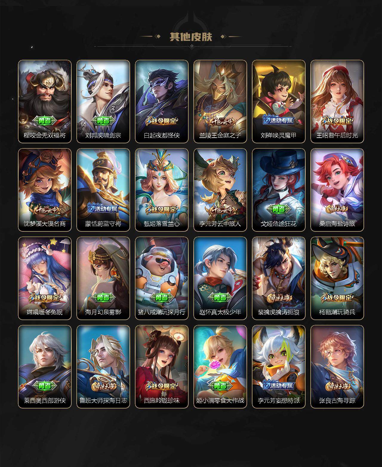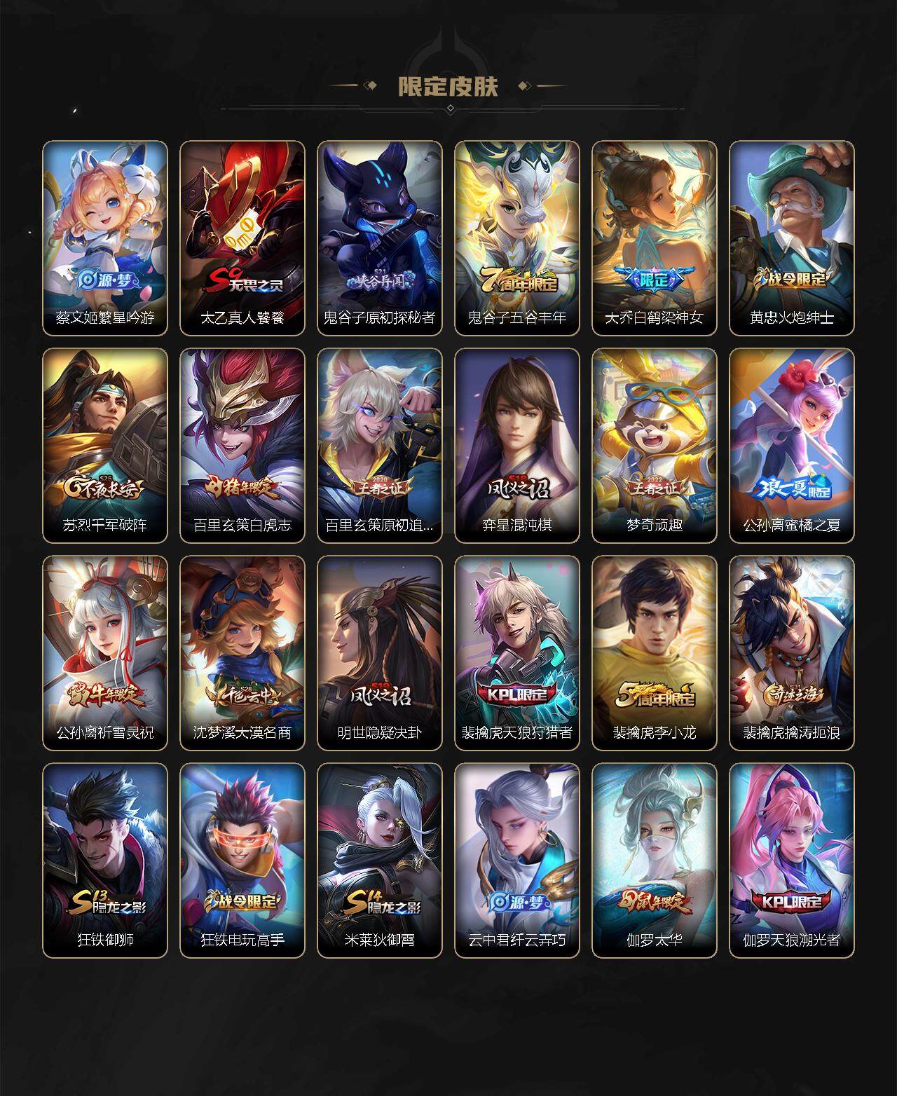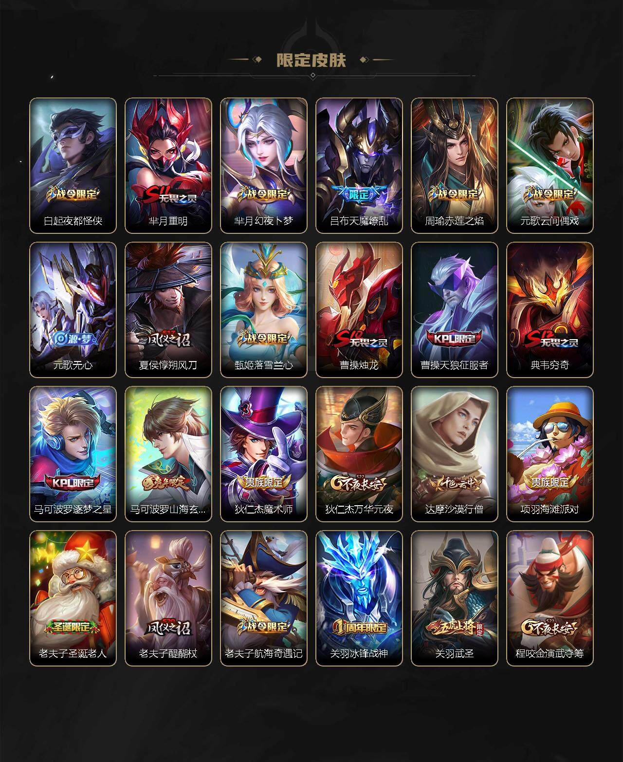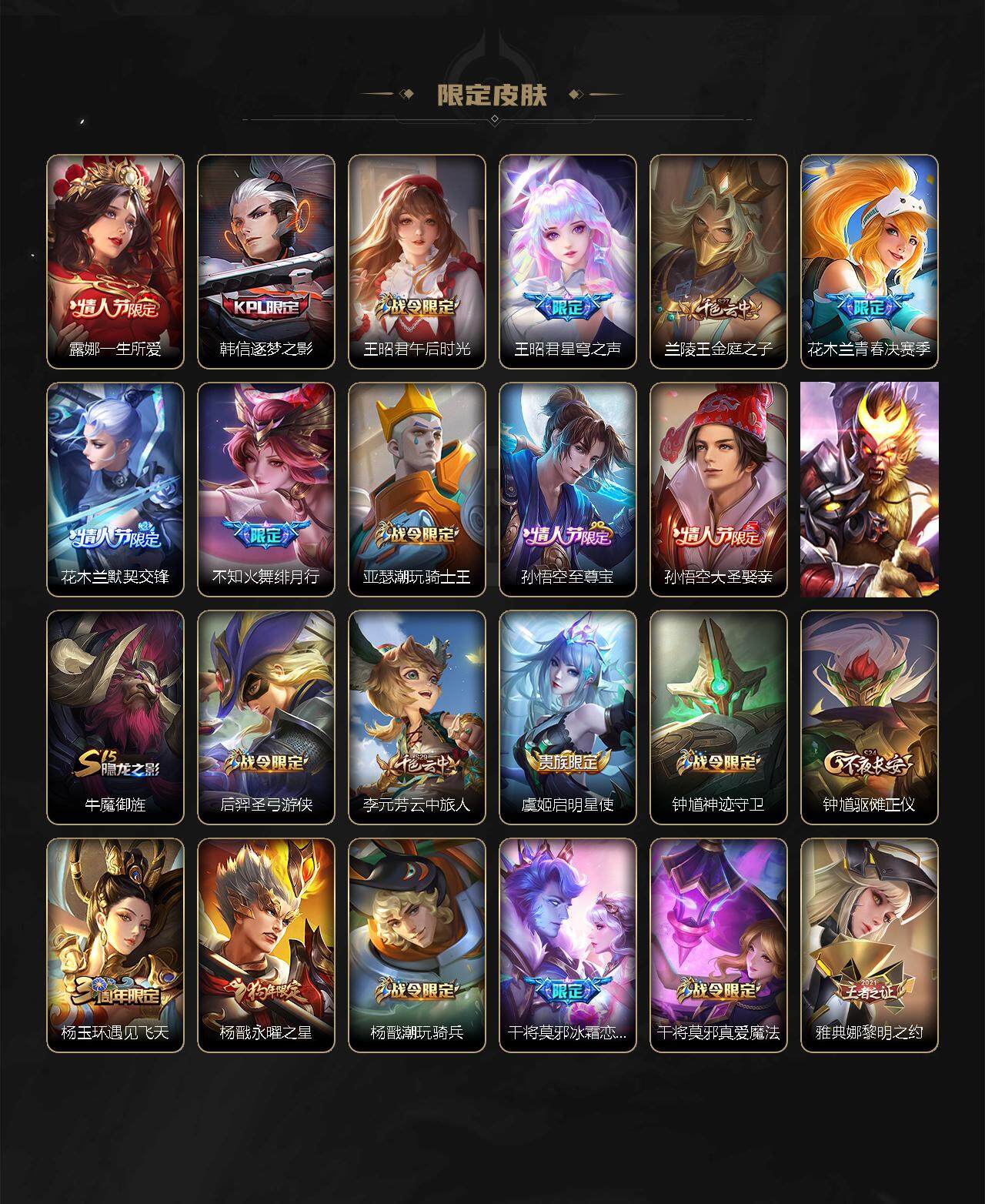 【限定皮肤】:白起狰,狄仁杰阴阳师,赵云皇家上将,赵云引擎之心,墨子神迹守卫,嬴政优雅恋人,孙尚香异界灵契,鲁班七号狮舞东方,庄周高山流水,高渐离死亡摇滚,钟无艳超时空战士,扁鹊奇幻香踪,白起夜都怪侠,芈月重明,芈月幻夜卜梦,吕布天魔缭乱,周瑜赤莲之焰,元歌云间偶戏,元歌无心,夏侯惇朔风刀,甄姬落雪兰心,曹操烛龙,曹操天狼征服者,典韦穷奇,马可波罗逐梦之星,马可波罗山海玄木吟,狄仁杰魔术师,狄仁杰万华元夜,达摩沙漠行僧,项羽海滩派对,老夫子圣诞老人,老夫子醍醐杖,老夫子航海奇遇记,关羽冰锋战神,关羽武圣,程咬金演武夺筹,露娜一生所爱,韩信逐梦之影,王昭君午后时光,王昭君星穹之声,兰陵王金庭之子,花木兰青春决赛季,花木兰默契交锋,不知火舞绯月行,亚瑟潮玩骑士王,孙悟空至尊宝,孙悟空大圣娶亲,孙悟空齐天大圣,牛魔御旌,后羿圣弓游侠,李元芳云中旅人,虞姬启明星使,钟馗神迹守卫,钟馗驱傩正仪,杨玉环遇见飞天,杨戬永曜之星,杨戬潮玩骑兵,干将莫邪冰霜恋舞曲,干将莫邪真爱魔法,雅典娜黎明之约,蔡文姬繁星吟游,太乙真人饕餮,鬼谷子原初探秘者,鬼谷子五谷丰年,大乔白鹤梁神女,黄忠火炮绅士,苏烈千军破阵,百里玄策白虎志,百里玄策原初追逐者,弈星混沌棋,梦奇顽趣,公孙离蜜橘之夏,公孙离祈雪灵祝,沈梦溪大漠名商,明世隐疑决卦,裴擒虎天狼狩猎者,裴擒虎李小龙,裴擒虎擒涛扼浪,狂铁御狮,狂铁电玩高手,米莱狄御霄,云中君纤云弄巧,伽罗太华,伽罗天狼溯光者,盾山御銮,嫦娥拒霜思,嫦娥暖冬兔眠,曜李逍遥 ,西施玲珑珍味,鲁班大师探海日志,桑启海盐诗旅,夏洛特浮生妄,暃星界游侠,戈娅驭风魔法,艾琳女武神,张良古海寻踪,蒙恬荣光圣徽,高渐离燃音魔法,