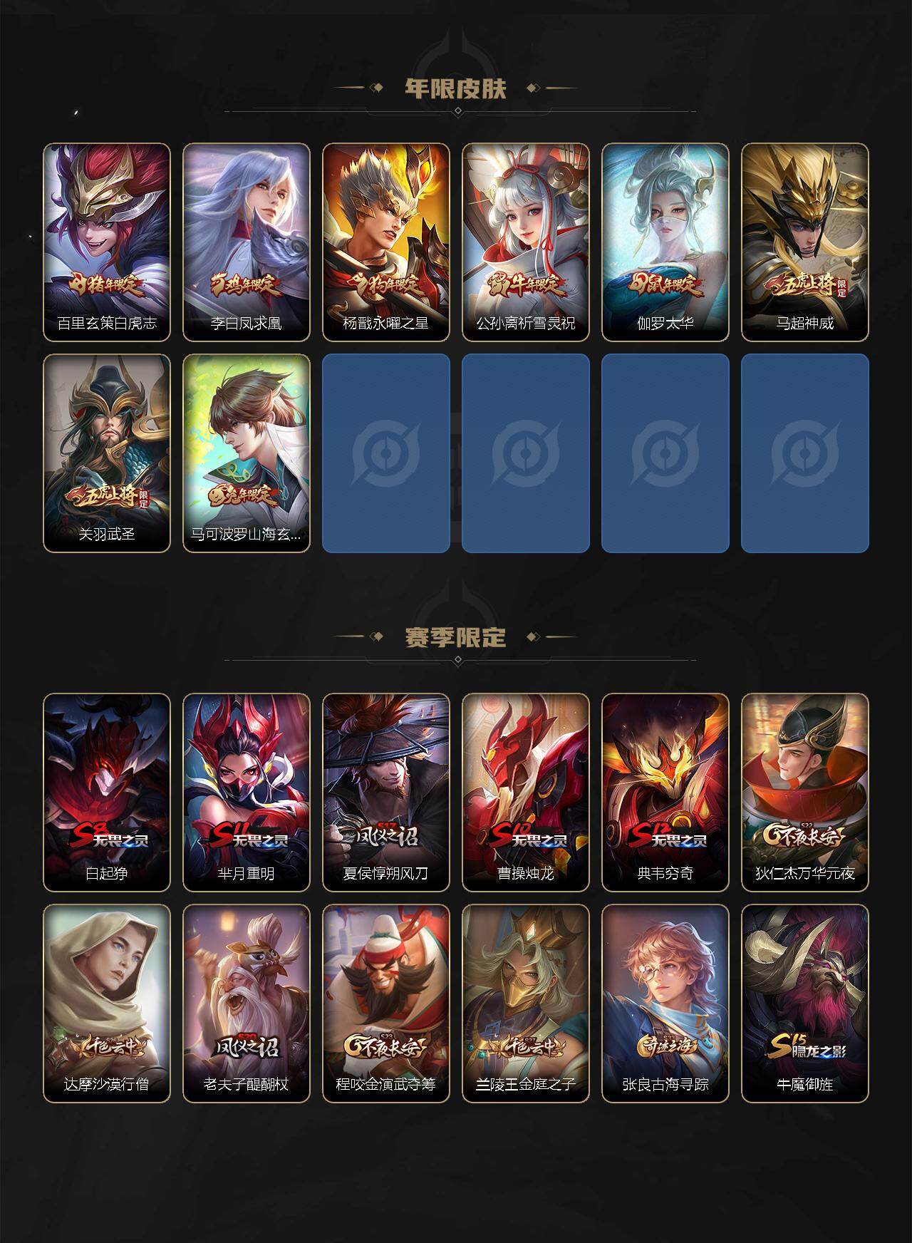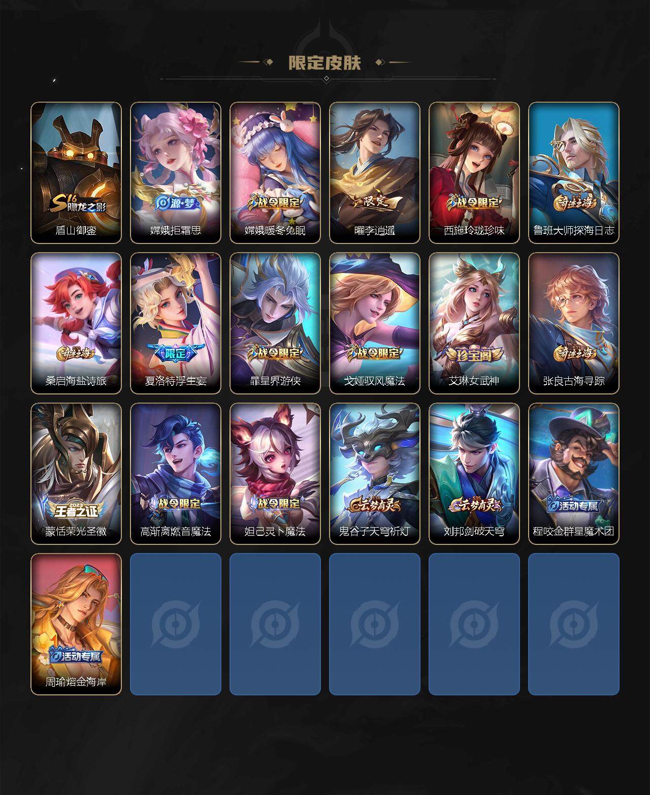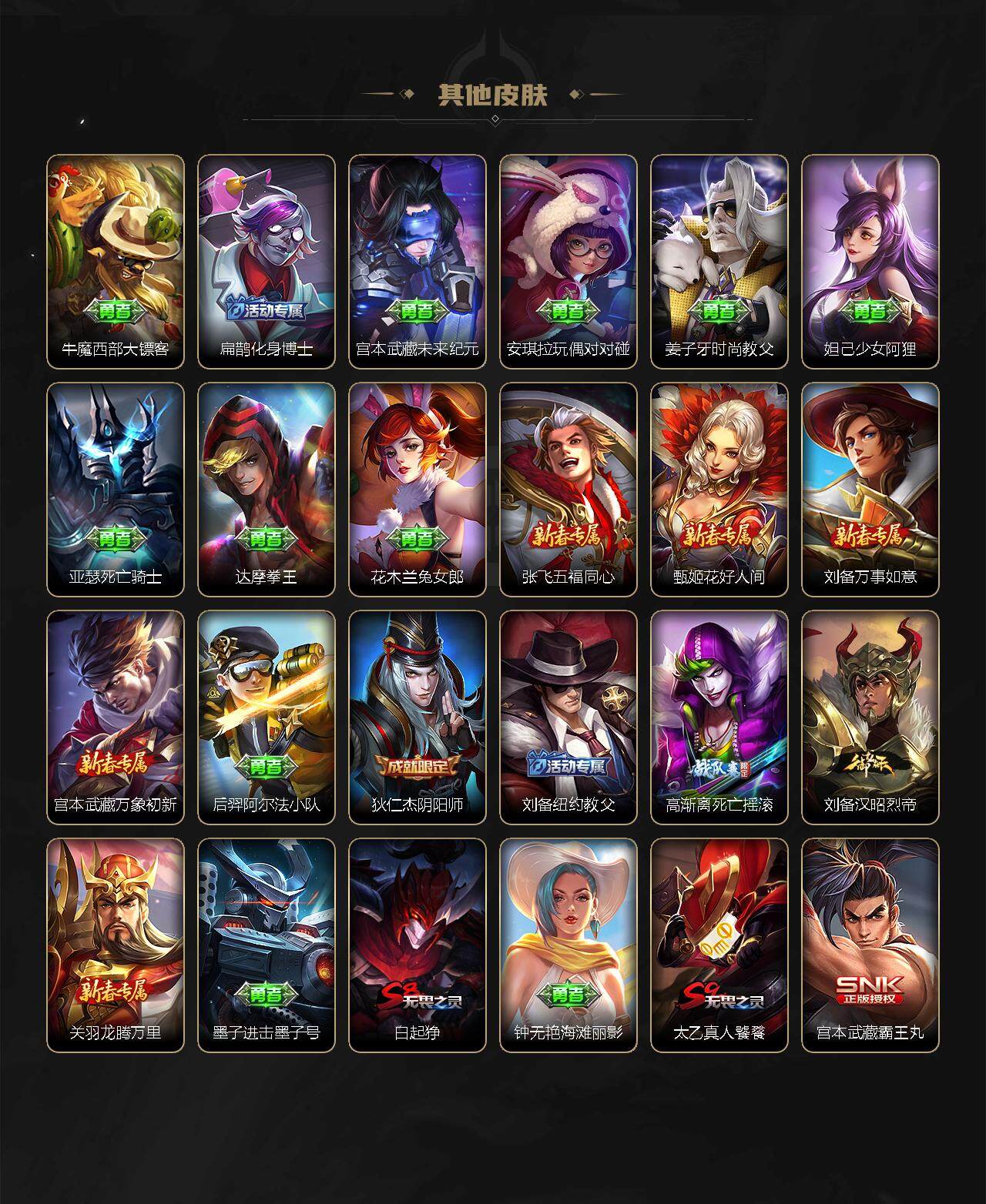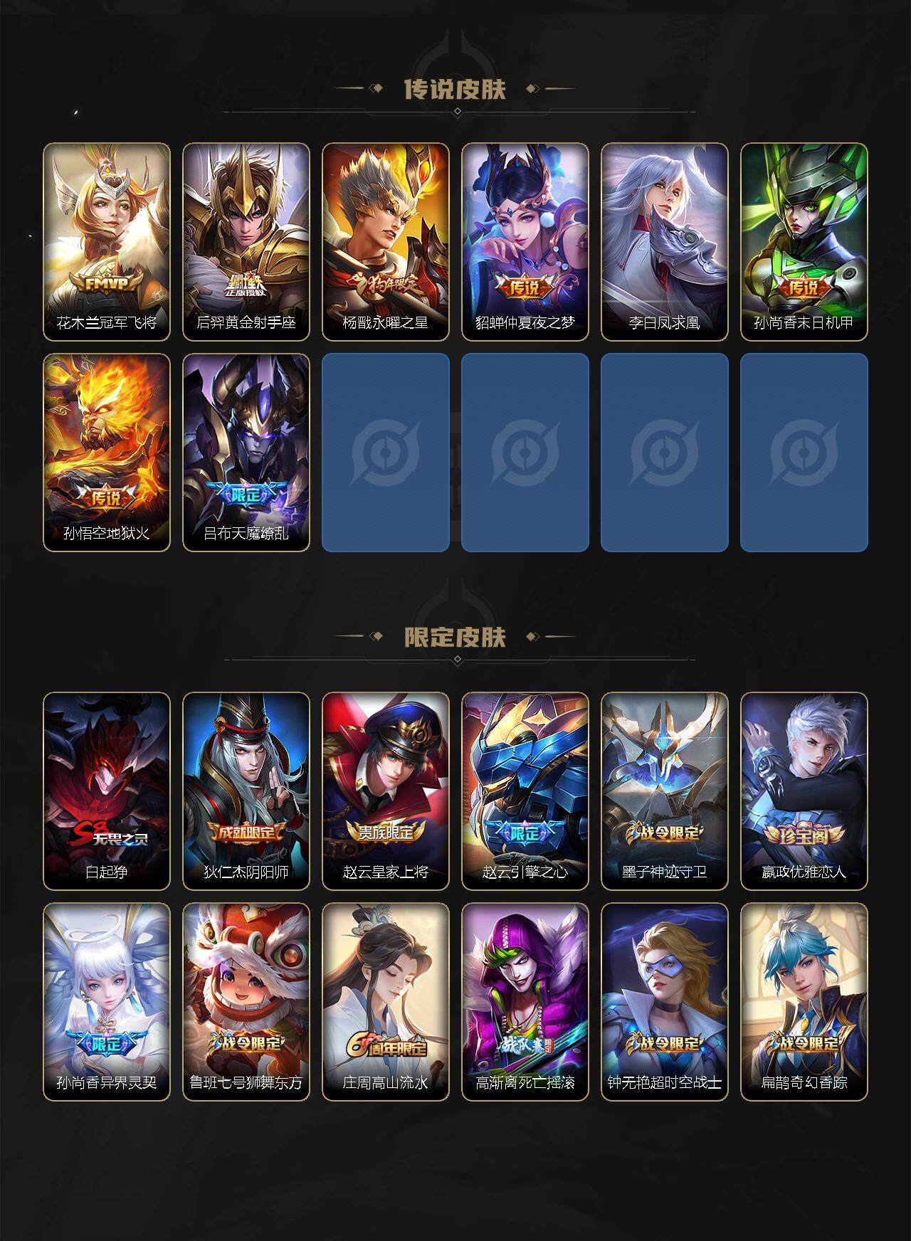 【限定皮肤】:白起狰,狄仁杰阴阳师,赵云皇家上将,赵云引擎之心,墨子神迹守卫,嬴政优雅恋人,孙尚香异界灵契,鲁班七号狮舞东方,庄周高山流水,高渐离死亡摇滚,钟无艳超时空战士,扁鹊奇幻香踪,白起夜都怪侠,芈月重明,芈月幻夜卜梦,吕布天魔缭乱,周瑜赤莲之焰,元歌云间偶戏,元歌无心,夏侯惇朔风刀,甄姬落雪兰心,曹操烛龙,曹操天狼征服者,典韦穷奇,马可波罗逐梦之星,马可波罗山海玄木吟,狄仁杰魔术师,狄仁杰万华元夜,达摩沙漠行僧,项羽海滩派对,老夫子圣诞老人,老夫子醍醐杖,老夫子航海奇遇记,关羽冰锋战神,关羽武圣,程咬金演武夺筹,露娜一生所爱,韩信逐梦之影,王昭君午后时光,王昭君星穹之声,兰陵王金庭之子,花木兰青春决赛季,花木兰默契交锋,不知火舞绯月行,亚瑟潮玩骑士王,孙悟空至尊宝,孙悟空大圣娶亲,孙悟空齐天大圣,牛魔御旌,后羿圣弓游侠,李元芳云中旅人,虞姬启明星使,钟馗神迹守卫,钟馗驱傩正仪,杨玉环遇见飞天,杨戬永曜之星,杨戬潮玩骑兵,干将莫邪冰霜恋舞曲,干将莫邪真爱魔法,雅典娜黎明之约,蔡文姬繁星吟游,太乙真人饕餮,鬼谷子原初探秘者,鬼谷子五谷丰年,大乔白鹤梁神女,黄忠火炮绅士,苏烈千军破阵,百里玄策白虎志,百里玄策原初追逐者,弈星混沌棋,梦奇顽趣,公孙离蜜橘之夏,公孙离祈雪灵祝,沈梦溪大漠名商,明世隐疑决卦,裴擒虎天狼狩猎者,裴擒虎李小龙,裴擒虎擒涛扼浪,狂铁御狮,狂铁电玩高手,米莱狄御霄,云中君纤云弄巧,伽罗太华,伽罗天狼溯光者,盾山御銮,嫦娥拒霜思,嫦娥暖冬兔眠,曜李逍遥 ,西施玲珑珍味,鲁班大师探海日志,桑启海盐诗旅,夏洛特浮生妄,暃星界游侠,戈娅驭风魔法,艾琳女武神,张良古海寻踪,蒙恬荣光圣徽,高渐离燃音魔法,