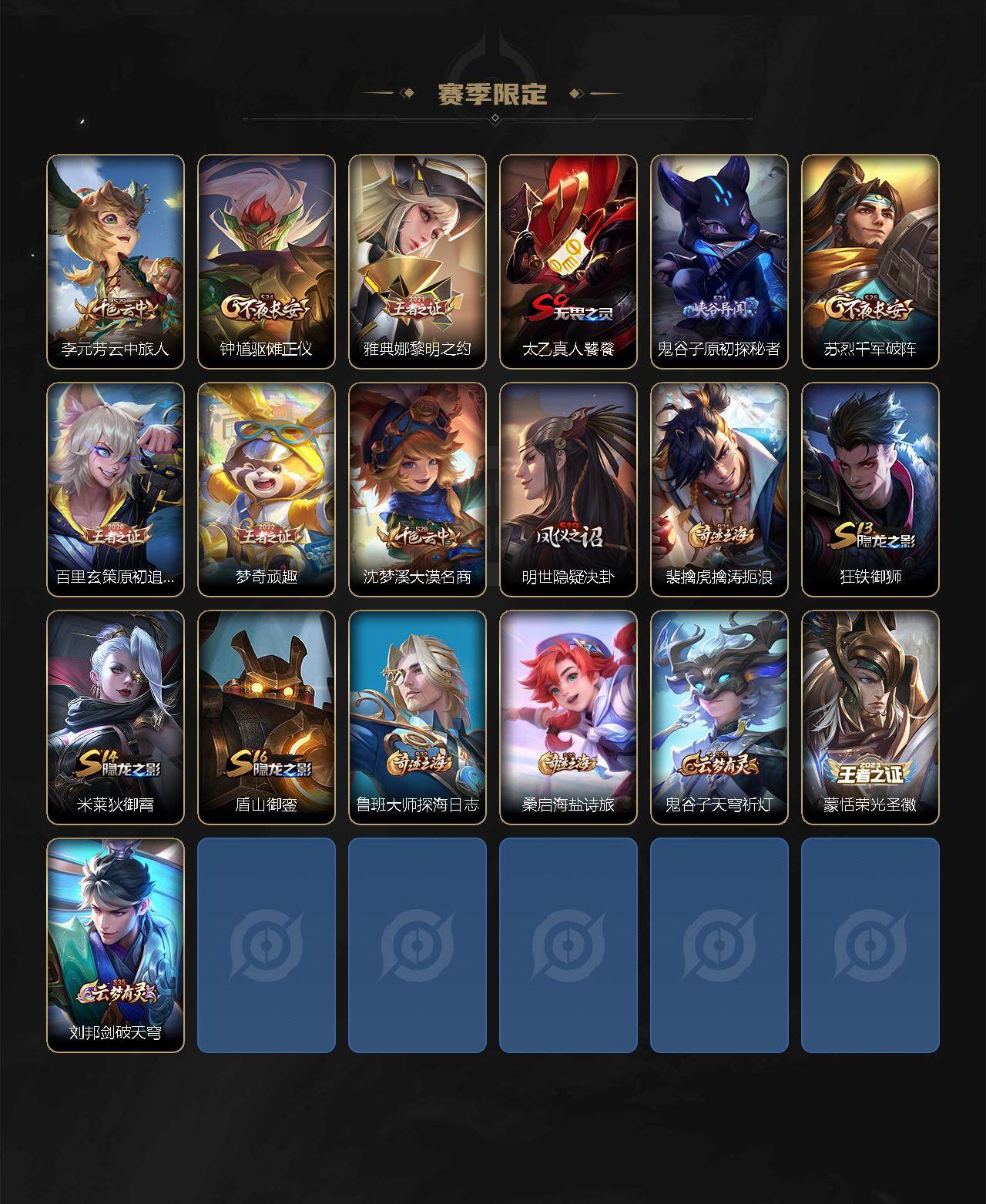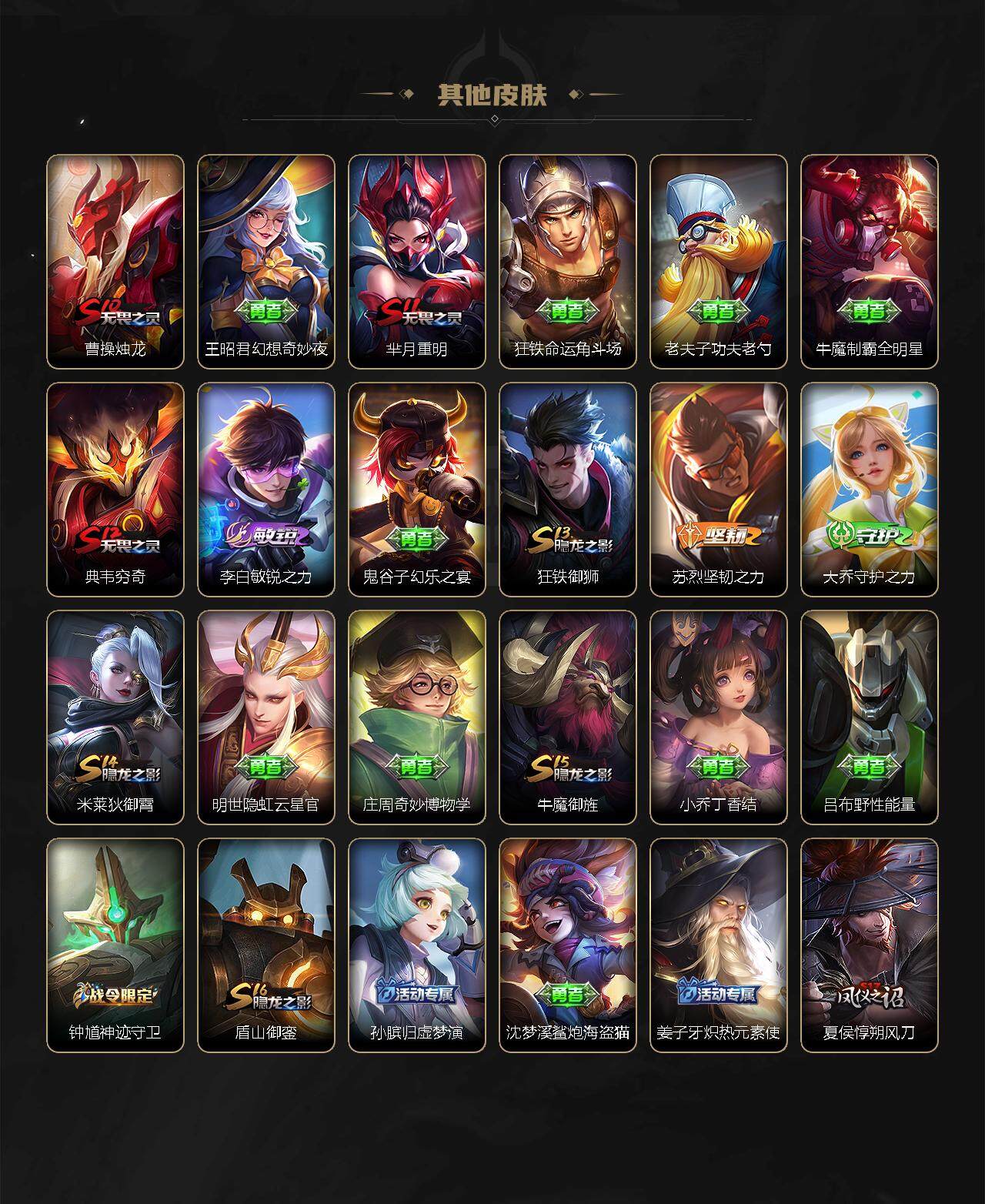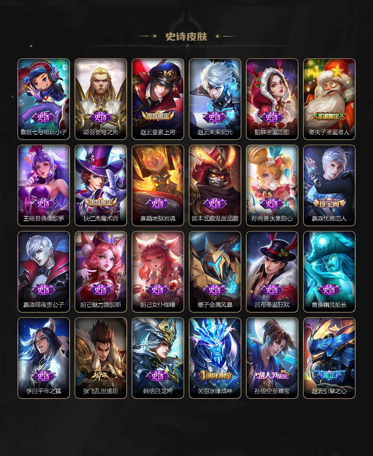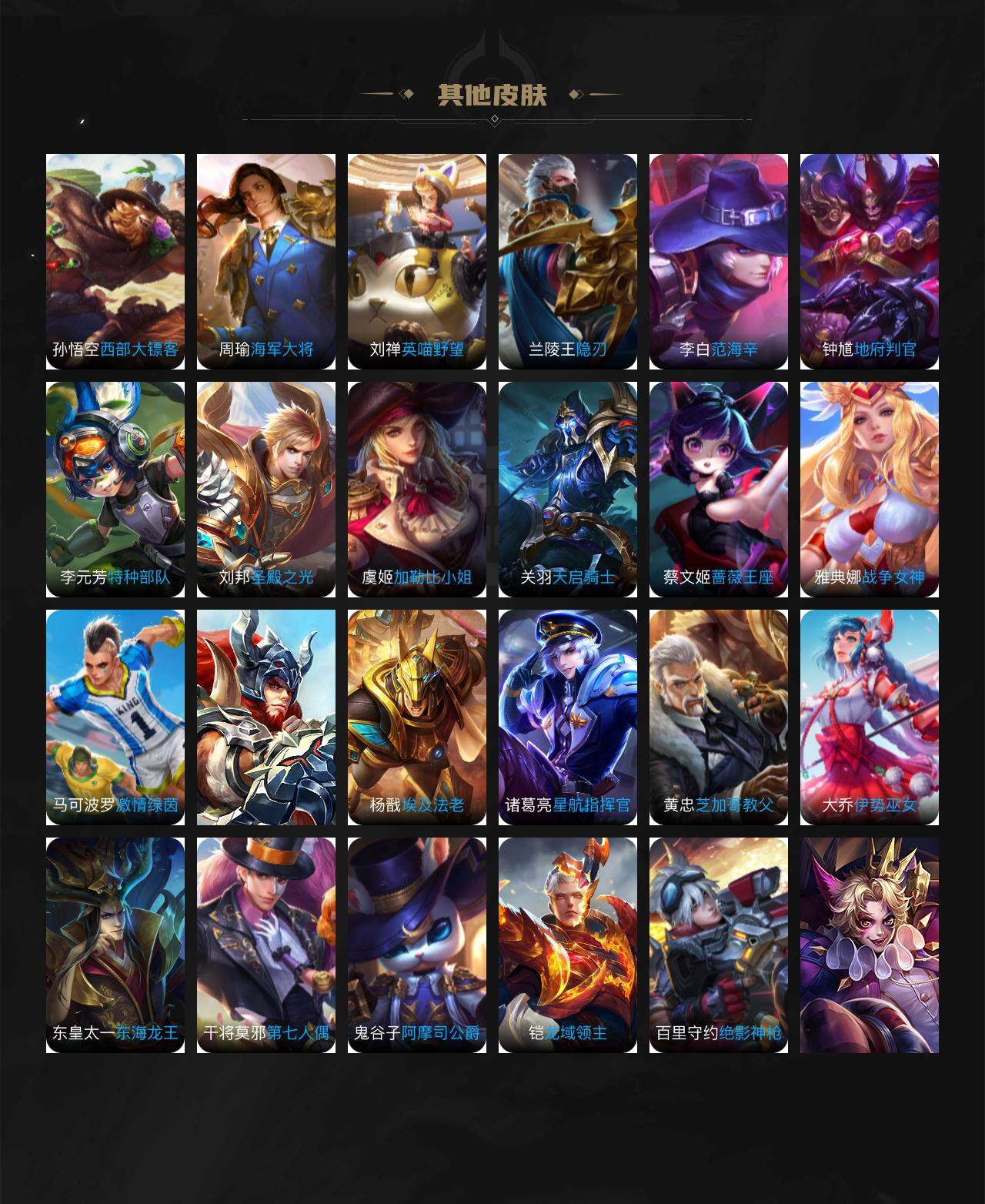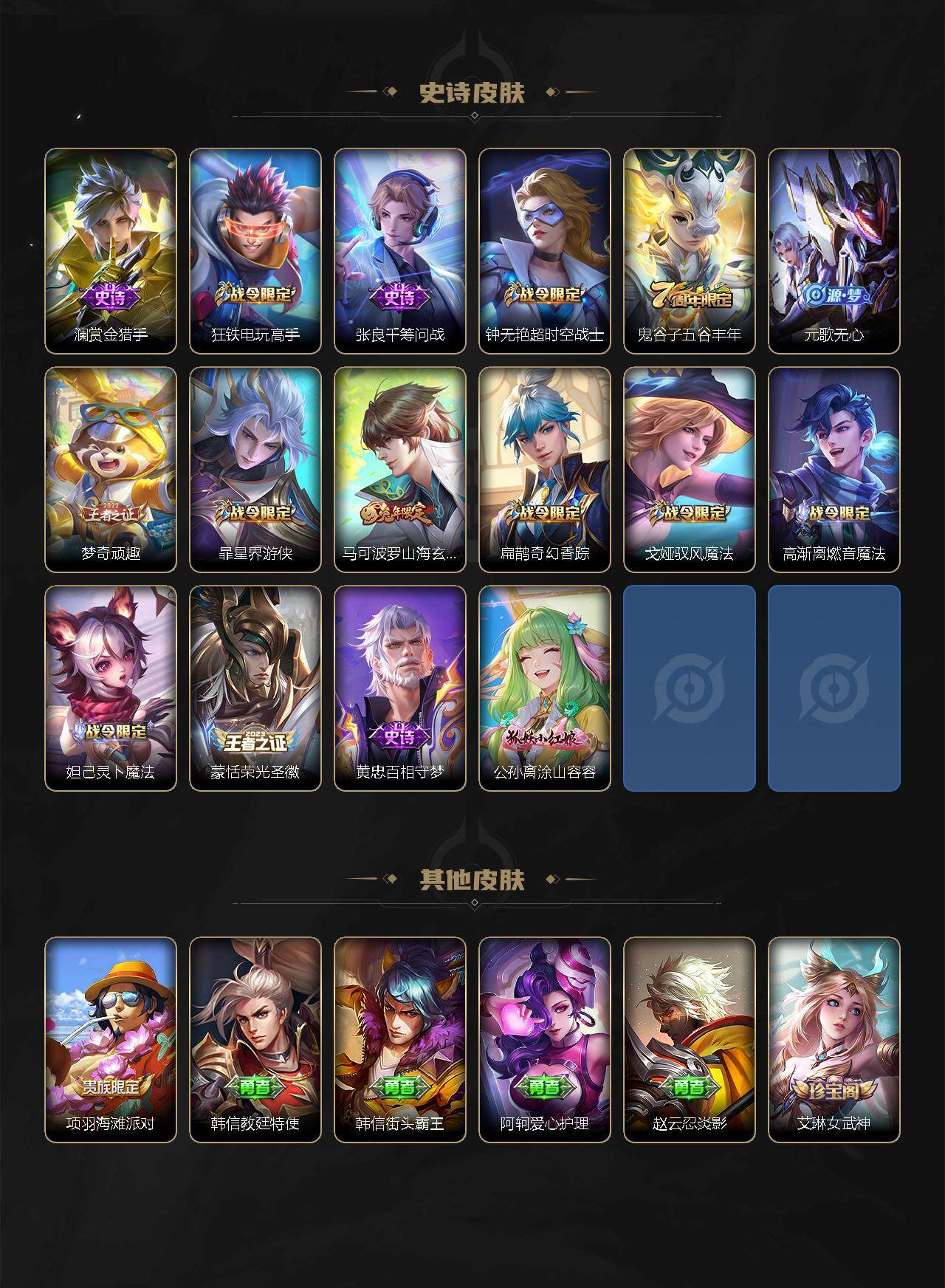 【限定皮肤】:白起狰,狄仁杰阴阳师,赵云皇家上将,赵云引擎之心,墨子神迹守卫,嬴政优雅恋人,孙尚香异界灵契,鲁班七号狮舞东方,庄周高山流水,高渐离死亡摇滚,钟无艳超时空战士,扁鹊奇幻香踪,白起夜都怪侠,芈月重明,芈月幻夜卜梦,吕布天魔缭乱,周瑜赤莲之焰,元歌云间偶戏,元歌无心,夏侯惇朔风刀,甄姬落雪兰心,曹操烛龙,曹操天狼征服者,典韦穷奇,马可波罗逐梦之星,马可波罗山海玄木吟,狄仁杰魔术师,狄仁杰万华元夜,达摩沙漠行僧,项羽海滩派对,老夫子圣诞老人,老夫子醍醐杖,老夫子航海奇遇记,关羽冰锋战神,关羽武圣,程咬金演武夺筹,露娜一生所爱,韩信逐梦之影,王昭君午后时光,王昭君星穹之声,兰陵王金庭之子,花木兰青春决赛季,花木兰默契交锋,不知火舞绯月行,亚瑟潮玩骑士王,孙悟空至尊宝,孙悟空大圣娶亲,孙悟空齐天大圣,牛魔御旌,后羿圣弓游侠,李元芳云中旅人,虞姬启明星使,钟馗神迹守卫,钟馗驱傩正仪,杨玉环遇见飞天,杨戬永曜之星,杨戬潮玩骑兵,干将莫邪冰霜恋舞曲,干将莫邪真爱魔法,雅典娜黎明之约,蔡文姬繁星吟游,太乙真人饕餮,鬼谷子原初探秘者,鬼谷子五谷丰年,大乔白鹤梁神女,黄忠火炮绅士,苏烈千军破阵,百里玄策白虎志,百里玄策原初追逐者,弈星混沌棋,梦奇顽趣,公孙离蜜橘之夏,公孙离祈雪灵祝,沈梦溪大漠名商,明世隐疑决卦,裴擒虎天狼狩猎者,裴擒虎李小龙,裴擒虎擒涛扼浪,狂铁御狮,狂铁电玩高手,米莱狄御霄,云中君纤云弄巧,伽罗太华,伽罗天狼溯光者,盾山御銮,嫦娥拒霜思,嫦娥暖冬兔眠,曜李逍遥 ,西施玲珑珍味,鲁班大师探海日志,桑启海盐诗旅,夏洛特浮生妄,暃星界游侠,戈娅驭风魔法,艾琳女武神,张良古海寻踪,蒙恬荣光圣徽,高渐离燃音魔法,